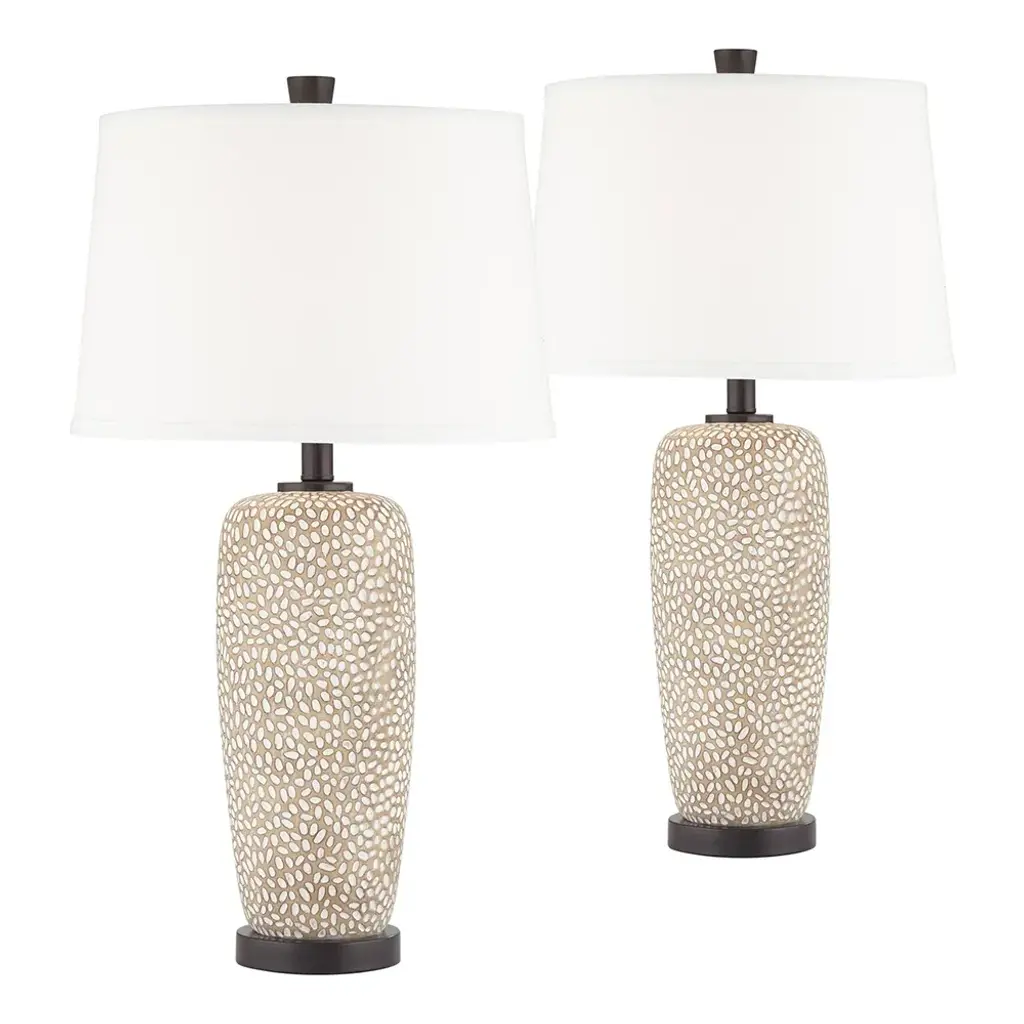PRODUCT DETAILS: Set of 2 table lamps. Each is 27 1/4" high overall. Base at very bottom is 5"wide. Shades are 13" across the top x 15" wide across the bottom x 10" high. Weigh 11.44 lbs. Each uses one maximum 150 watt standard-medium base bulb (not included). On-off socket switches. Anna table lamps set from the 360 Lighting brand. A elegant design look for a modern or coastal style room. Beige finish with a pebbled pattern. Bronze finish accents. Cast resin construction. White tapered drum shades. 8-foot long brown cords. DESCRIPTION: Brighten your decor with this lamp set from the 360 Lighting brand. Each lamp features an elegant look that's ideal for a modern or coastal style room. They have a beige finish base and are topped by a white tapered drum shade.