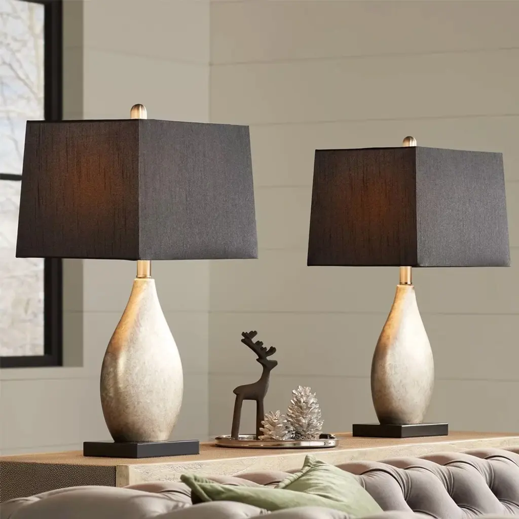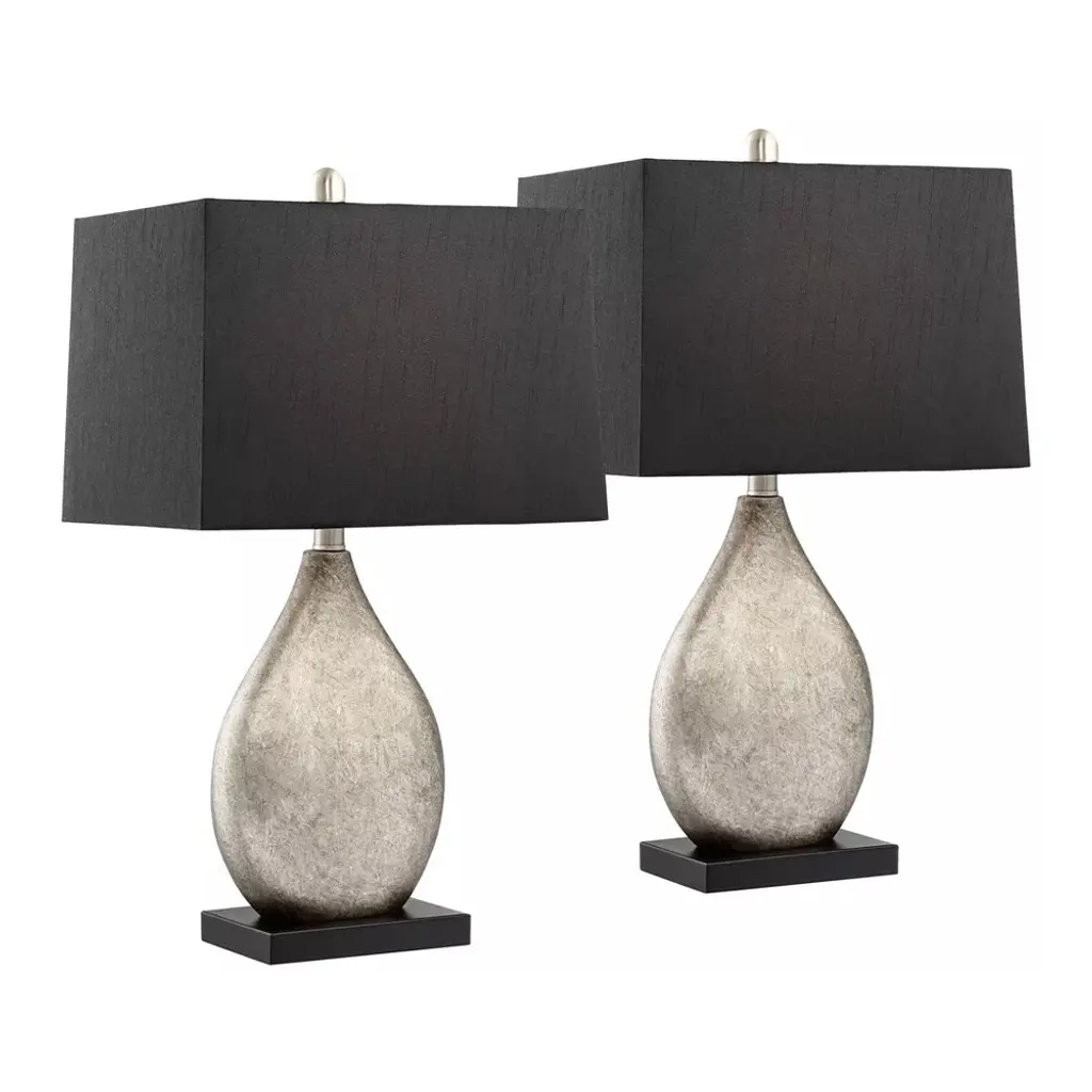 PRODUCT DETAILS: Set of 2 lamps. Each is 25" high overall. Rectangular shades are 13" wide, 11" deep at the top x 14" wide, 11" deep at the bottom x 9 1/2" high. Lamps use one maximum 100 watt standard-medium base bulb (not included). On-off switches. Dramatic styling inspired by by Art Deco and modern designs. Silver luxe finish. Cast resin construction. Silver finish metal accents. Black fabric rectangular lamp shades. 7-foot long cords.