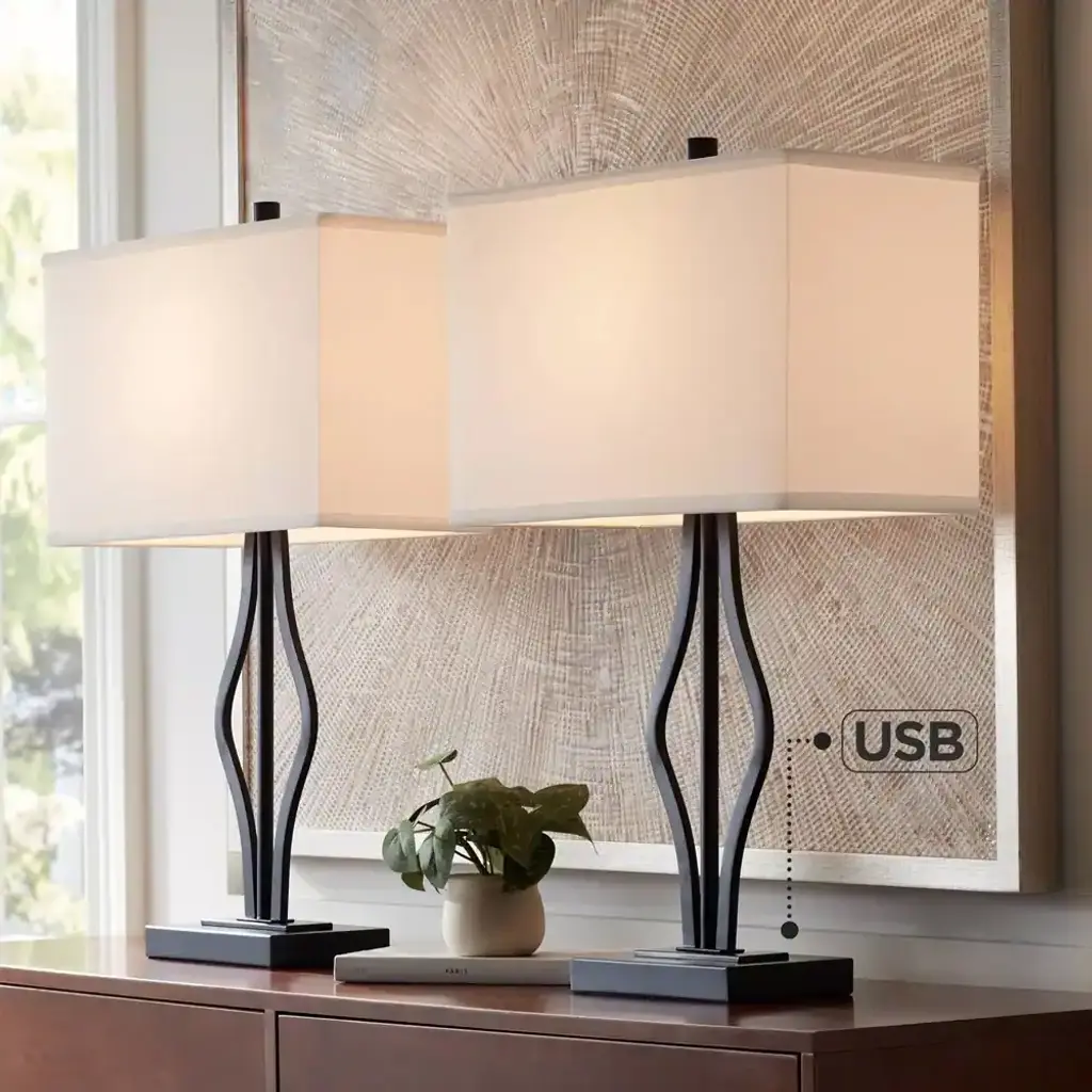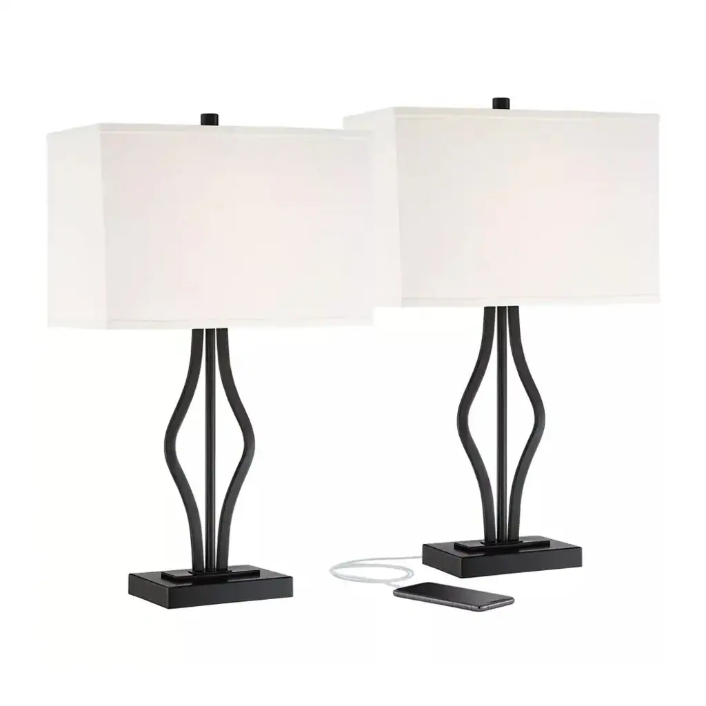 PRODUCT DETAILS: Set of 2 USB lamps. Each is 26 1/2" high overall. Rectangular shades are 16" wide x 8" deep x 10 1/2" high. Lamps each use one maximum 100 watt standard-medium base bulb (not included). On-off socket switches. Modern metal USB table lamps set. From the 360 Lighting brand. Built-in USB port on each base allows you to easily charge smart phones and more. Black finish bases. Metal construction. Rectangular fabric shades. 7-foot long cords.