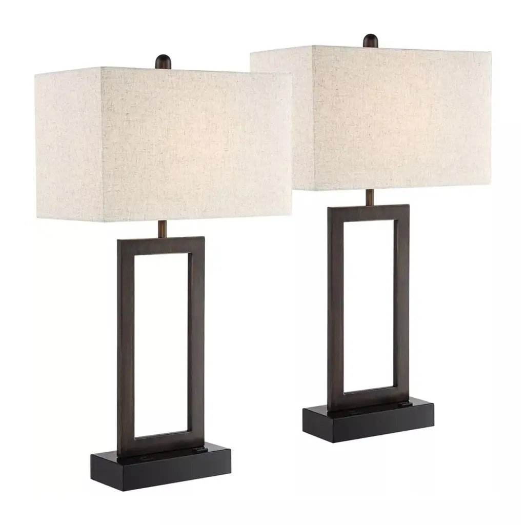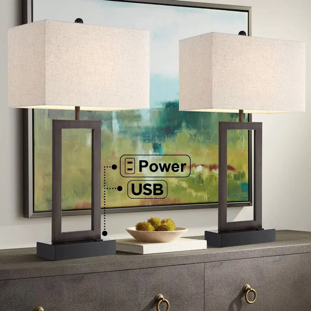 PRODUCT DETAILS: Set of 2 lamps. Each is 30" high overall. Bottom bases are 9" wide x 4 1/2" deep. Rectangular shades are 16" wide x 9" deep x 10 1/2" high. Weighs 3.1 lbs. each. Each uses one maximum 100 watt standard-medium base bulb (not included). On-off socket switches. Set of two modern metal table lamps with USB port and outlet from the Todd collection by 360 Lighting. Bronze finish open base. Black finish pedestal at very bottom. Metal construction. Rectangular oatmeal fabric lamp shade. Built-in 2 amp USB port and an electrical outlet on the base for charging smart phones and other devices. 8-foot long brown cord and plug.