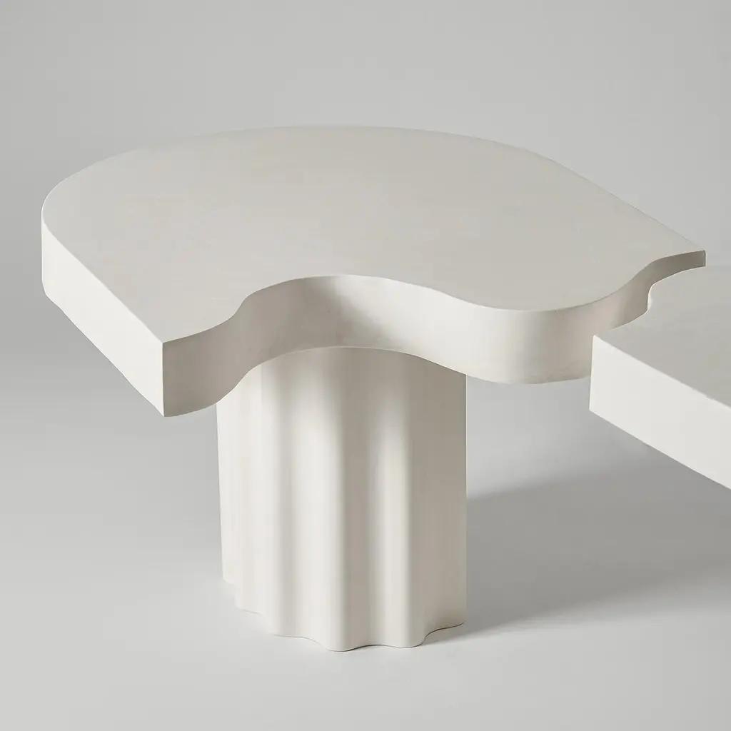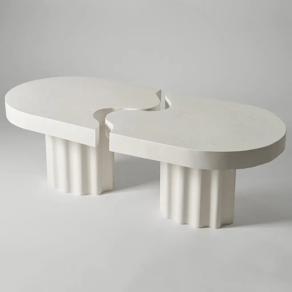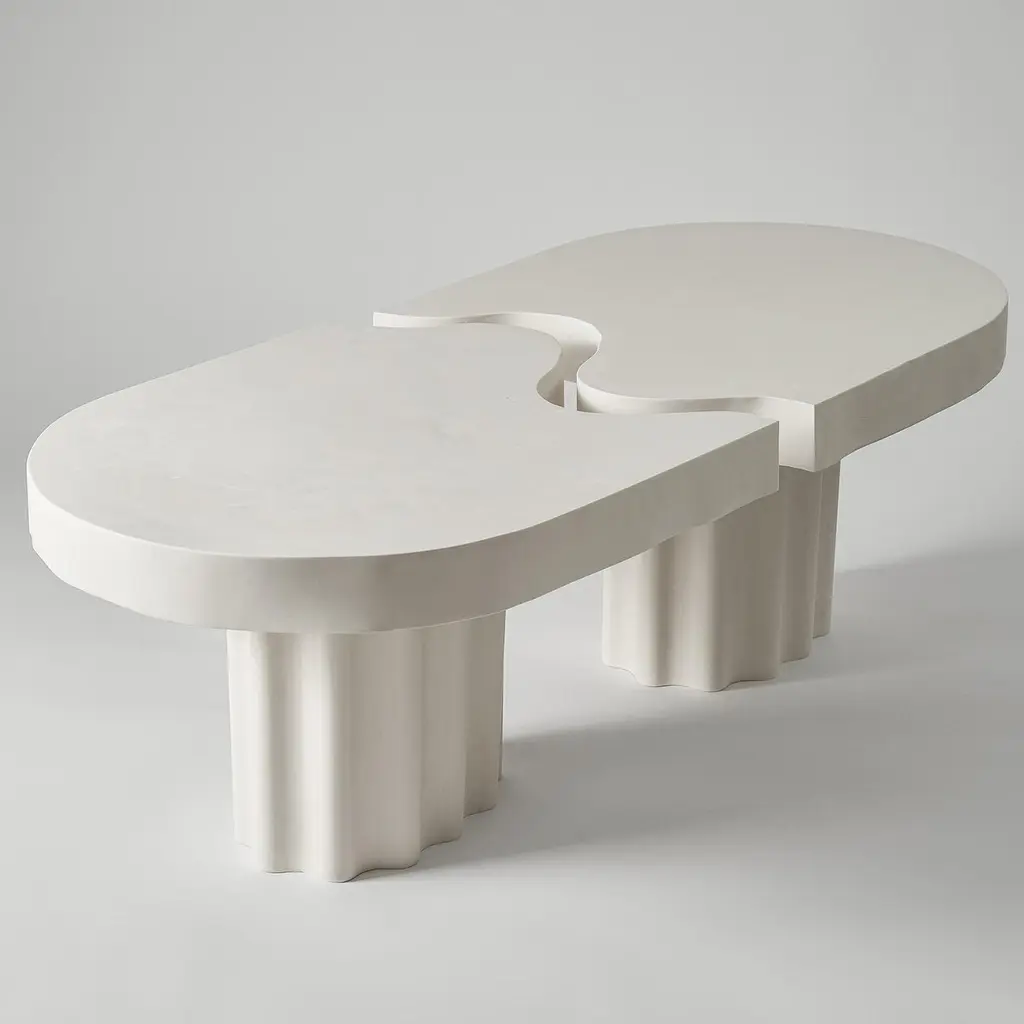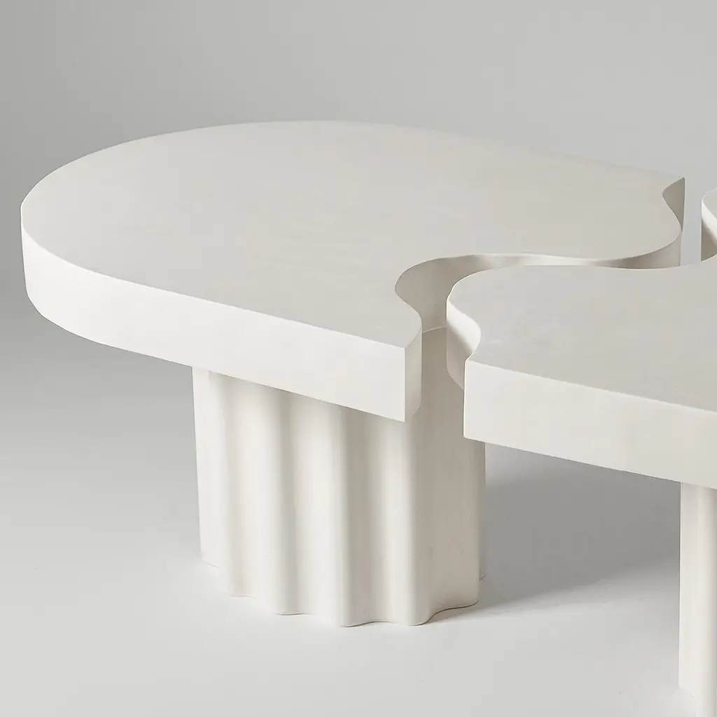 Set of 2 Puzzle No. 1 Coffee Tables by PerlerDimensions: One table: D 58 x W 67 x H 40 cm.Both tables: D 58 x W 120 x H 40 cm.Materials: Jesmonite.Weight of a single table: 15-20 kg.The height of these tables is customizable. Please contact us.The PUZZLES set of white coffee tables from the Waves collection is aptly named for its wavy, interlocking shapes. Comprising two modules, they seamlessly merge to form an oval whole measuring 120x56 cm. Each table showcases a flowing edge that sharpens at its extremities. In contrast, the white legs resemble a consistently undulating wave, culminating in an elliptical form. These modules stand firmly on their own, suitable not just as a pair but as separate side tables or smaller coffee tables. Crafted entirely by hand, they're made of polymer gypsum known for its sturdiness, durability, and sculptural appearance. A special trait of this material is its capability to produce distinct patterns with subtle tonal transitions between white, beige, and ivory. Given their artistic nature and handmade origin, each set will have slight variations in edge curvature and tabletop designs.This duo of wavy coffee tables isn't merely beautiful, unique art pieces but also practical furniture that allows for diverse interior arrangements. When joined, they offer a tabletop length of roughly 120 cm and a width of 56 cm. Individually, a module spans 56 cm in width and 67 cm in length (from edge to wave). The elongated, elliptical form of the legs also ensures the tables offer varied visuals from different viewpoints.This space was created for individuals who, like me, appreciate originality, artistic objects, art, and design. Here, you’ll find more than just inspiration and advice – it’s a destination for applied art, featuring original designer furniture and artist-signed collections. You can find limited collections of tables, lamps, vases, and bas-reliefs, created exclusively for the Perler Design brand, in the design shop section (soon).I established this space immediately following my initial visit to the Milan Interior Fair. Although my love for design began much earlier, this event served as the catalyst for my action. In 2016, I launched my interior design blog where I continue to share monochrome spaces, interior design tips, and reports from industry events.A few years into blogging, my greatest dream was realized – the website expanded to include an online store featuring my unique furniture designs such as coffee tables, side tables, and table sets.Today, our offerings also encompass applied art objects crafted by artists. Sculptors, ceramists, graphic artists, and individuals engaged in artistic glass production design and create limited collections dedicated to the Perler Design brand. These include reliefs, glass and ceramic vases, and table lamps.These designs will beautifully complement various interior styles, including Parisian, Scandinavian, vintage, eclectic, and New York.