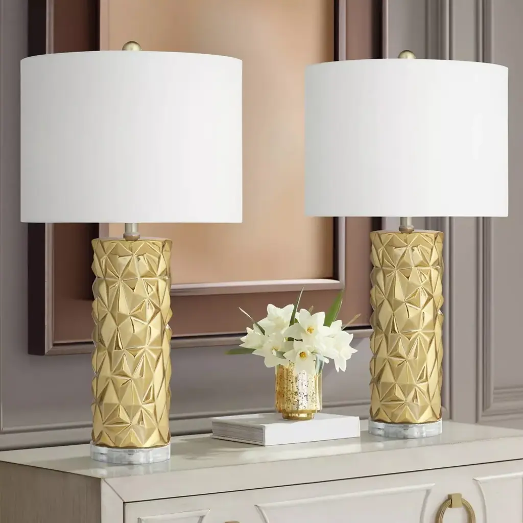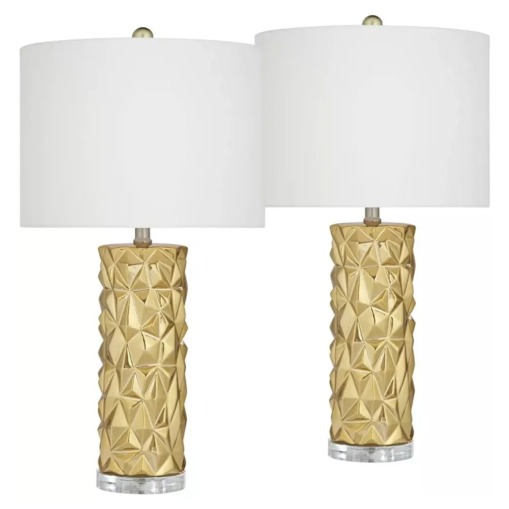 PRODUCT DETAILS: Set of 2 table lamps. Each is 26 1/2" high overall. Bases are 5" wide. Shades are 13 3/4" wide at the top and bottom x 9 7/8" high. Weigh 11 lbs. Lamps each use one maximum 150 watt standard-medium base Type-A light bulb (not included). On-off socket switches. Modern gold ceramic table lamps. A great look for a modern bedroom or living room. Textured, diamond pattern ceramic lamp bases in a gold glaze finish. White fabric tapered drum shades. 8-foot long clear cords.