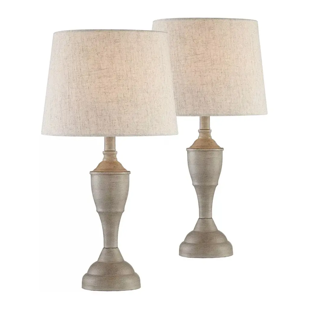 PRODUCT DETAILS: Set of 2 lamps. Each is 21" high overall. Bottom bases are 5" wide. Shades are 10" wide at the top x 11 3/4" wide at the bottom x 9" high. Weigh 6.6 lbs. Use one maximum 100 watt standard-medium base E26 bulb (not included). On-off switches on sockets. Claude set of two rustic metal accent table lamps from the 360 Lighting brand. Ideal for farmhouse or traditional cottage decorating. Beige washed finish bases with a classic urn profile. Metal construction. Beige linen tapered drum shades. 8-foot long brown cords.