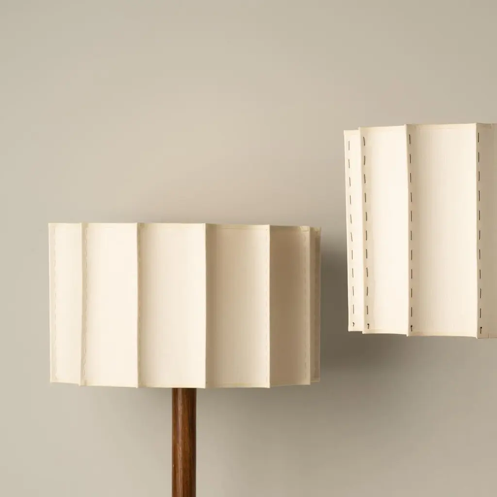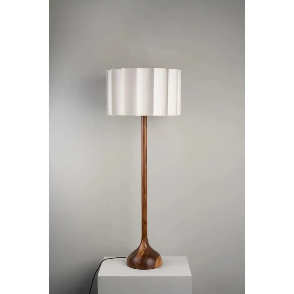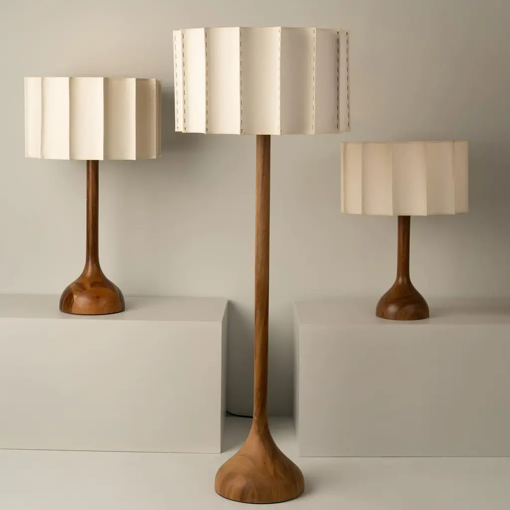 Set of 2 Sculptural Elephant Leg Parota Wood Lamps by Isabel MoncadaDimensions: Floor Lamp: Ø 55 x H 150 cm.Small Table Lamp: Ø 40 x H 70 cm.Materials: Turned parota wood base and fabric-lined lampshade with fiberglass and polystyrene.Named Pata de Elefante –Elephant‘s Foot– for the prominent shape at its base. Separated by a long stem is its ornamental, wavy and handmade lampshade. This combination achieves a balanced proportion. It is a floor lamp with a long, slender stem that drifts loosely on a voluptuous base and its regal shade fills the space with warm, abundant light. A charming table lamp, its base is like a drop of wax that melts and rests on the floor and its fluted shade is harmonious and wide.All our lamps can be wired according to each country. If sold to the USA it will be wired for the USA for instance. Please contact us. Isabel Moncada is a Mexican designer specialized in lighting.By exploring and finessing traditional manufacturing techniques, Isabel has developed her own mechanisms and transformed materials to improve her designs as well as carve out her personal style.