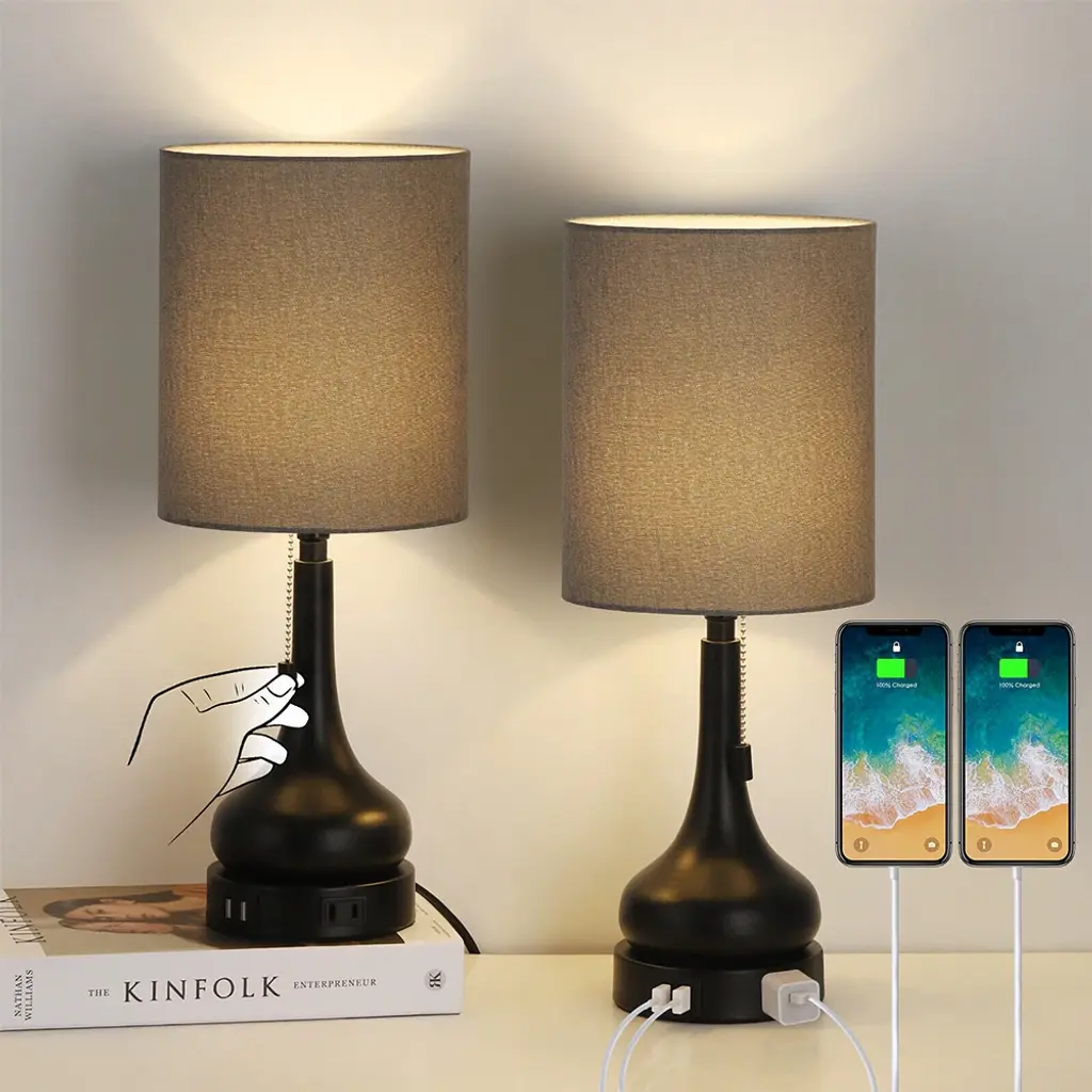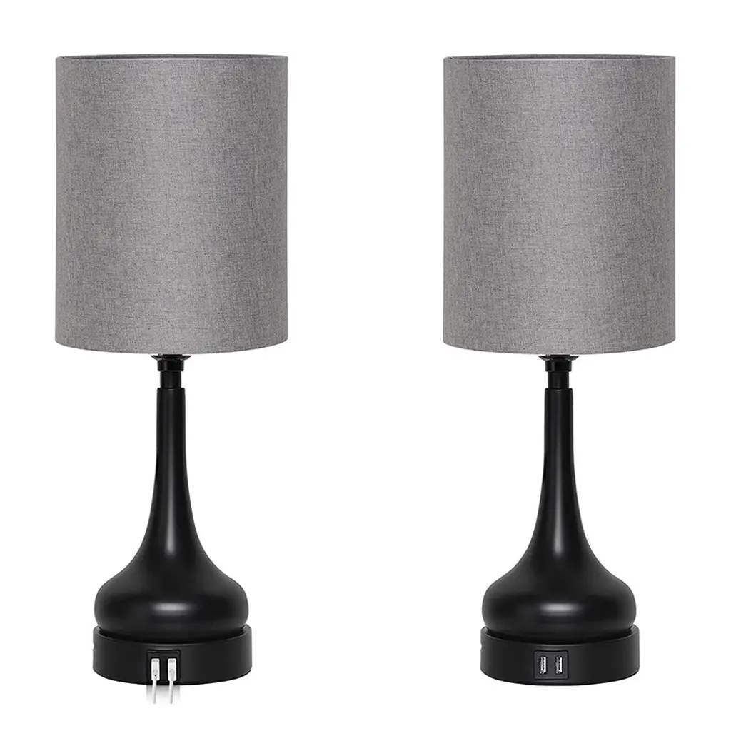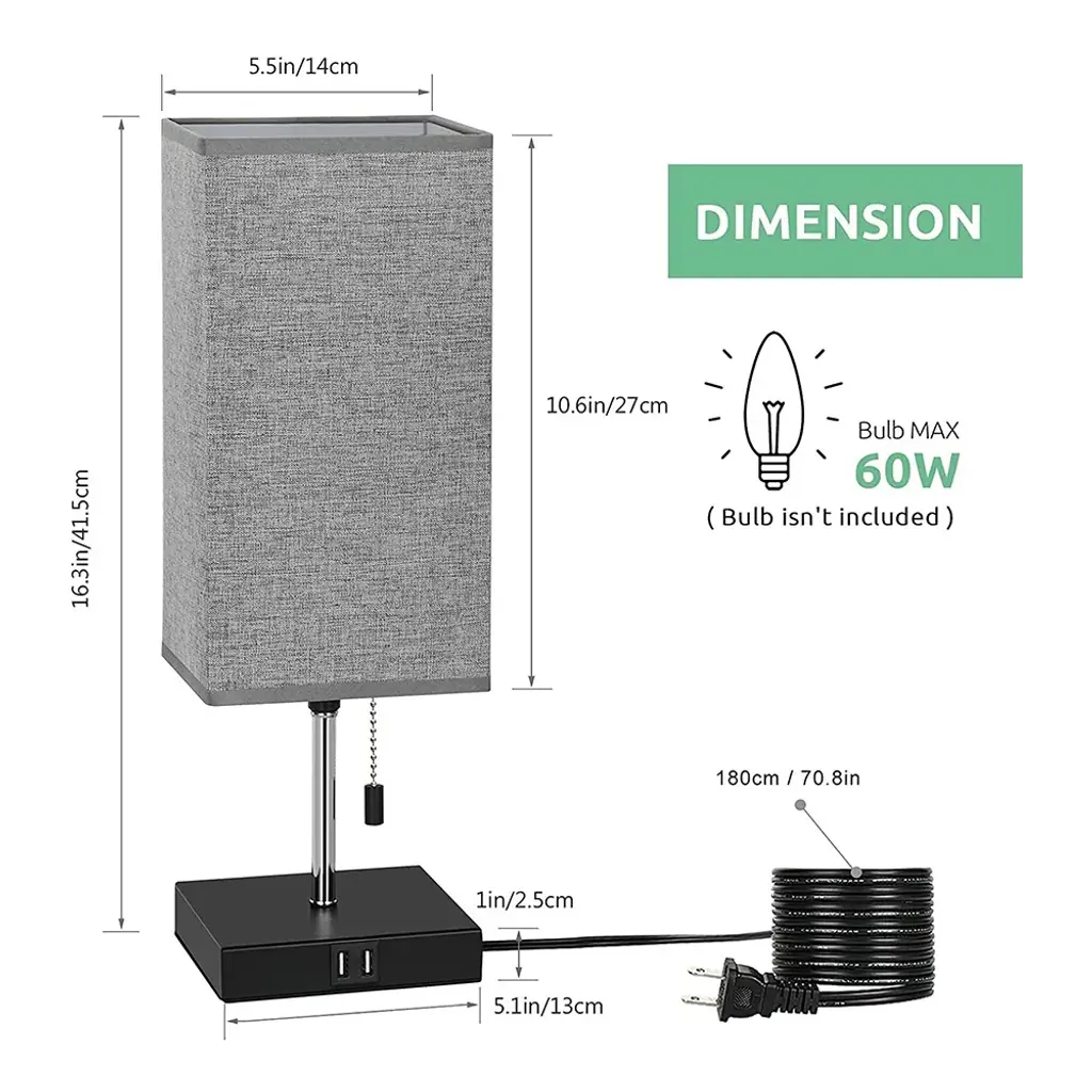 2 kinds of switches: Pull-chain Switch or Touch Switch Package Included: 2 x Bedside Table Lamp (Bulb NOT Included) Specifications: Color: Grey, Blue,White Linen Lamp shade / Black,Sliver Metal Base Size: 17.7 × 6.9 × 8.3 inches Weight: 2.7 Pounds Material: Fabric Shade, Metal Base Switch Style: Pull Chain / Touch Control Voltage: 110-120V Cord Length: 1.60 m (63 in) 🌵【Dual USB Charging Ports and 2-pin AC Outlet】 - These lamps built-in dual USB charging ports (5V/2.1A)and 2-pin AC outlet on the base. Convenient to charge your 2 devices at once. Such as mobile phones, tablets, kindle readers, speaker and other electronic devices. (The USB ports and outlet can charge your devices whether these table lamps are turned on or off.) 🌵【Pull-chain Switch Design】- Lamps size: 17.9 (H) x 6.9 (W) x 8.3 (D) inches, the cord length: 63-inch. These bedside lamps are designed with a stylish pull chain makes it easy to turn the light ON/OFF without getting up, it's convenient to read in bed, study at desk or work in office. 🌵【Touch Lamps Design】Size: 17.9 (H) x 6.9 (W) x 8.3 (D) inches,this lamps for bedroom set of 2 features sensitive touch control, when you tap their pole or base, this bedside lamp set of 2 will be turn ON/OFF, but non-dimmable. 🌵【UL Listed Plug】The plugs of these lamps for bedroom are UL listed. (The UL symbol between 2 pins of the plug) Compatible with a variety of incandescent, halogen, LED or CFL light bulbs.(Bulbs aren't included in the package). 🌵【Natural Harmless Material】Made of linen fabric shade is soft and cozy material that can transform the room into a cozy and relaxed environment. And black finish vase base is anti-rust metal. It is perfect as nightstand lamps, office lamps, living room lamps, bedroom lamps, bedside lamps for bedroom set of 2. 🌵【Perfect Home Decor】 Its nickel finish vase base was combined with spray paint and high temperature furnace fixation technology,which is enduring, durable and aesthetic. These bedside table lamps would be perfect lights for a beautiful modern house that adds a touch of beauty to any room. Also, it will be a best choice and presentable gift for your friends, lover, family!