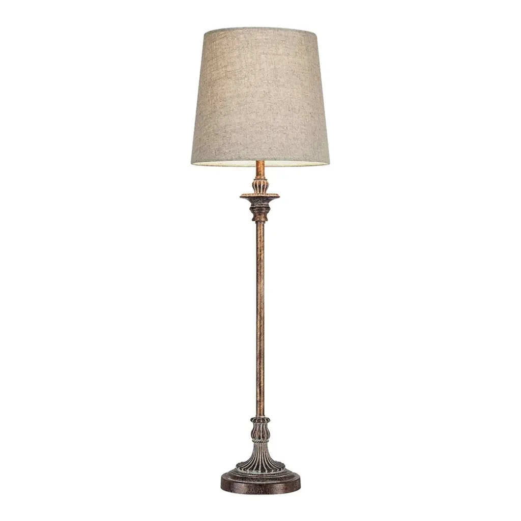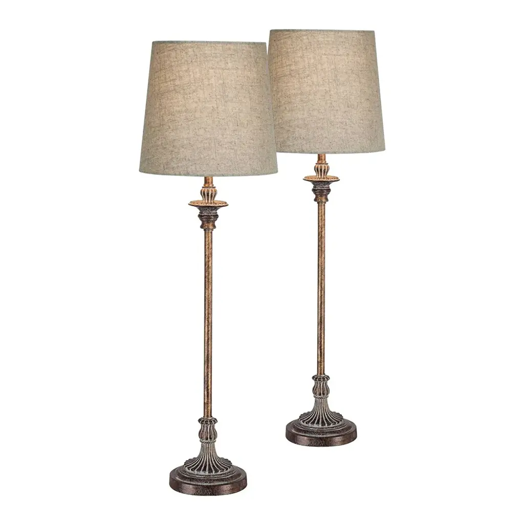 PRODUCT DETAILS: Set of 2 lamps: each is 31 1/2" high overall. Base is 6" wide. Shade is 8" wide at the top x 10" wide at the bottom x 9" high. Each uses one maximum 60 watt standard-medium base bulb (not included). Traditional buffet table lamp from the Regency Hill collection of table lamps. Weathered brown finish; cast resin construction. Linen fabric drum shades with uno style fitters. DESCRIPTION: Evoking feelings of royalty and old-world traditions, these beautiful buffet table lamps will elevate traditional decor. The slender post is held in place by a circular pedestal base with tapering ridged details, with mimicking accents at the neck. The weathered finish adds a charming quality, and an elegant linen drum shade completes the look. From the Regency Hill collection of table lamps.