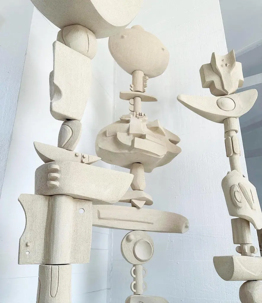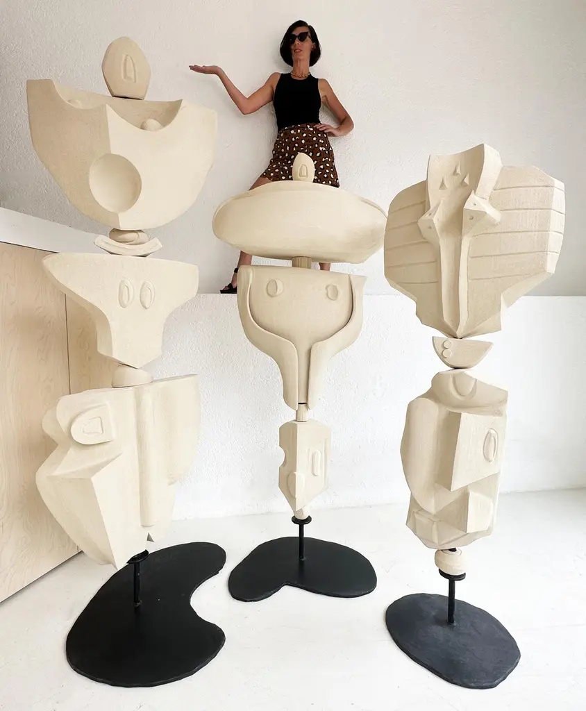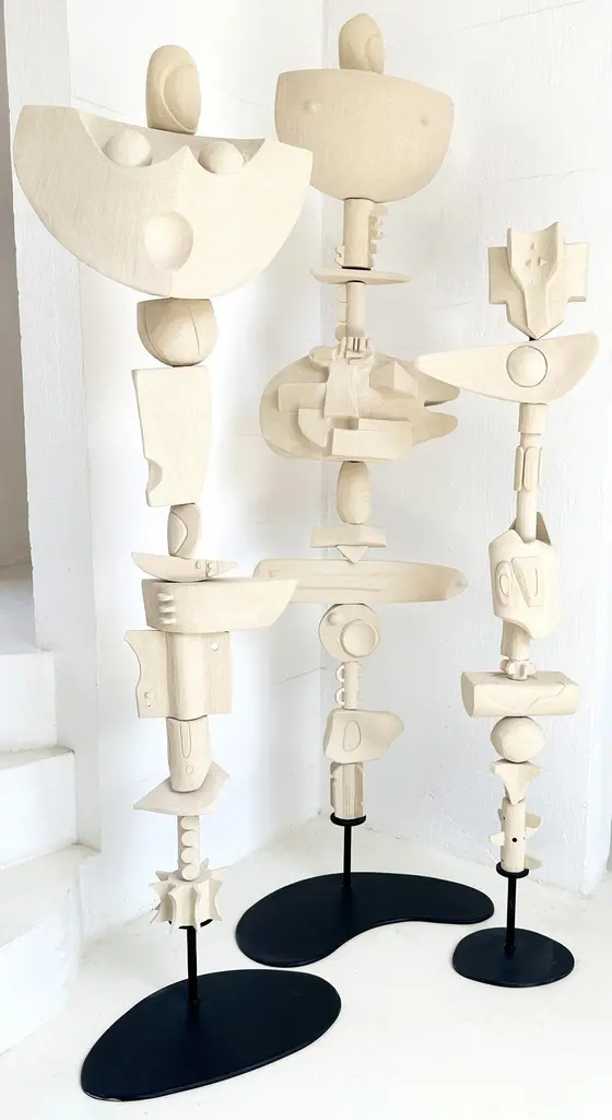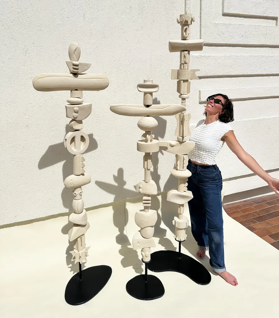 Set of 3 Totem by Olivia CognetDimensions: Small: 170 cm, Medium: 190 cm, Large: 220 cmMaterials: Ceramic. Each of Olivia’s handmade creations is a unique work of art, the snapshot of a precious moment captured in a world of fast ‘everything’.Since moving to Los Angeles in 2016, French artist and designer Olivia Cognet has focused on ceramics as the fertile medium through which she expresses her boundless creativity.With the freedom this material affords to explore every type of shape and size, she creates monumental bas-reliefs and giant totems as well as chairs, tables, lamps and vases.These unique pieces, handmade by the artist in her studio, all share the same high aesthetic, abstract and graphic standards. She draws inspiration from the lights and shadows of the landscapes of California, its modernist architecture and intense nature.Infusing a modern take on the great tradition of decorative arts, her works are both functional and powerfully evocative.Olivia Cognet grew up in Nice on the Côte d’Azur, studied at the Villa Arson and was nourished by the brilliant masters from the school of Vallauris, from Picasso to Roger Capron; for her, ceramics are a key element of architecture.She starts by exploring ideas on paper, before moving to stoneware, using a local clay that comes in three natural shades. Her designs showcase the power of contrasts; her minimal, geometric lines are interwoven with a sensual and organic vocabulary.The austere aesthetic of rough clay is heightened by the elegance of the crackle glazes, which generate singular effects.Elsewhere, ethereal excrescences defy the laws of gravity.Day after day, guided by her intuition, Olivia Cognet reinvents the poetic experience of creation, fashioning work through the purity of the material. This is the magic of the artisan, combined with the promise of vibrant beauty, to enhance everyday life.Marion Vignal.