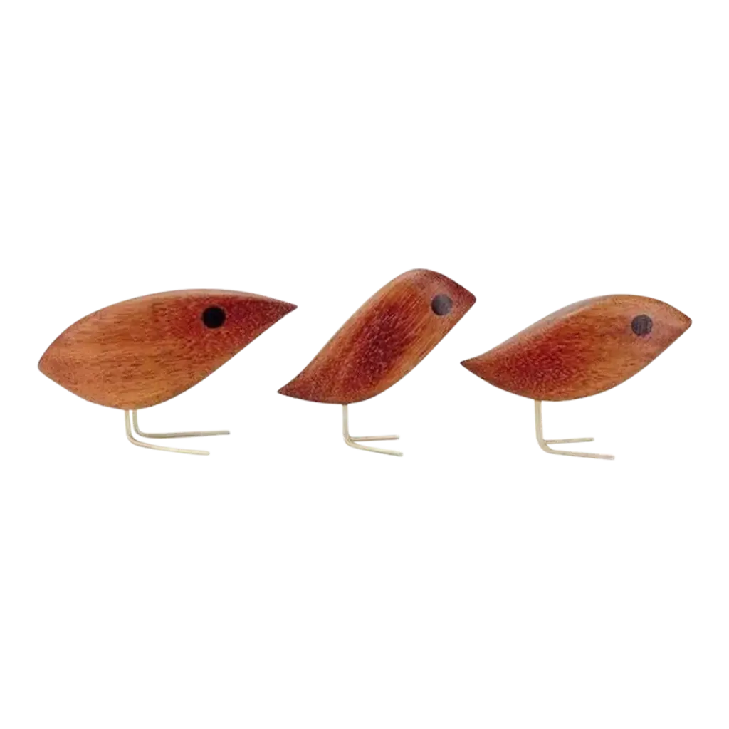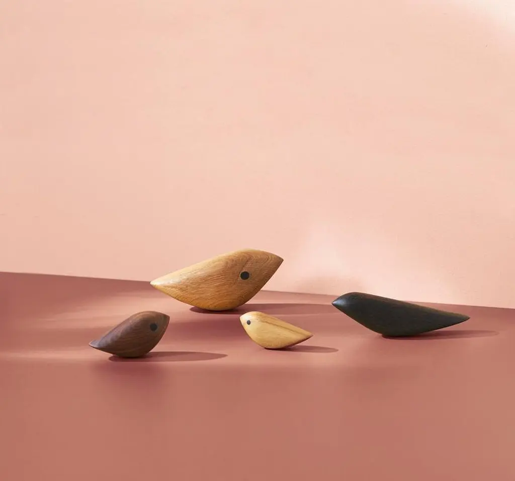 Set of 4 twirling birds sculputes by Warm NordicDimensions:Small: D8,5 x W2,5 x H3,6 cmMedium: D9 x W4,5 x H4 cmLarge: D15 x W3,7 x H4,3 cmX-large: D16,3 x W6,5 x H7,5 cmMaterial:Oiled solid teak, Oiled solid walnut, Oiled smoked solid oak, Oiled solid oak.Unique rotating wooden birds, created in the 1950s by the Danish furniture designer and true artist, Jacob Hermann and now being manufactured by Warm Nordic. The Danish-manufactured Twirling Birds are ideal as a personal gift that will delight recipients of all ages. Each of the rotating birds has its own character, determined by the grain and colour of the wood. It can be used as a decoration or for play. You can easily spin round a Twirling Bird as an elegant version of the game 'Spin the Bottle'. That is exactly what the artist used it for. As an elegant detail, the actual eye on some of the hand-polished Twirling Birds are also made from a little piece of wood. The beautiful birds come in an elegant box, which also makes them perfect for a sweet gift for someone you care about.Warm Nordic is an ambitious design brand anchored in Nordic design history and with a timeless, aesthetic style that inspires you to appreciate the little things in life. The company is the result of several years’ intense work on developing a new design brand with design history, quality and personality at its core. Warm Nordic boasts a colourful and charming universe of furniture, lamps and accessories full of personality. Our designs encapsulate the Nordic spirit, which in its essence is timeless, inclusive and warm.