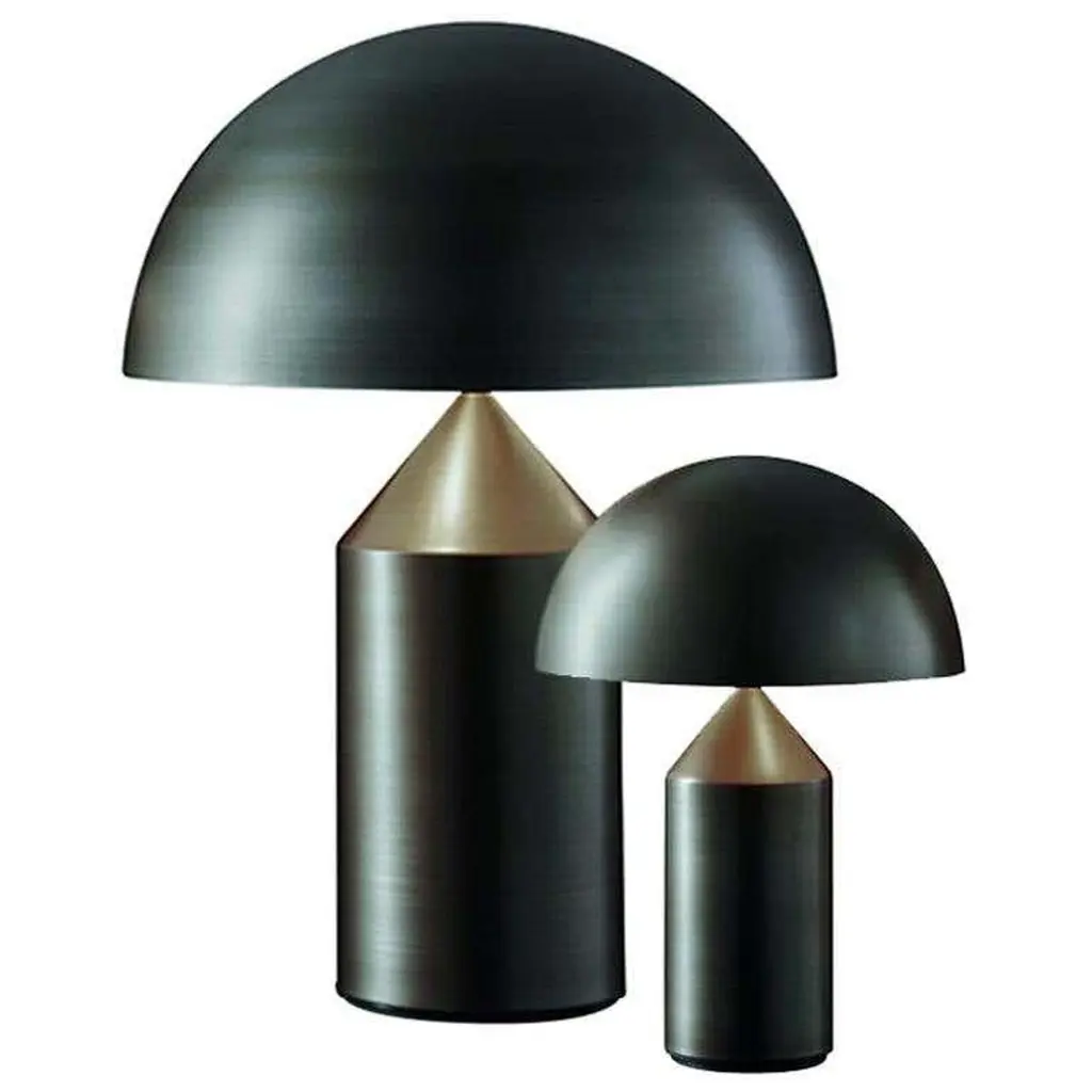 Set of two table lamp -medium and small- "Atollo" designed by Vico Magistretti in 1977Manufactured by Oluce, Italy.Designed in 1977 by Vico Magistretti, over the years, Atollo has become the archetype of the table lamp, winning the Compasso d’Oro in 1979 and completely revolutionizing the way we imagine the Classic bedside lamp. The geometric shapes that compose it – cylinder, cone and hemisphere, have resulted in a product that is decorative and essential at the same time, disconnected from the historical period and the fashions of the moment, and one that has now fully become one of the icons of Italian design.Materials and color:Metal satin bronzeDimensions:Medium: D 38 cm x W 38 cm x H 50 cmSmall: D 25 cm x W 25 cm x H 35 cmTechnical information:Medium: 2 x max 75 W (E27) + 1 x max 40 W (E14) - universal dimmerSmall: 2 x max 40 W (E14) + 1 x max 25 W (E14)This lamp is wired for Europe, if used in US or any other country the client will need to convert it.Founded in 1945, Oluce is the oldest Italian design company in the lighting sector still in operation today. Oluce lighting’s design aesthetic is crisp, linear, and decorative. A subtle, intellectual beauty that over the years has led the company to produce some of the more recognizable and admired iconic lighting in the world. Oluce, already participating at the 9th Triennale in Milan, throughout its long history, has received numerous acknowledgements including two Golden Compass awards, two Design Awards and the Gold Medal at the 13th Triennale in Milan. Its lamps appear in the most important permanent design collections worldwide.Oluce’s expertise reveals its unparalleled manufacturing excellence which transforms into objects an untiring technological research into the potential of light. Each lamp is a milestone along this journey. Over time, from unusual materials, original designs and new lighting sources ensued revolutionary iconic designs by Tito Agnoli, Joe Colombo, Marco Zanuso, Ostuni e Forti, and Vico Magistretti, who since the 50s, have been rewriting the history of lighting. Recent collections reaffirm Oluce design and decorative approach, expressed through the signs by Italian and international designers such as Angeletti & Ruzza, Francesco Rota, Nendo, Victor Vasilev, Nicola Gallizia, Christophe Pillet, Mist-o and David Lopez Quincoces.