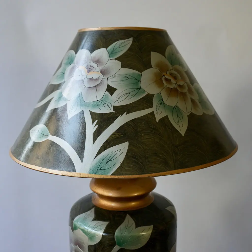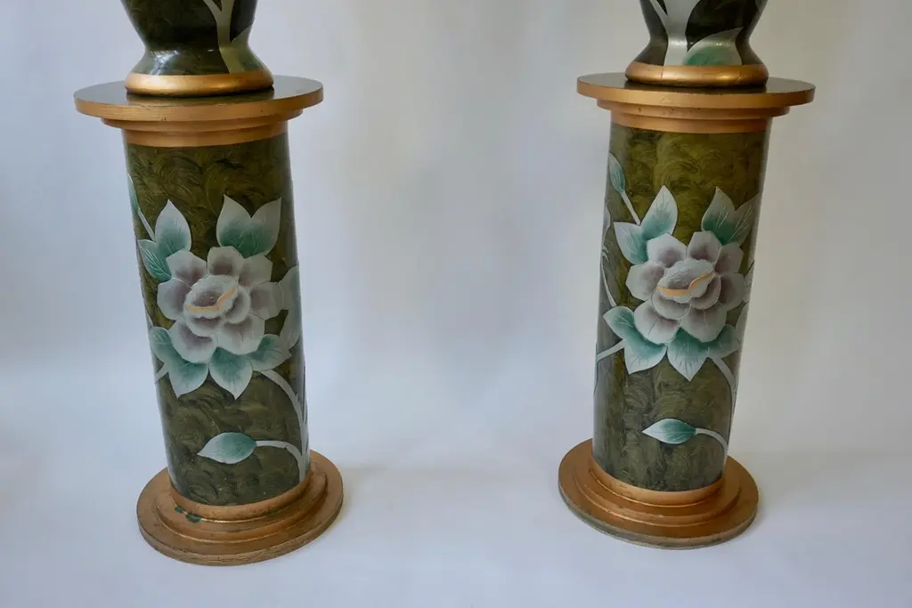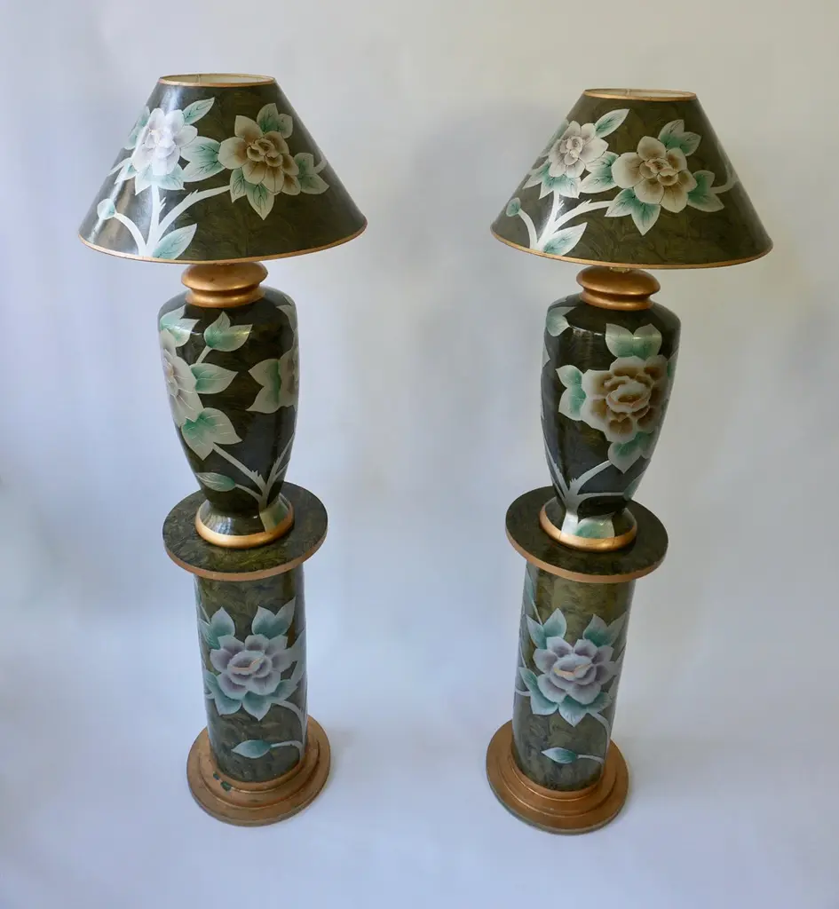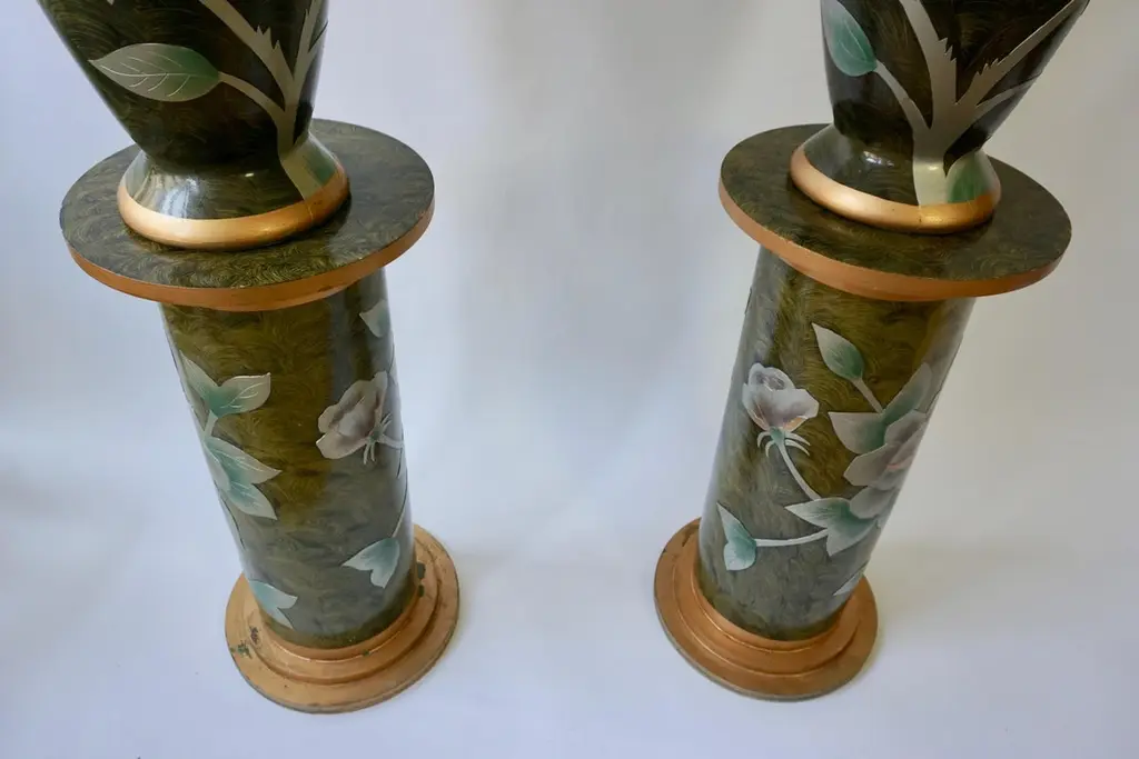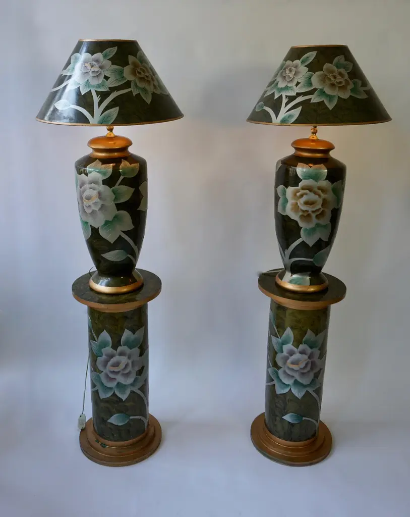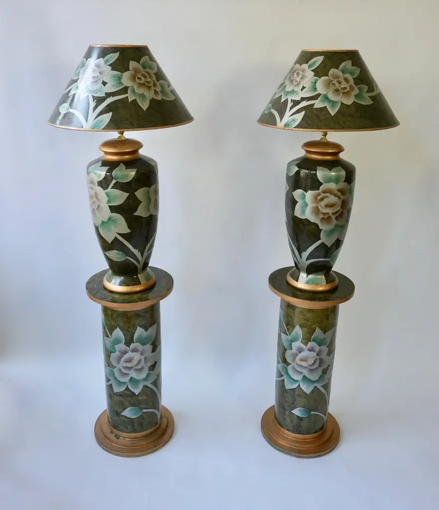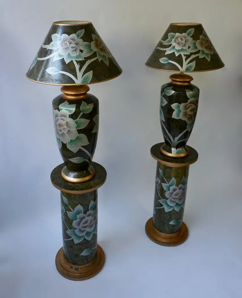Two beautiful terracotta table lamps on two pedestals. Italy, 1970s.Measures: Height table lamp 88 cm, diameter 50 cm.Height pedestal 69 cm, diameter 33 cm.Total height 157 cm.One E27 bulb.