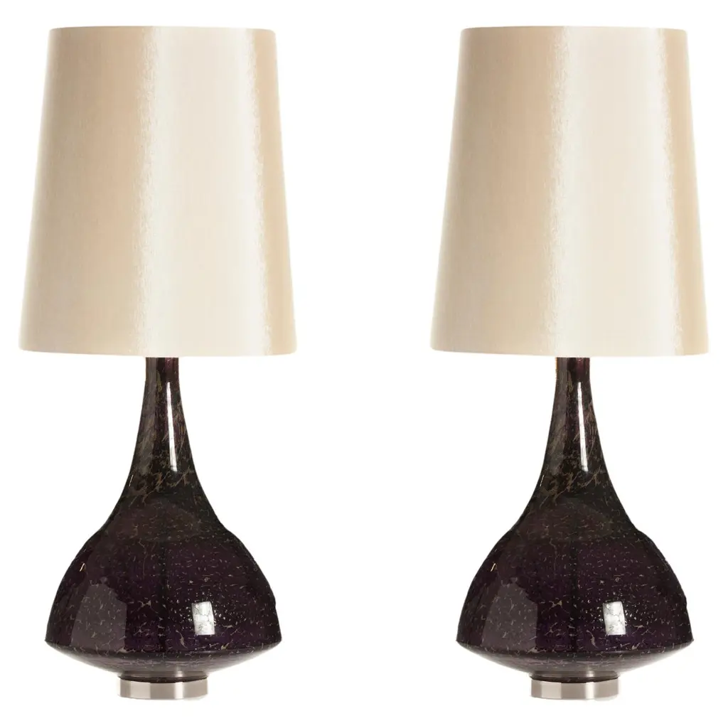 Set/2 Modern Table Lamps, Glass Base, Satin Lampshade, Handmade By Greenapple