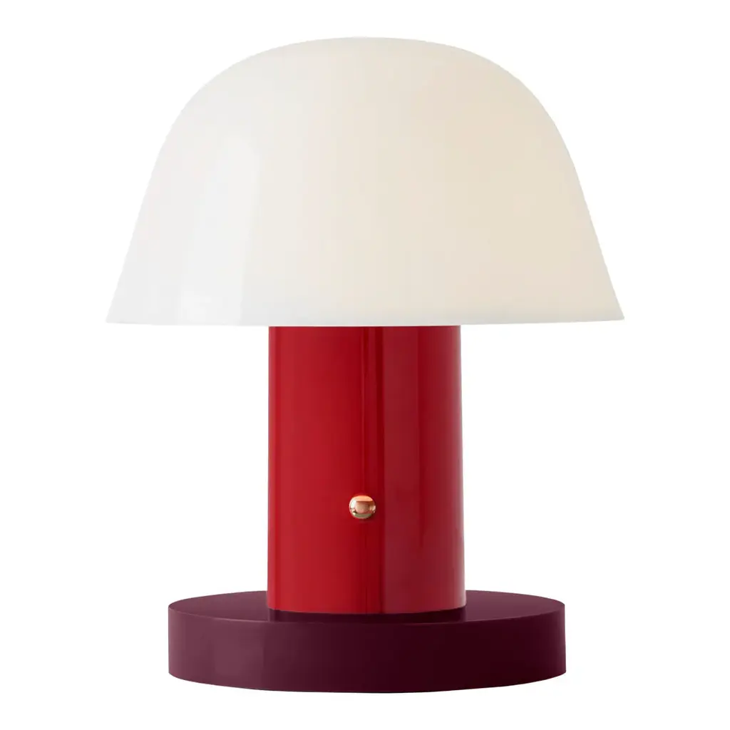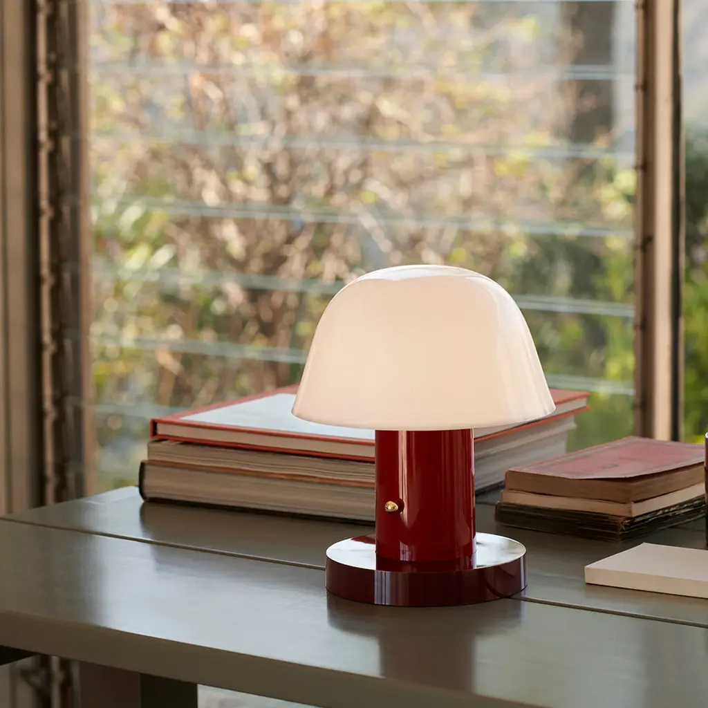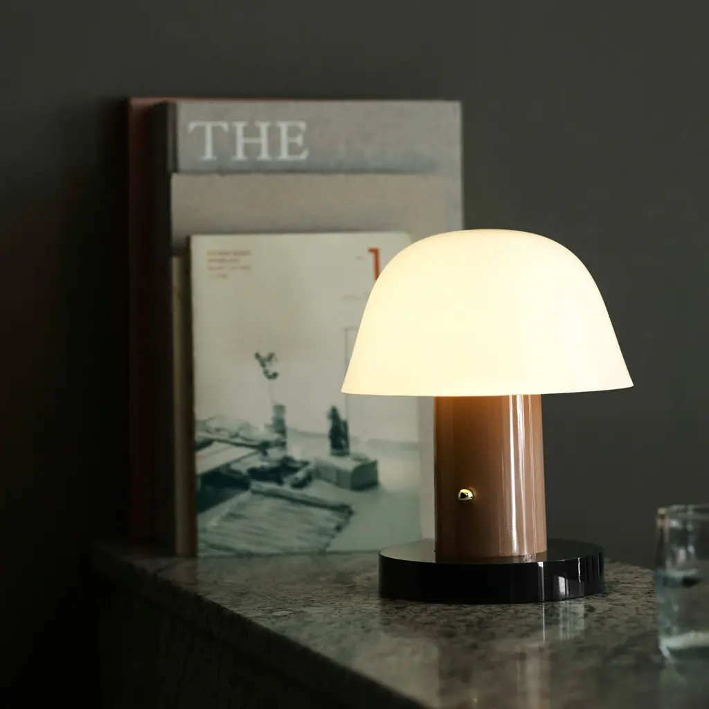 Like many of Jaime Hayon's pieces, the Setago comes with a story. Seta, the Spanish word for mushroom, sets the tone for the diminutive, mushroom- like proportions of this quirky table lamp. But a further clue to its identity is signified by the suffix ago, because this lamp, unburdened by an electrical cord, can literally go anywhere. Rather than remain stationary, it was made to be moved around with ease, plucked like foliage from the floor and carried from one room to the next. To recharge, it simply needs to be attached to a USB cable. "I wanted to create a lamp that prioritized versatility," says Hayon of his vision. "The Setago's cord-free feature means it is extremely adaptable, equally suitable indoors as well as outside." This careful consideration to detail has been applied to other facets of the Setago. Drawing inspiration from the artistry of a Japanese lantern, Hayon melds superior craftsmanship with the decidedly modern capabilities of his cord-free design. Despite such integration of technology, the workings remain hidden inside to keep the lamp's form clean and uncluttered. The light it produces is equally considered, the mood is manipulated by a discreet brass dimmer that controls the diffused, ambient light. Available in a range of modern colors, the Setago adds an understated touch to any environment. Look closer at the lamp shade and you,ll notice it ends in a small upward curve. It's another small yet stylish accent, much like the Setago itself.