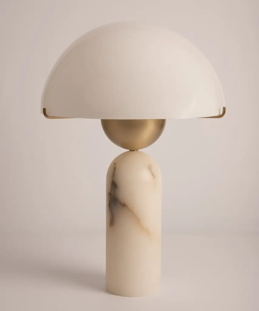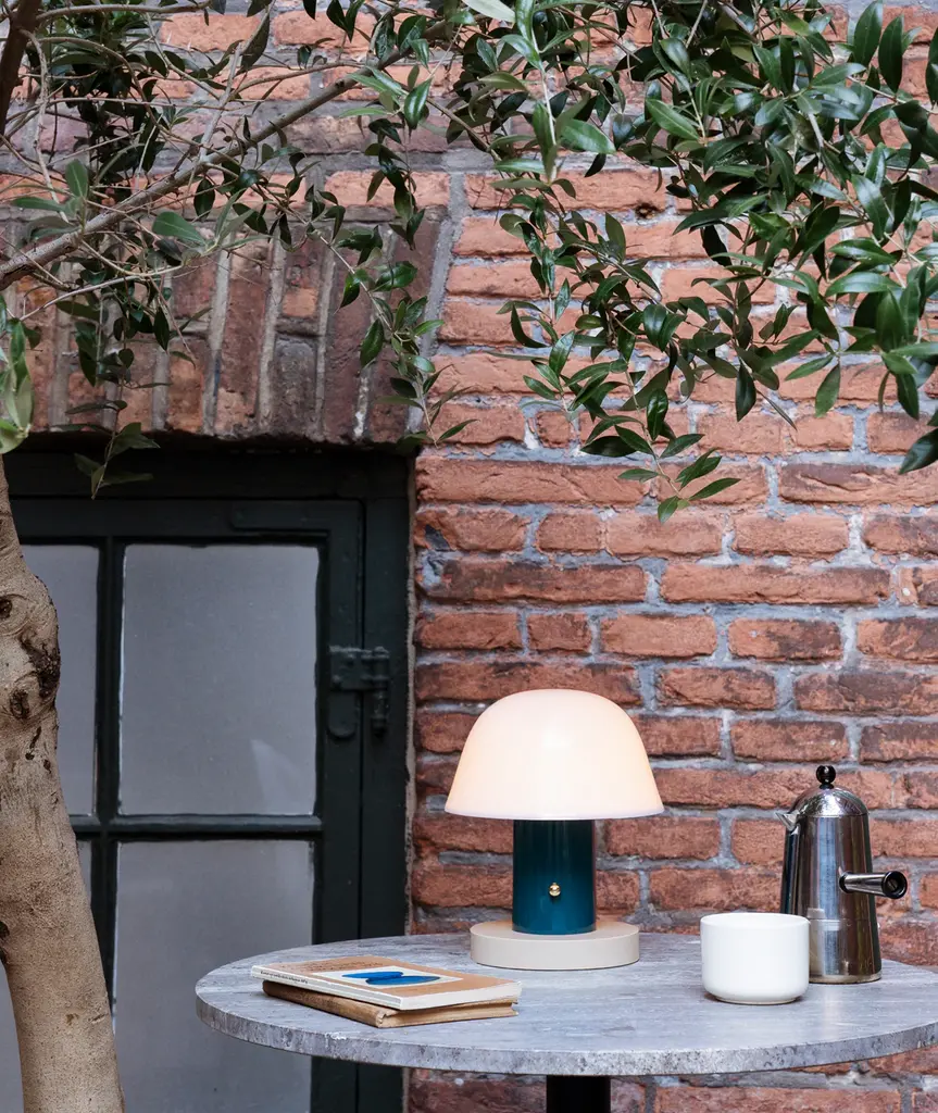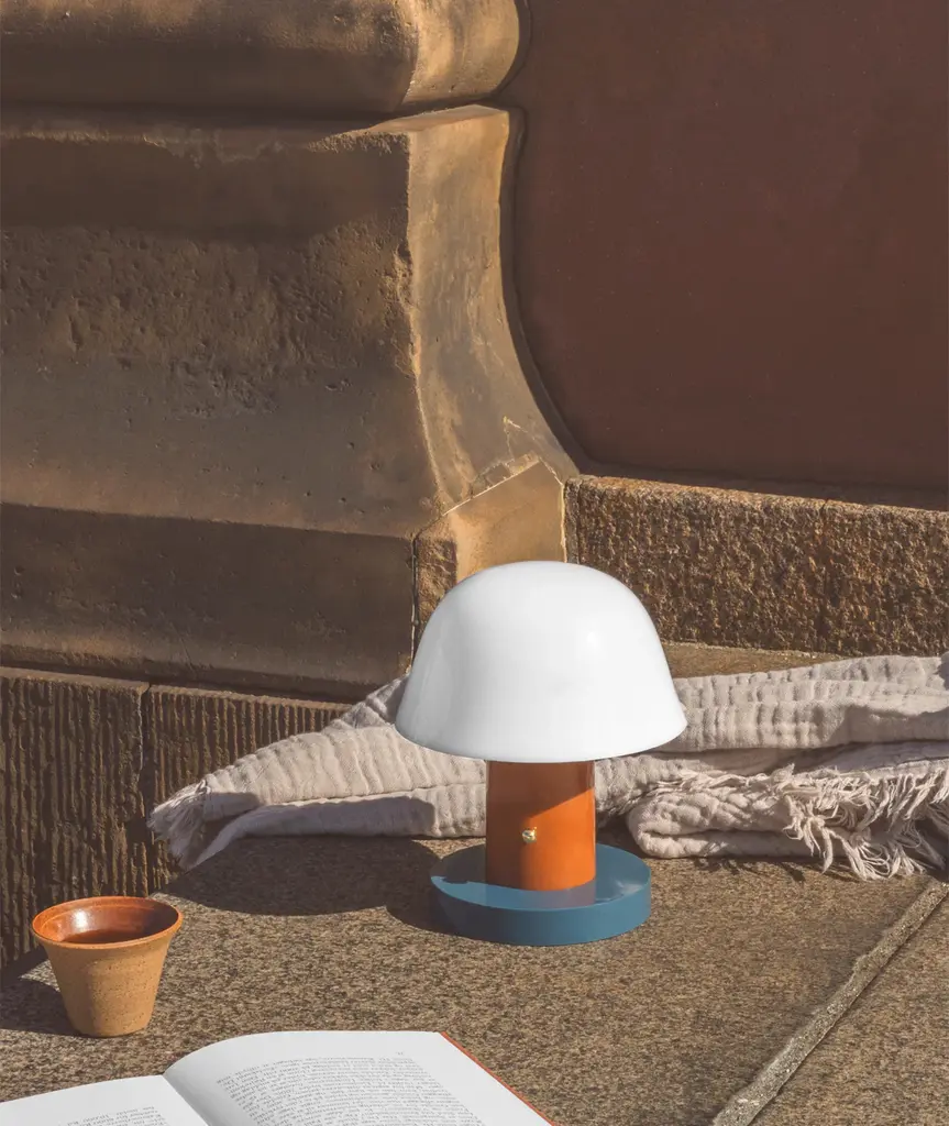 ‘Seta’ the Spanish word for mushroom sets the tone for the diminutive, mushroom-like proportions of this quirky table lamp. But a further clue to its identity is signified by the suffix ‘go’ because this portable lamp unburdened by an electrical cord can literally move anywhere. Additional design features include a discreet gold dimmer and a stylish upward curve on the lamp shade’s brim.