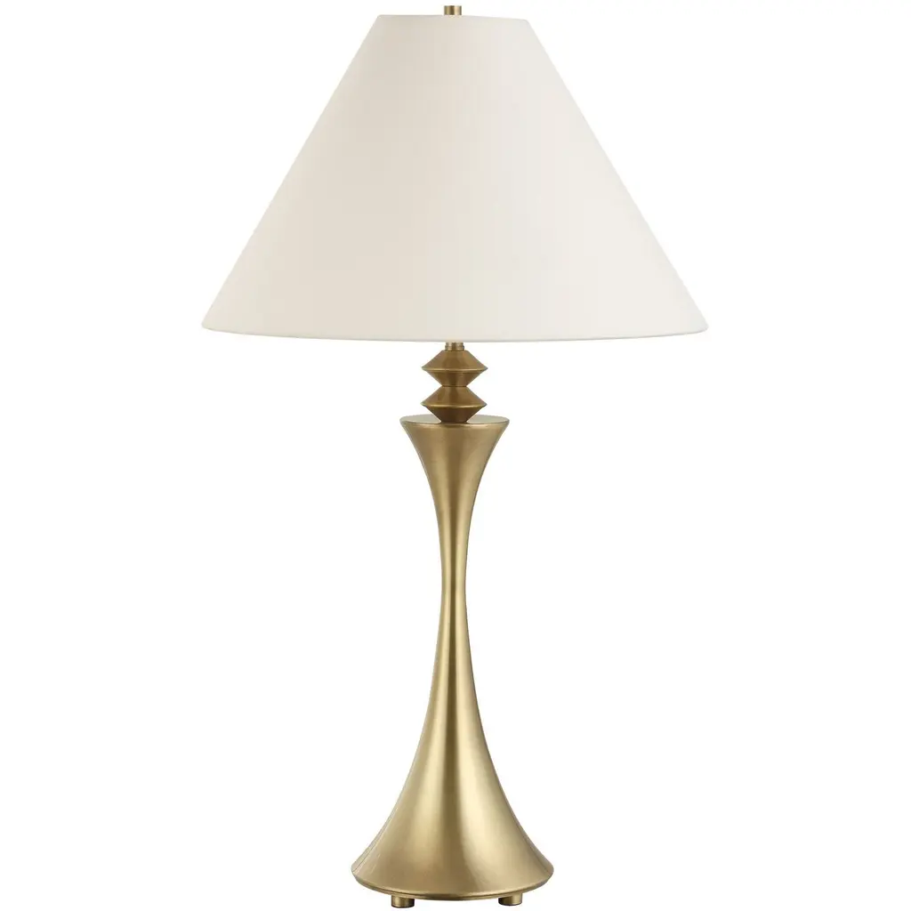The Shaefer Table Lamp Showcases A Striking Flared Metal Base With Intricate Geometric Detailing In Plated Brass. The Coolie Style Shade Is Covered In A Crisp White Linen.