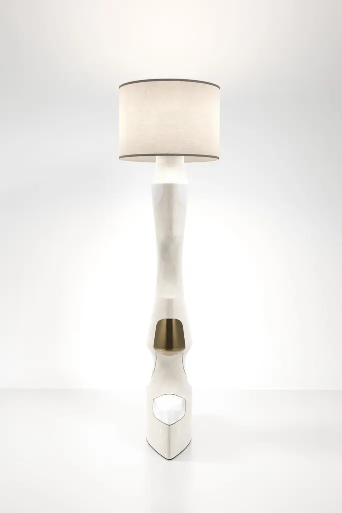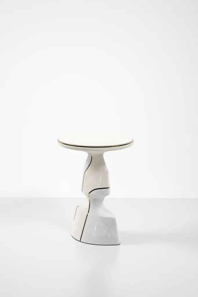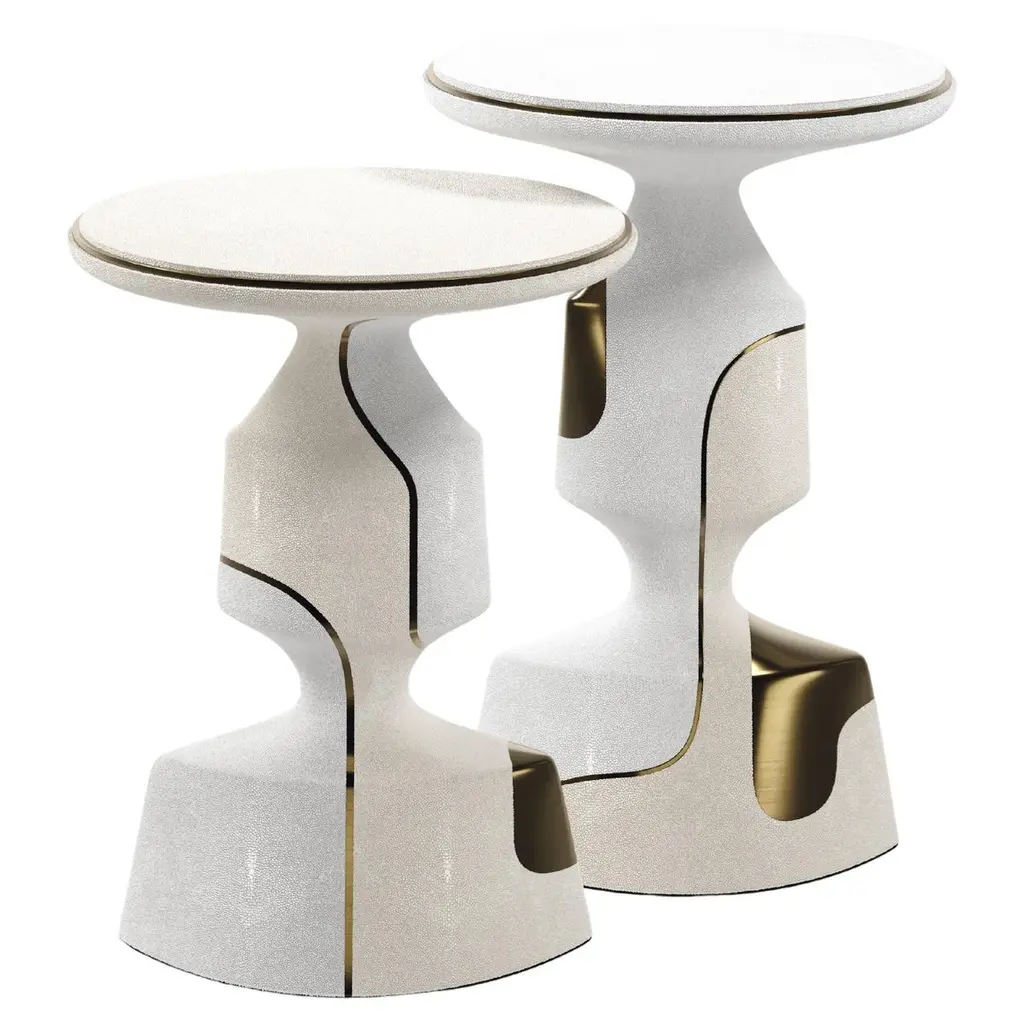 The Paris based label has distinguished themselves since their launch, with their iconic use of shagreen mixed with brass and other exotic materials. All furniture is handcrafted by skilled artisans, ultimately making each piece unique, designed in Paris and produced in the Philippines.The Artemis Sculptural Side Table I is a graphic piece that adds a statement to any space. The bold pattern is inlaid in a mixture of cream & white shagreen, kabibe shell and bronze-patina brass. This sculptural table is also available in a larger size (and can nest togetehr as a pair), as a floor lamp, table lamp and vases (see images at end of slide) . Custom finishing and sizing available on request.The dimensions of this piece are 39.5 x 26 x 60 cm, top diameter is 45 cmAll R & Y Augousti pieces are handmade by artisans, ultimately making each piece unique.Wipe clean with soft dry cloth.Acclaimed design duo Ria & Yiouri Augousti have established themselves since the 1990s as pioneers of modern-vintage style through their luxurious Art Deco inspired collections.The Paris based label has distinguished themselves since their launch, with their iconic use of shagreen mixed with brass and other exotic materials. All furniture is handcrafted by skilled artisans, ultimately making each piece unique. All shagreen-covered items should be kept out of direct sunlight, color variants may occur on the stingray and other exotic finishes, but this showcases the Parisian label's commitment to creating authentic luxurious products using natural components.