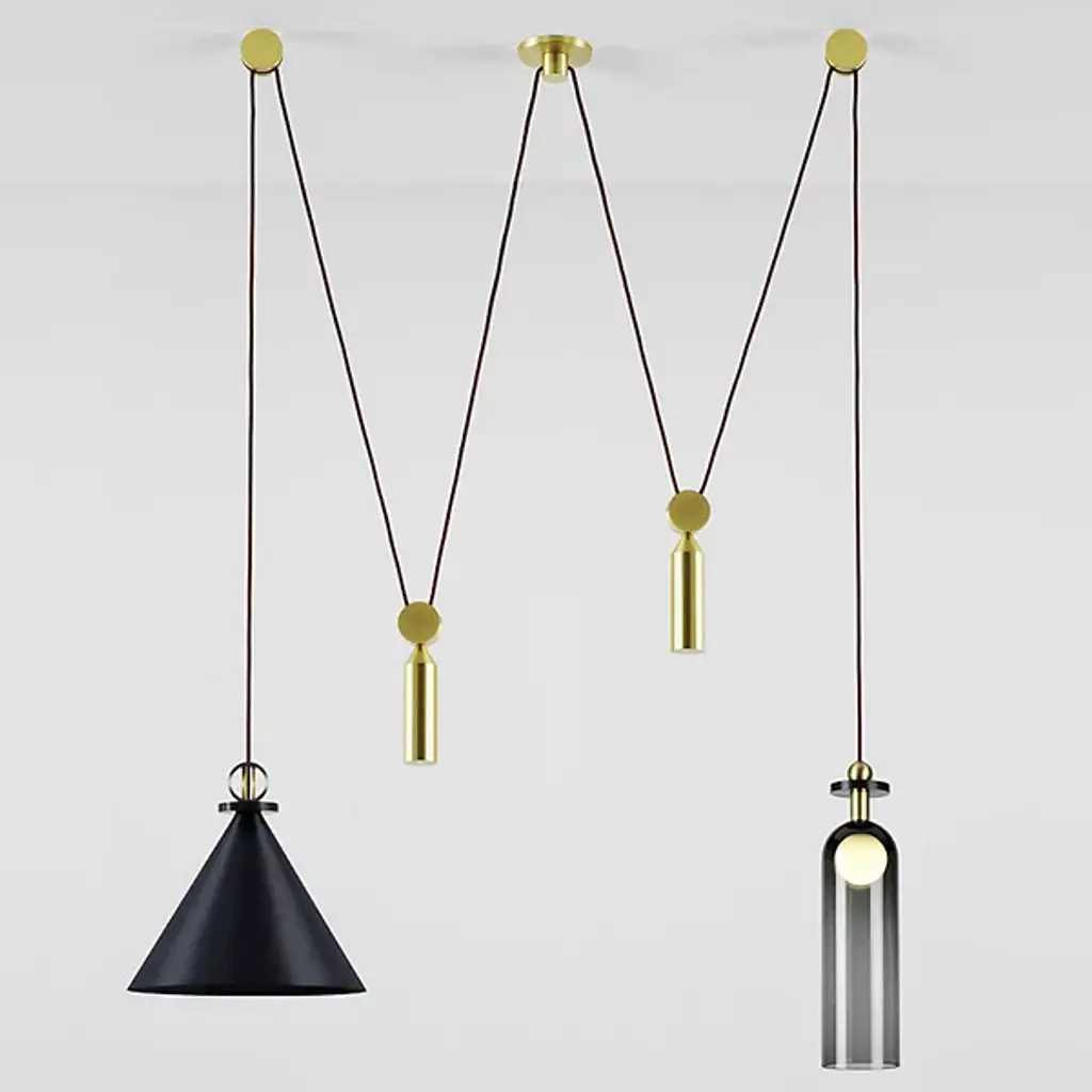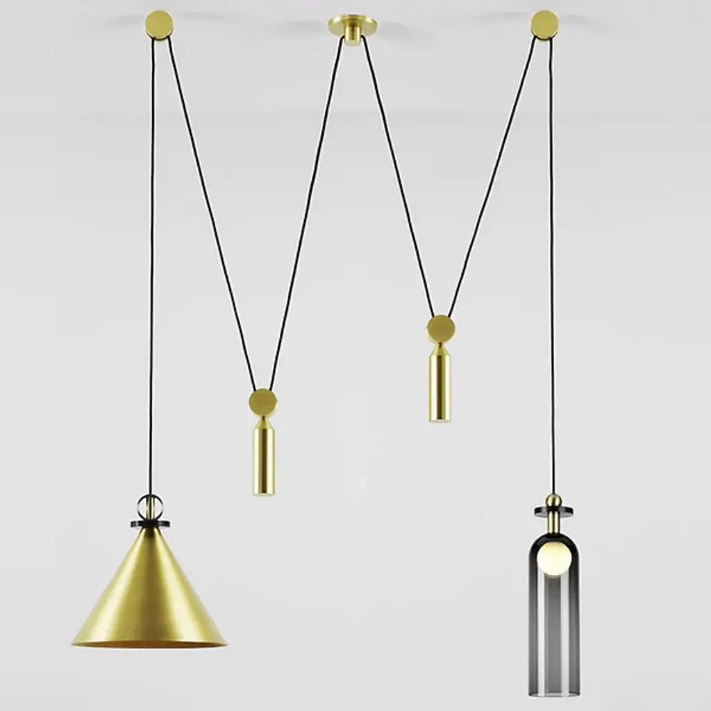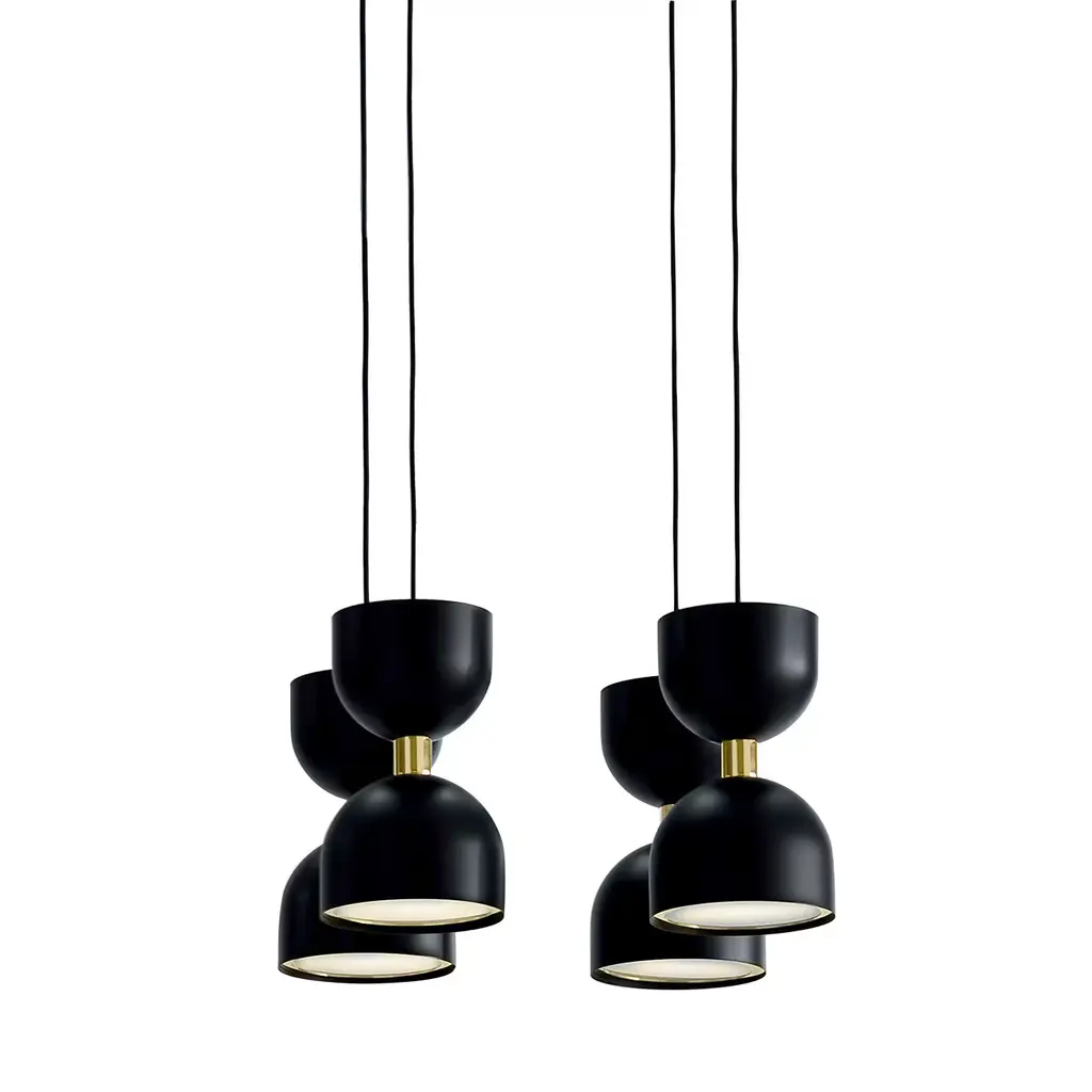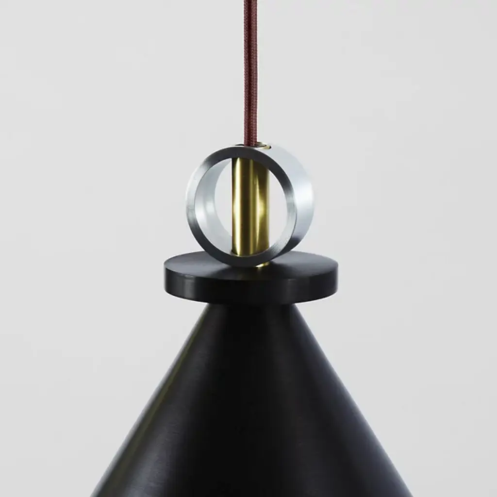 Bring elegant appeal to interior ceilings with the stellar, stunning lines of the Shape Up Double Chandelier from Roll & Hill. A 2014 creation by Ladies & Gentlemen Studio showcasing simple geometric shapes arrayed for an airy harmony, it suspends an array of metal fittings from small anchor points via slim cables. An inspired combination of steel, brass, and aluminum, it places strong lamping in a conical shade offset by cylindrical weights and accents. It can respond to unique architectural needs, suspended by a series of connecting elements.