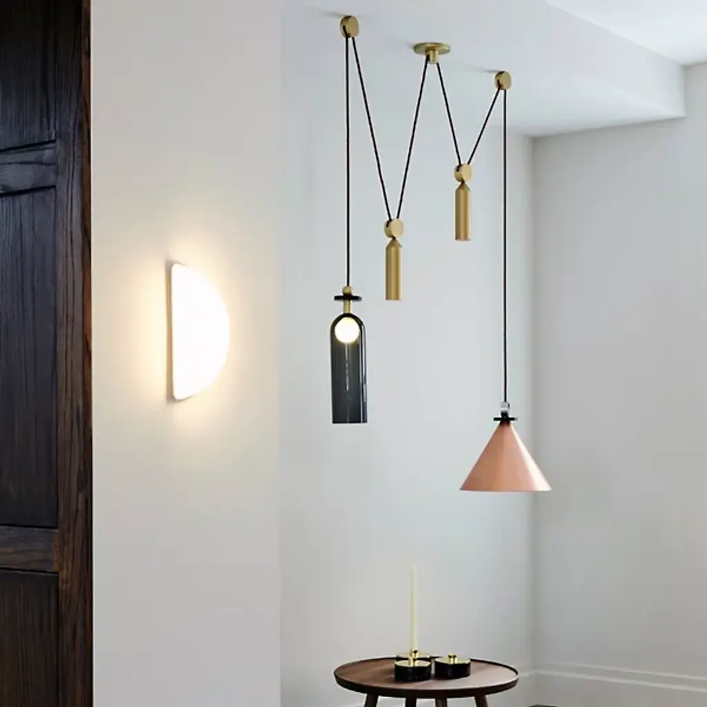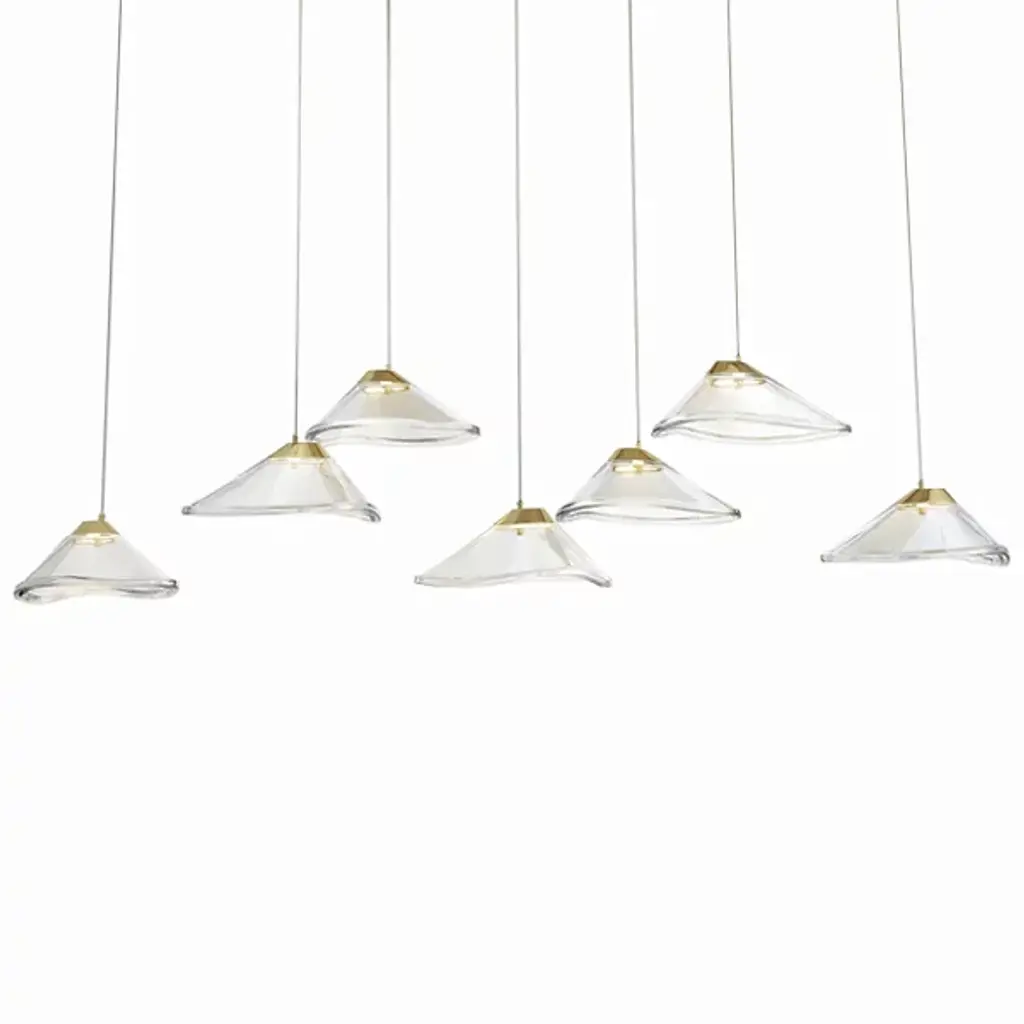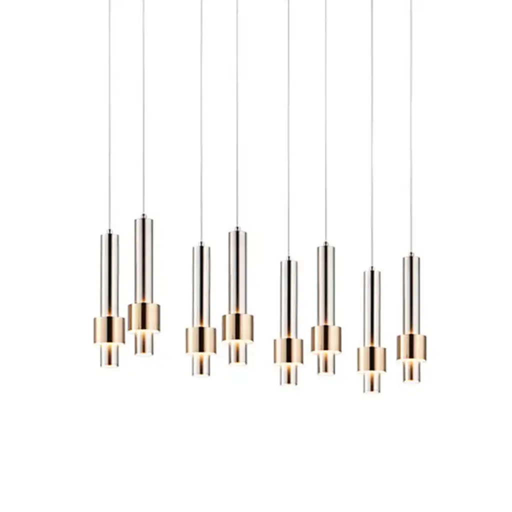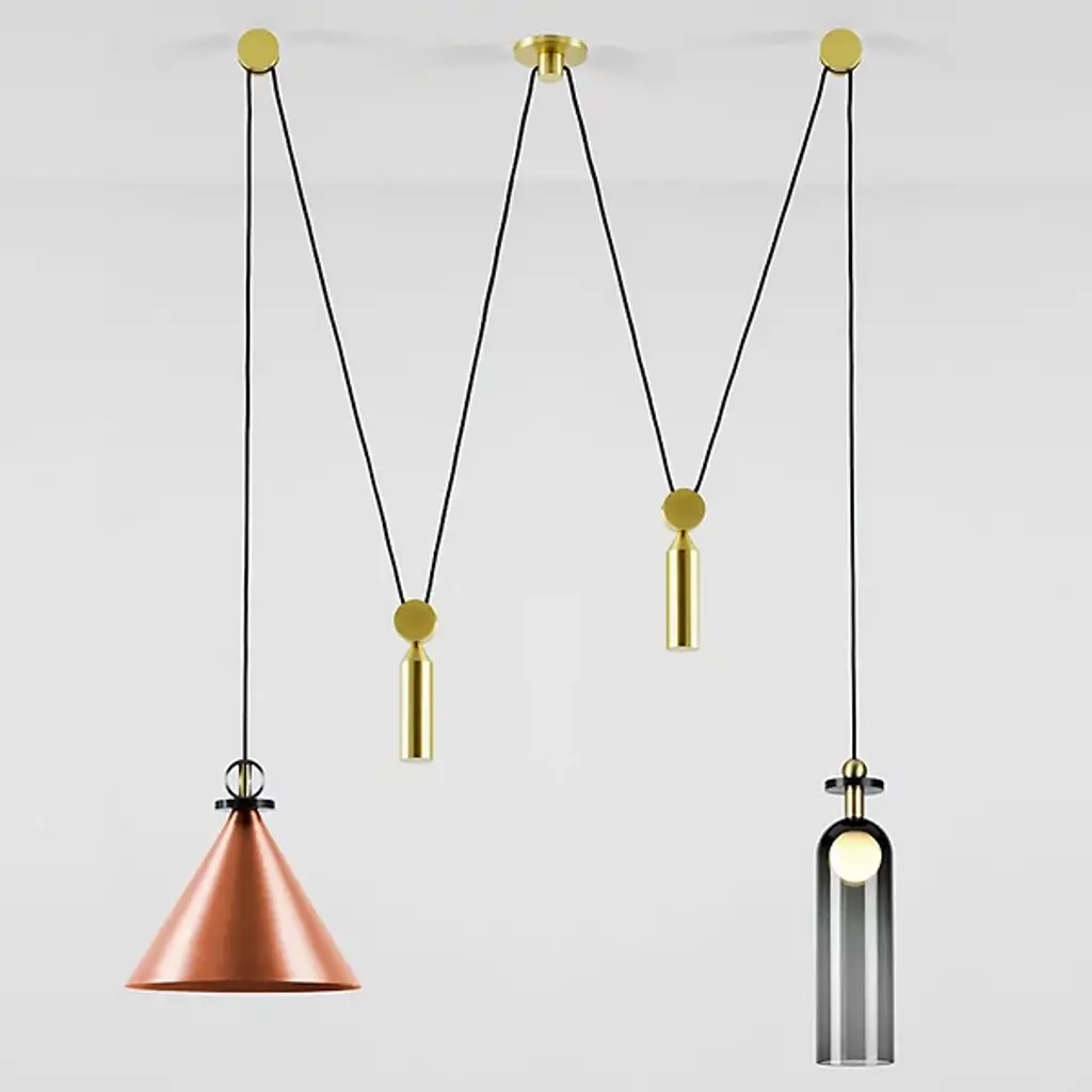 Bring elegant appeal to interior ceilings with the stellar, stunning lines of the Shape Up Double Chandelier from Roll & Hill. A 2014 creation by Ladies & Gentlemen Studio showcasing simple geometric shapes arrayed for an airy harmony, it suspends an array of metal fittings from small anchor points via slim cables. An inspired combination of steel, brass, and aluminum, it places strong lamping in a conical shade offset by cylindrical weights and accents. It can respond to unique architectural needs, suspended by a series of connecting elements.