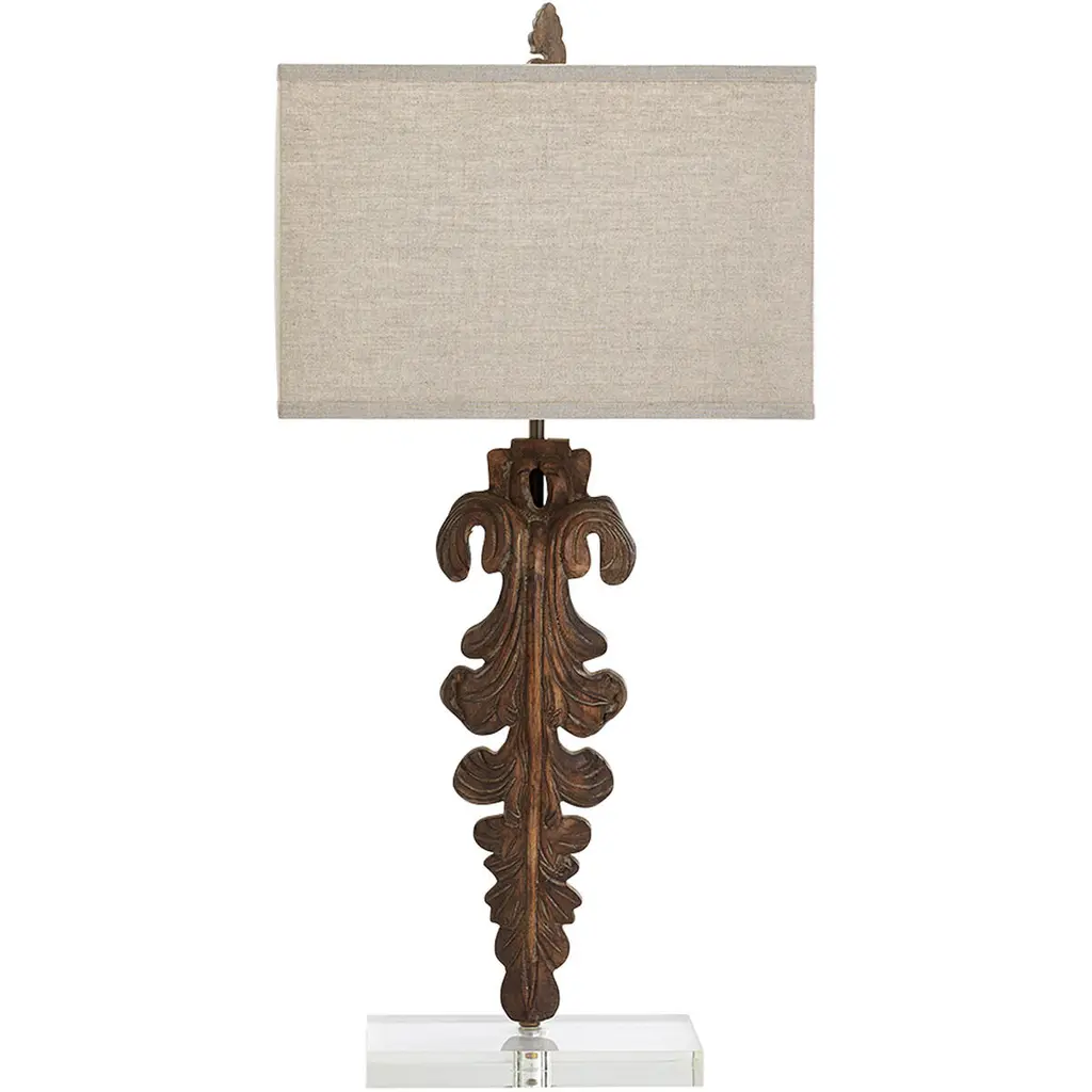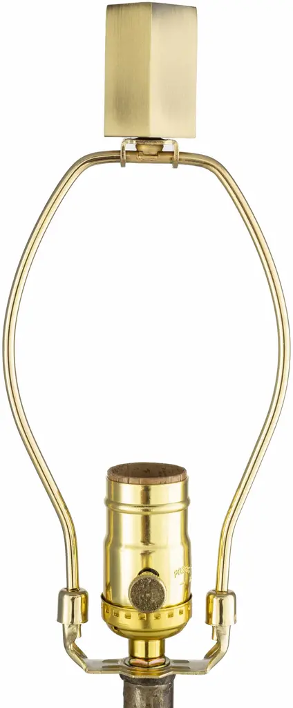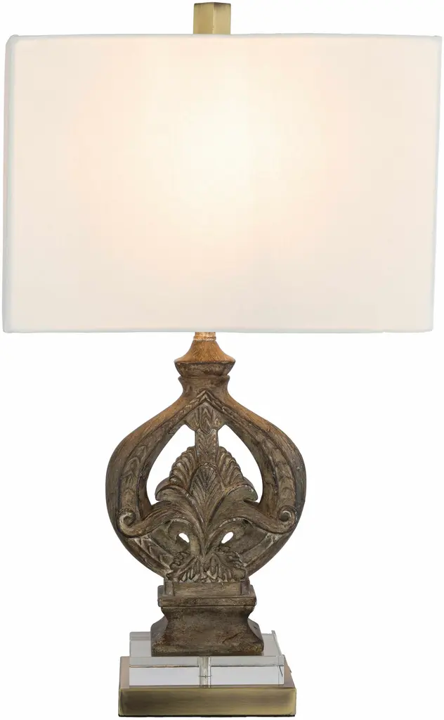 Collection: Shaunavon Colors: White, Clear, Translucent, Dark Red, Metallic - Brass, Ivory Material: Body: Resin,Base: Acrylic,Shade (Outside): Linen,Base: Iron,Finial: Iron,Shade (Inside): Cotton Styles: Traditional Made In: China Lighting Type: Accent Table Lighting Base: IronAcrylic Base Color: Metallic - BrassClear Shade Material: LinenCotton Shade Color: WhiteIvory Cord Length: 6' Switch Type: 3-Way Number of Bulbs: 1 Socket Type: E-26 Bulb Wattage: 100W