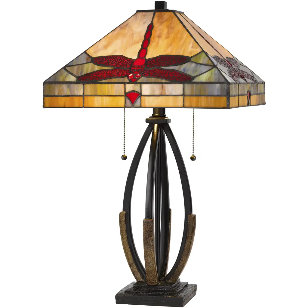 Handcrafted using the same techniques that were developed by Louis Comfort Tiffany in the early 1900s, this beautiful Tiffany-style piece contains hand-cut pieces of stained glass, each wrapped in fine copper foil. This is a Tiffany-style table lamp with an eccentric design on its shade. To finish off the look, it is paired with a unique base that goes along with the shade very well. This is operated with a pull chain, and its total height is 26 inches. Stained glass table lamp Tiffany-style table lamp Includes 60 inches of wire Setting: Indoor Fixture finish: Bronze Shades: Stained glass Number of lights: Two (2) Requires Two (2) x 60-watt bulbs (not included) Line switch Dimensions: 16 inches diameter x 26 inches high Assembly required.Note: Shade colors will appear darker and less vibrant when not illuminated. The handcrafted nature of this product creates variations in color, size and design. If buying two of the same item, slight differences should be expected.Attention California residents: This product contains lead, a chemical known to the state of California to cause cancer and birth defects or other reproductive harm.' Number of Light: 2 Lights Light Bulb Type: Incandescent Bulb Wattage: 60 Watt Lighting Type: Table Lamp Product Features: CSA Listed, ETL Listed, UL Listed Material: Art Glass, Metal Light Direction: Multi-directional Setting: Indoor Switch Type: Pull Chain Lighting Style: Tiffany Exact Color: Multi-color Height: 23 inches or more Finish: Bronze Finish Width: 16 inches or less Color: Red, Yellow, Pink, Brown Attention California residents: This product may contain lead, a chemical known to the state of California to cause cancer and birth defects or other reproductive harm.Note: Shade colors will appear darker and less vibrant when not illuminated.