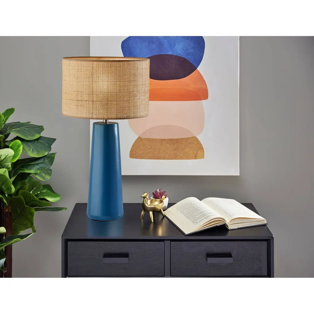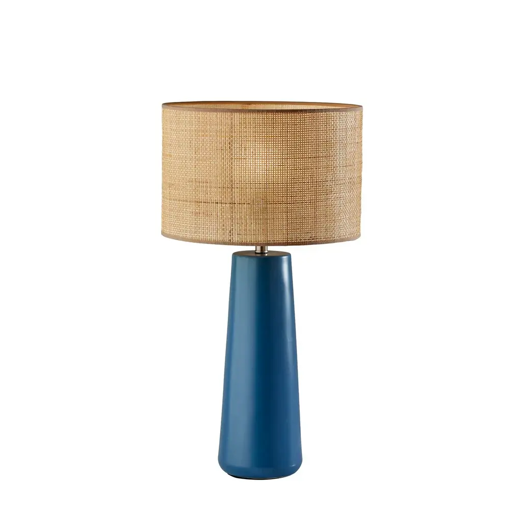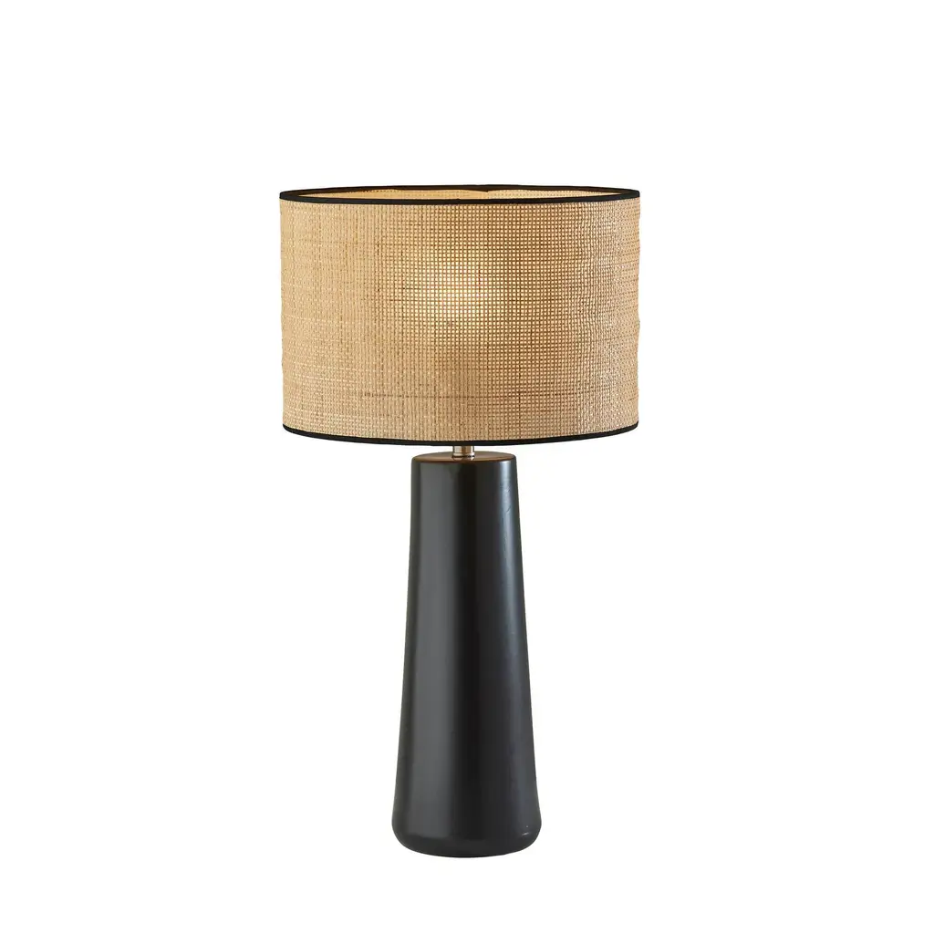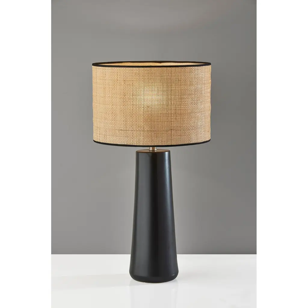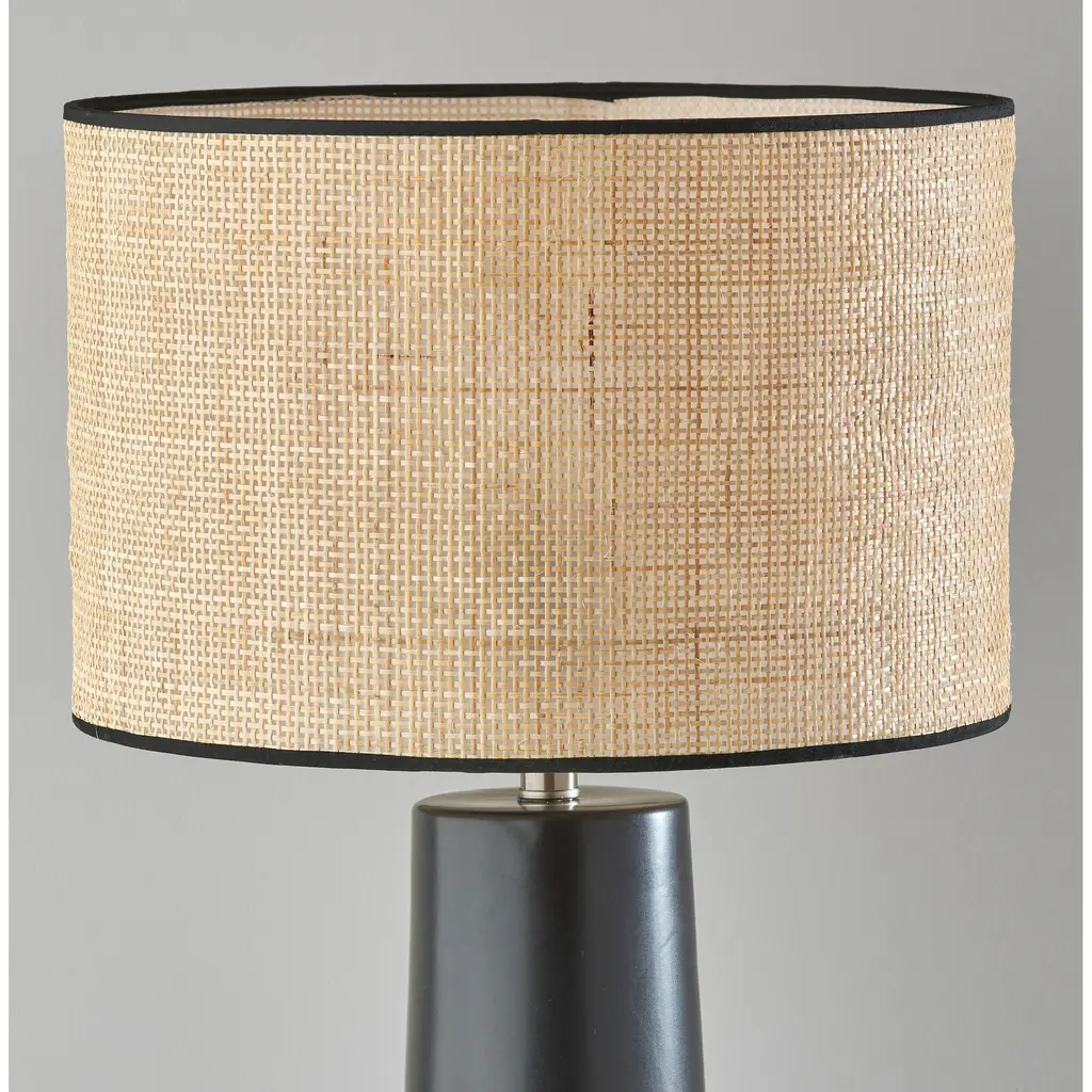 Defined by clean lines and rich materials, the Sheffield tall table lamp blends in seamlessly with farmhouse, contemporary, or coastal décor. An 18" tall cylindrical and gently tapering base crafted of black ceramic is topped by a woven natural rattan shade. The lamp shade softly disperses the light from a 150W bulb and is trimmed with black fabric along the top and bottom to match the black base. For versatile lighting options, a 3-way rotary socket switch easily adjusts the brightness between low, medium, high, and off. The Sheffield tall table lamp is also available with a white ceramic base for a monochrome look or with a cornflower blue ceramic base for a pop of color.