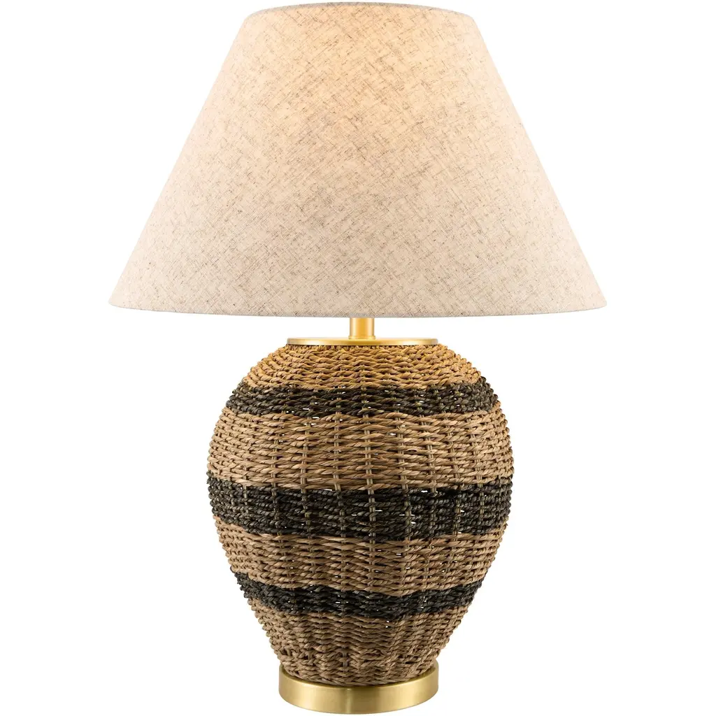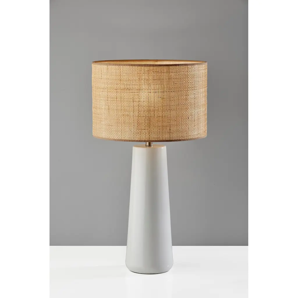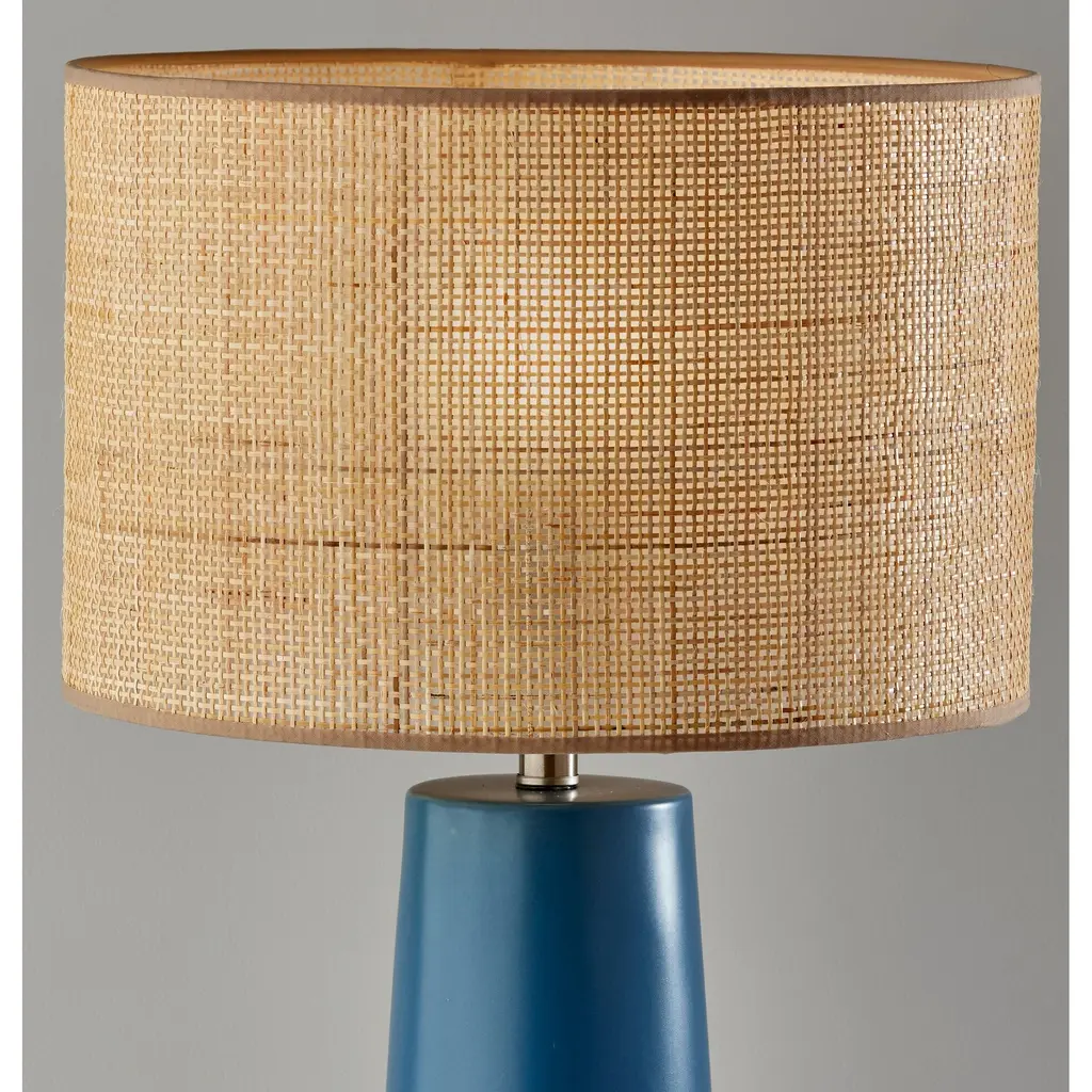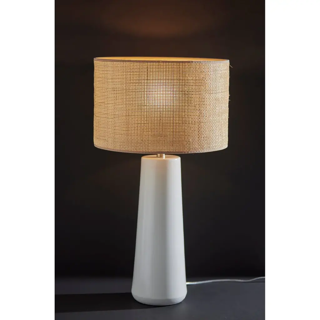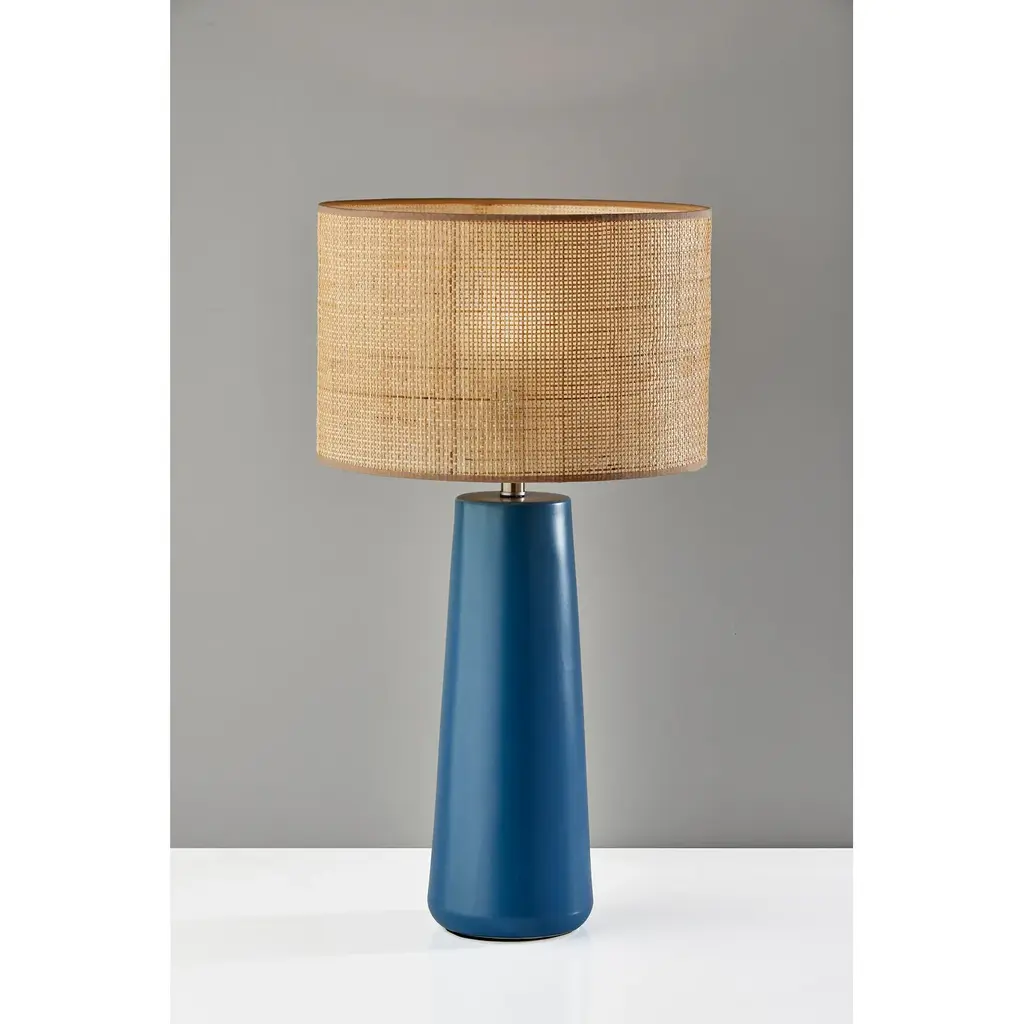 Defined by clean lines and rich materials, the Sheffield tall table lamp blends in seamlessly with farmhouse, contemporary, or coastal décor. An 18" tall cylindrical and gently tapering base crafted of black ceramic is topped by a woven natural rattan shade. The lamp shade softly disperses the light from a 150W bulb and is trimmed with black fabric along the top and bottom to match the black base. For versatile lighting options, a 3-way rotary socket switch easily adjusts the brightness between low, medium, high, and off. The Sheffield tall table lamp is also available with a white ceramic base for a monochrome look or with a cornflower blue ceramic base for a pop of color.