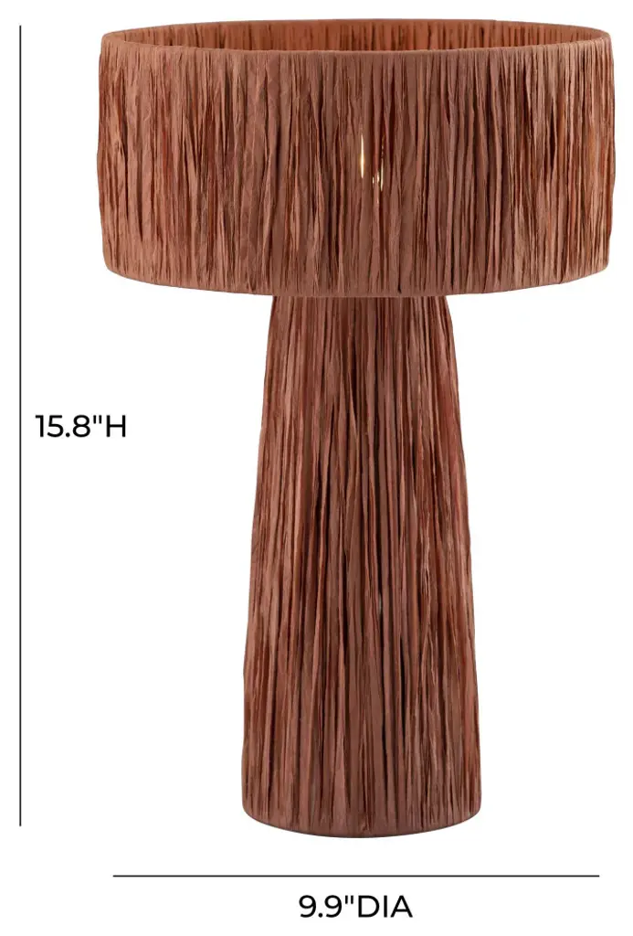 She''ll be your favorite piece in your home, we promise! The Shelby Rafia Table Lamp is the perfect accessory to your safari chic vibe. Crafted from raffia and iron and available in brick, black and natural to suit your color scheme.Handmade by skilled craftsmenCord length is 98 InchesRequires 1 Type A bulb - not includedMax 40 wattLED compatible - max 7 wattUL and cUL certifiedProduct Color : BrickProduct Materials : RaffiaOverall Product Dimensions : 9.85"W x 9.85"D x 15.75"HProduct Weight : 1.2 LBs