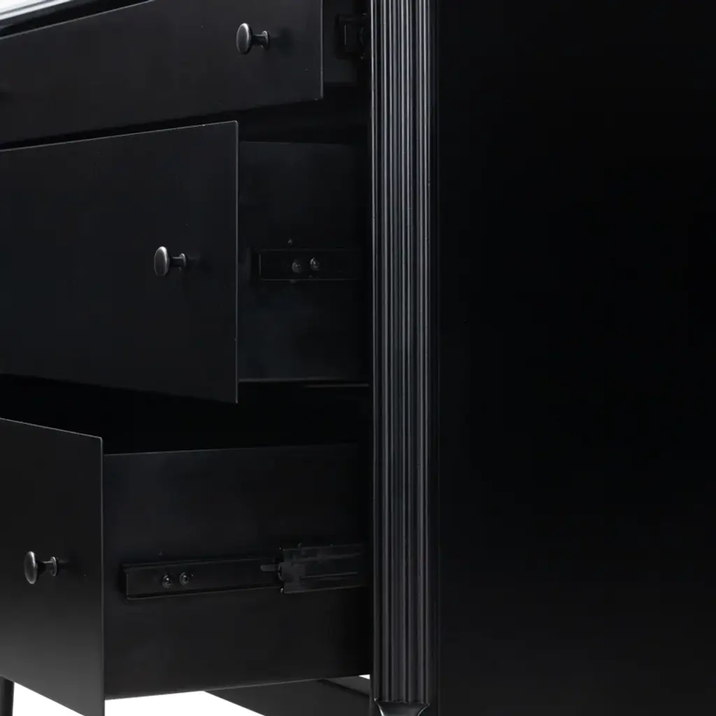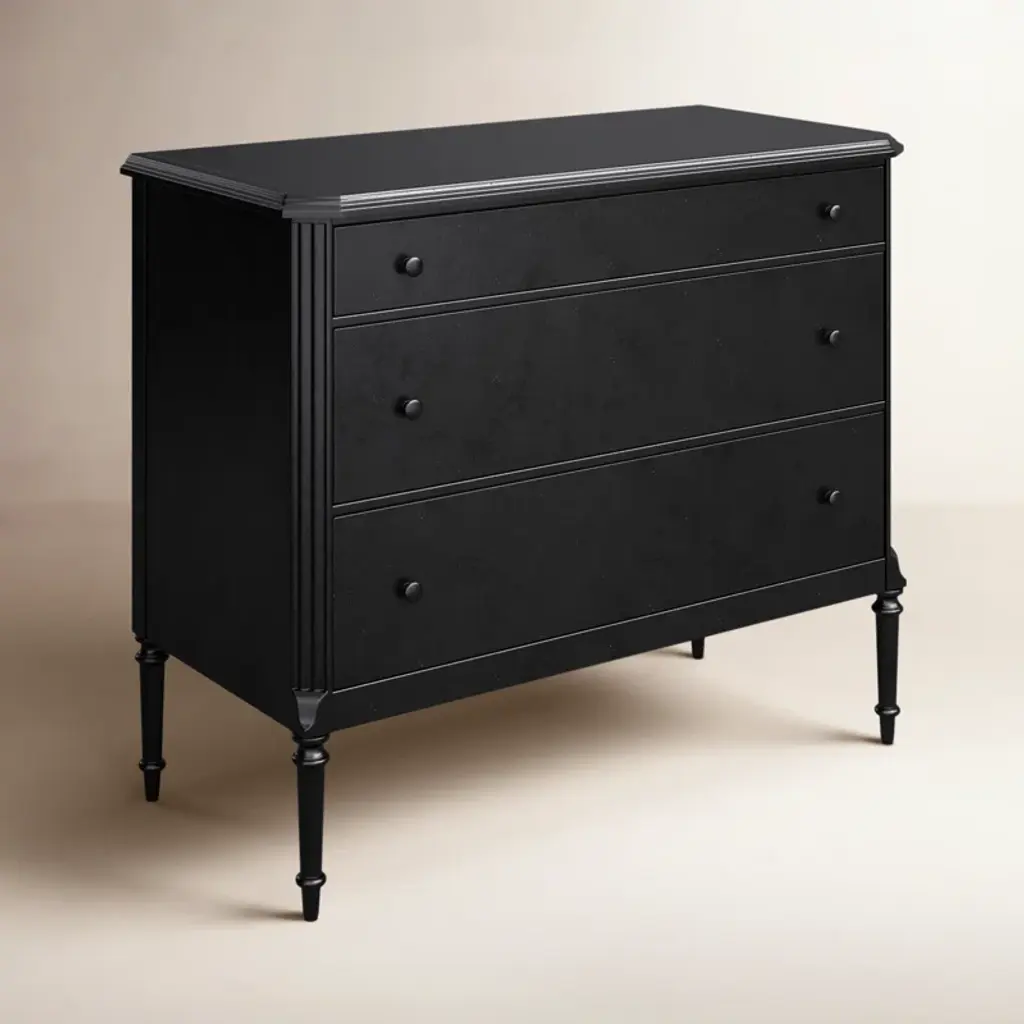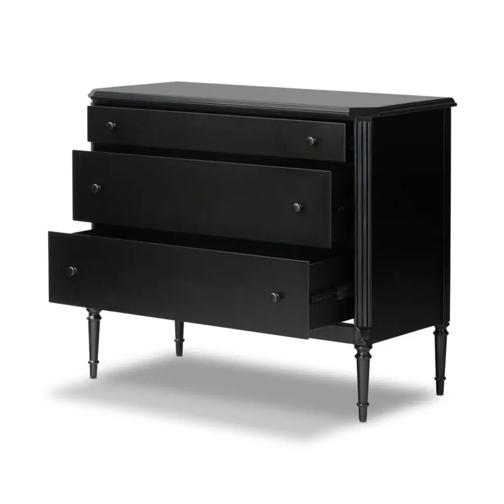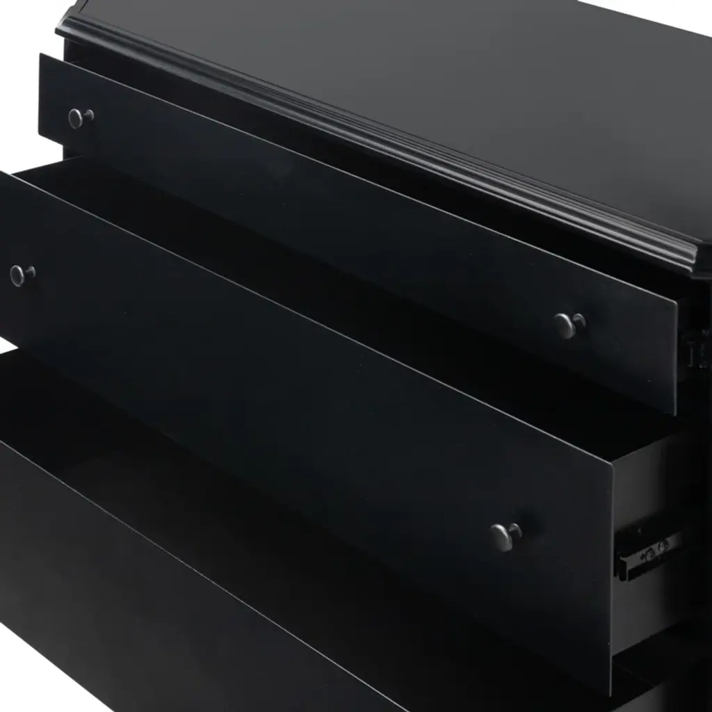 This French-inspired metal dresser brings an elegant look to your bedroom or guest room with its turned leg detailing and classic molding. Crafted from iron in a matte black finish, it features an ogee edging on top for added sophistication. The dresser has three spacious drawers that open and close on smooth side-mount metal glides, providing ample storage for your clothing, delicates, and accessories. And the black knobs round out this design. Plus, there's space on the surface for a small table lamp and accent pieces. A tip-over restraint device is included.
