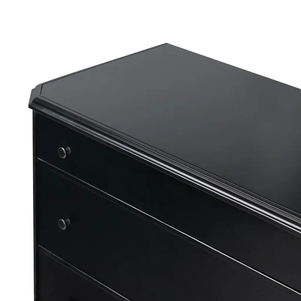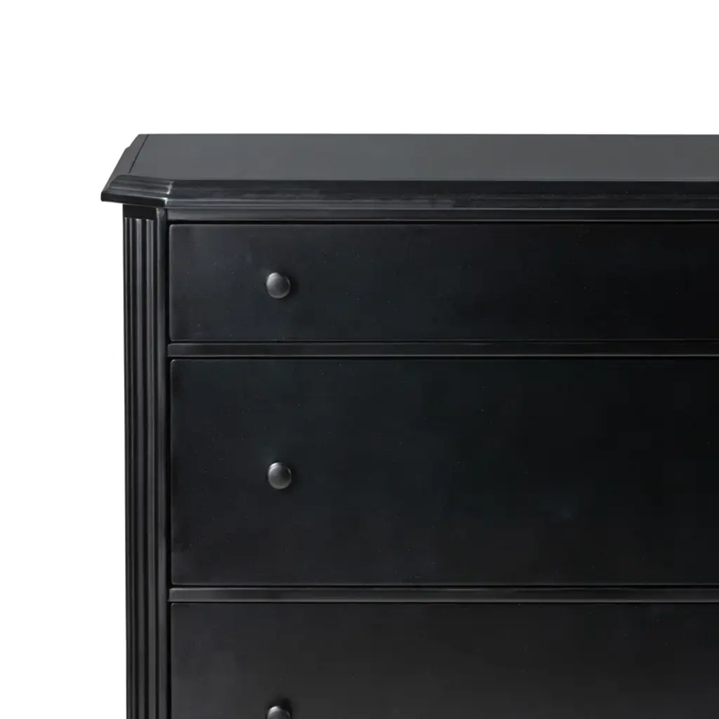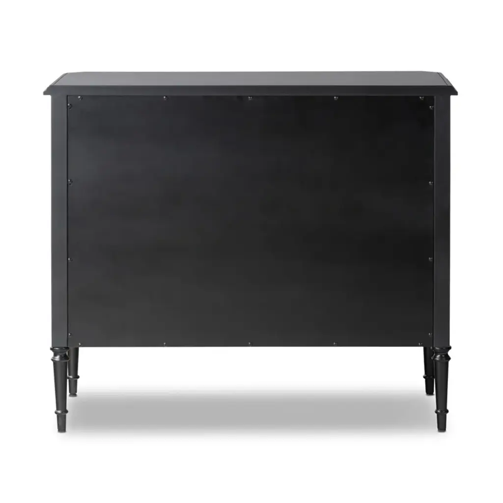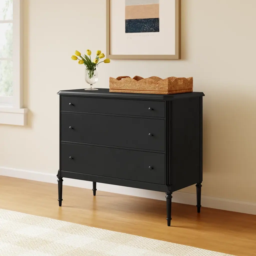 This French-inspired metal dresser brings an elegant look to your bedroom or guest room with its turned leg detailing and classic molding. Crafted from iron in a matte black finish, it features an ogee edging on top for added sophistication. The dresser has three spacious drawers that open and close on smooth side-mount metal glides, providing ample storage for your clothing, delicates, and accessories. And the black knobs round out this design. Plus, there's space on the surface for a small table lamp and accent pieces. A tip-over restraint device is included.