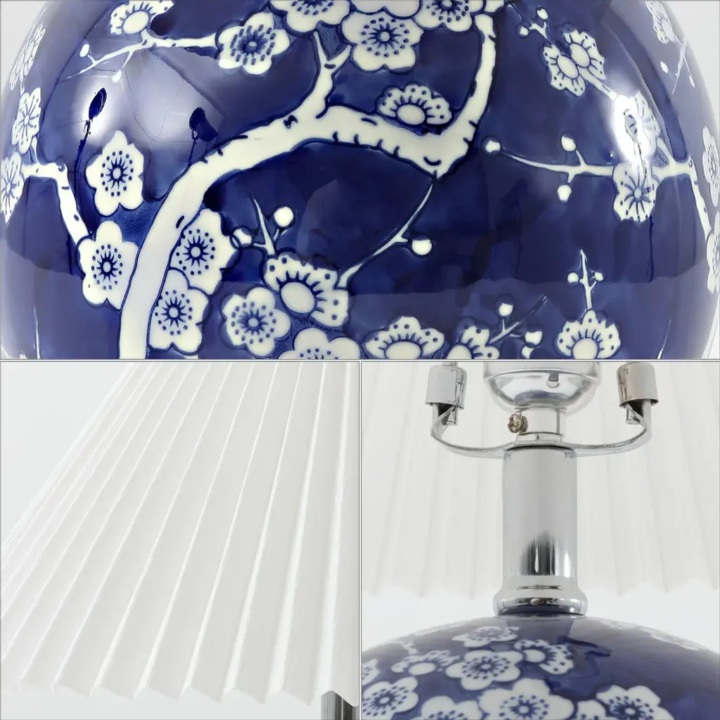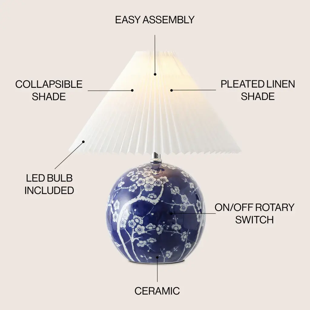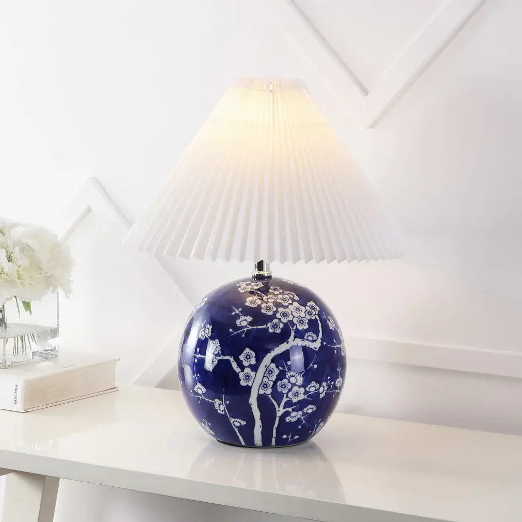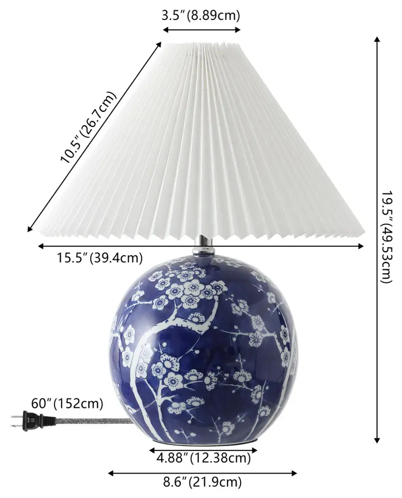 Our classic take on Chinoiserie features a traditional hand-painted floral design on a round ceramic lamp base. This timeless lamp features a tapered, pleated shade for cottage-inspired style. Try a pair of these stylish lamps in a bedroom, living room, or dining room.-Ceramic lamp features hand painted white blossom design on a navy background-Quality touches include a silk-wrapped cord, rotary switch and traditional pleated lampshade-Chinoiserie design fits beautifully into traditional, coastal and shabby chic interiors-Eco-friendly 5W LED bulb included-Takes 1 bulb and compatible with TYPE "A" 60W or CFL 13W or LED 9W-Color Temperature: 2700K-CRI: 80-Color: Navy/White With White Pleated Shade-Body Material: Ceramic--Finial Material: Metal-Finial Color: Chrome-Harp Color: Silver-Includes: One (1) lamp-Assembly Required-Lamp: 19.5 inches high x 15.5 inches wide x 15.5 inches deep-Shade: 10.5 inches high x 15.5 inches wide x 15.5 inches deepYou see a lamp.We see a decorative work of art.A perfectly curved shade casts a dramatic shadow on a floor. A silk cord you never want to hide. Compatible with LED lightbulbs: as easy on the environment as they are on the eyes. The JONATHAN Y Lighting collection considers every detail from impeccably sourced materials to designer styling. And our prices are so attractive, weuve transformed a functional necessity into a fashion accessory.JONATHAN Y Lighting - a fashion revolution in home decor.