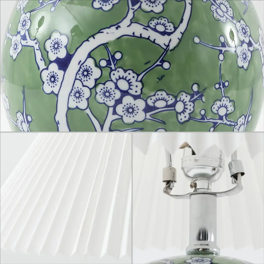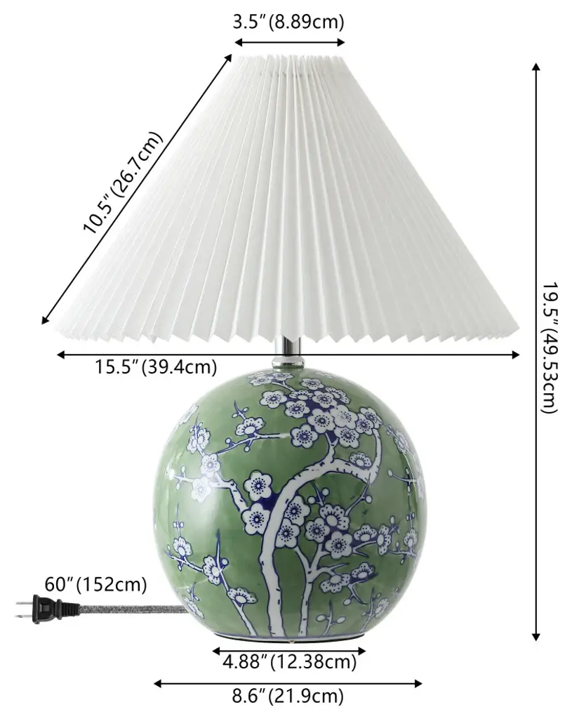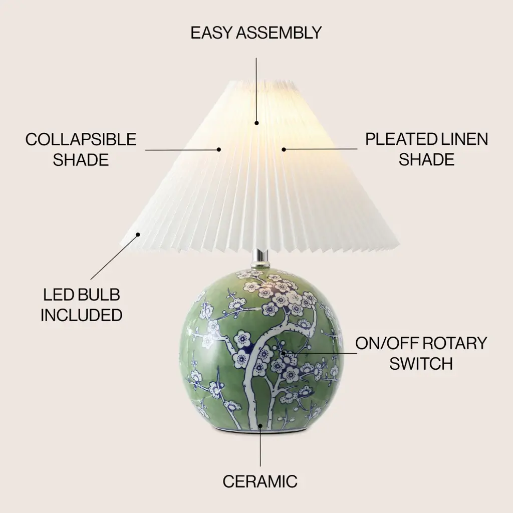 Our classic take on Chinoiserie features a traditional hand-painted floral design on a round ceramic lamp base. This timeless lamp features a tapered, pleated shade for cottage-inspired style. Try a pair of these stylish lamps in a bedroom, living room, or dining room.-Ceramic lamp features hand painted white blossom design on a green background-Quality touches include a silk-wrapped cord, rotary switch and traditional pleated lampshade-Chinoiserie design fits beautifully into traditional, coastal and shabby chic interiors-Eco-friendly 5W LED bulb included-Takes 1 bulb and compatible with TYPE "A" 60W or CFL 13W or LED 9W-Color Temperature: 2700K-CRI: 80-Color: Green/White With White Pleated Shade-Body Material: Ceramic--Finial Material: Metal-Finial Color: Chrome-Harp Color: Silver-Includes: One (1) lamp-Assembly Required-Lamp: 19.5 inches high x 15.5 inches wide x 15.5 inches deep-Shade: 10.5 inches high x 15.5 inches wide x 15.5 inches deepYou see a lamp.We see a decorative work of art.A perfectly curved shade casts a dramatic shadow on a floor. A silk cord you never want to hide. Compatible with LED lightbulbs: as easy on the environment as they are on the eyes. The JONATHAN Y Lighting collection considers every detail from impeccably sourced materials to designer styling. And our prices are so attractive, weuve transformed a functional necessity into a fashion accessory.JONATHAN Y Lighting - a fashion revolution in home decor.