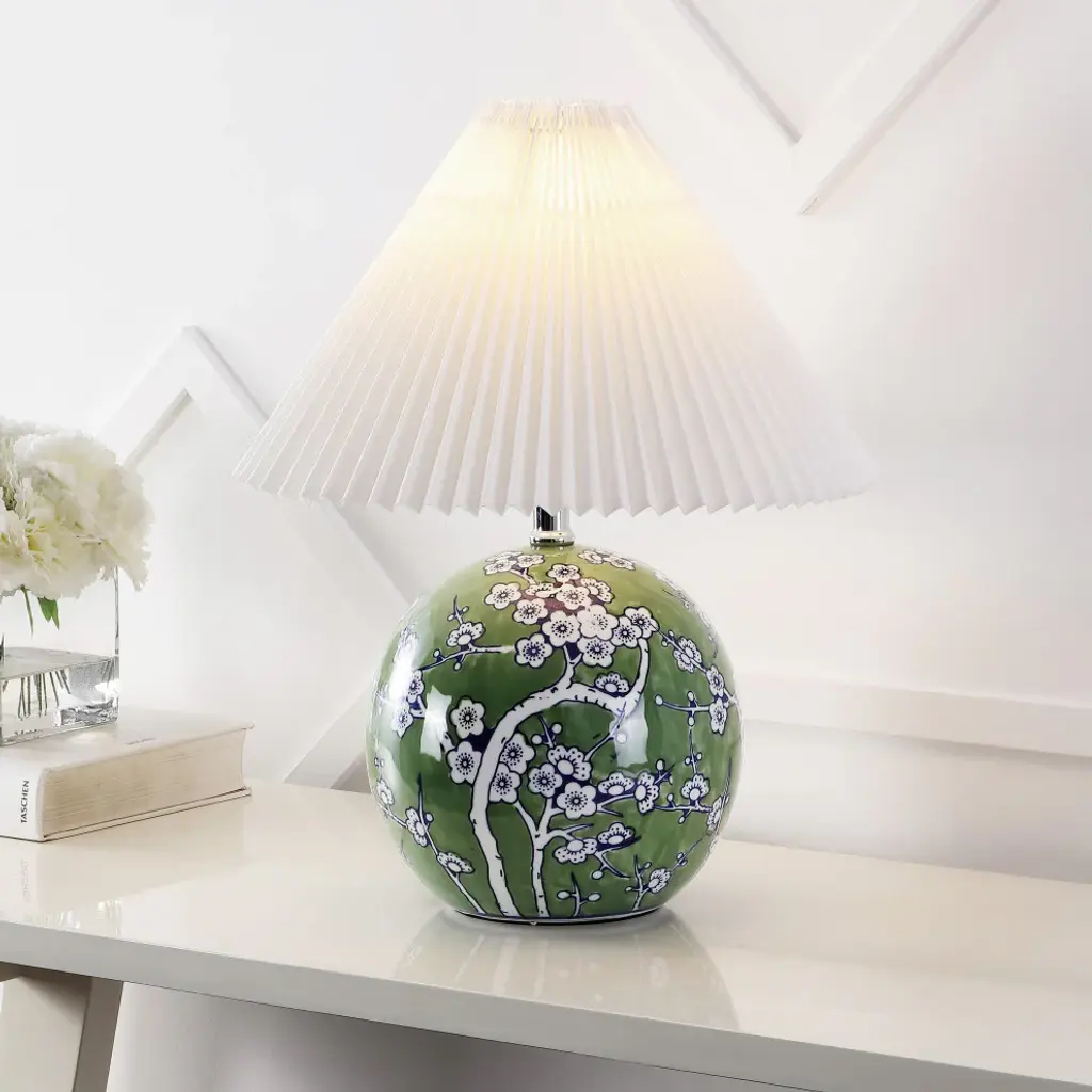 Shishen Cottage Classic Chinoiserie Ceramic Orb Led Table Lamp, Pleated Shade
