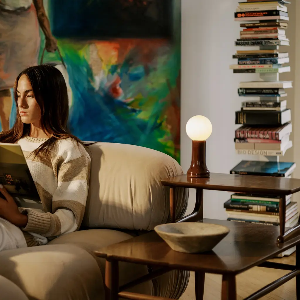 Mouth-blown from recycled glass, Shore’s fluted base is paired with a spherical matte-white bulb and in-line dimmer, enhancing Tala’s unrivaled Dim to Warm technology. Available in a choice of 3 color finishes with a high-gloss sheen, the lamp makes for a charming bright spot on a small table or sideboard.