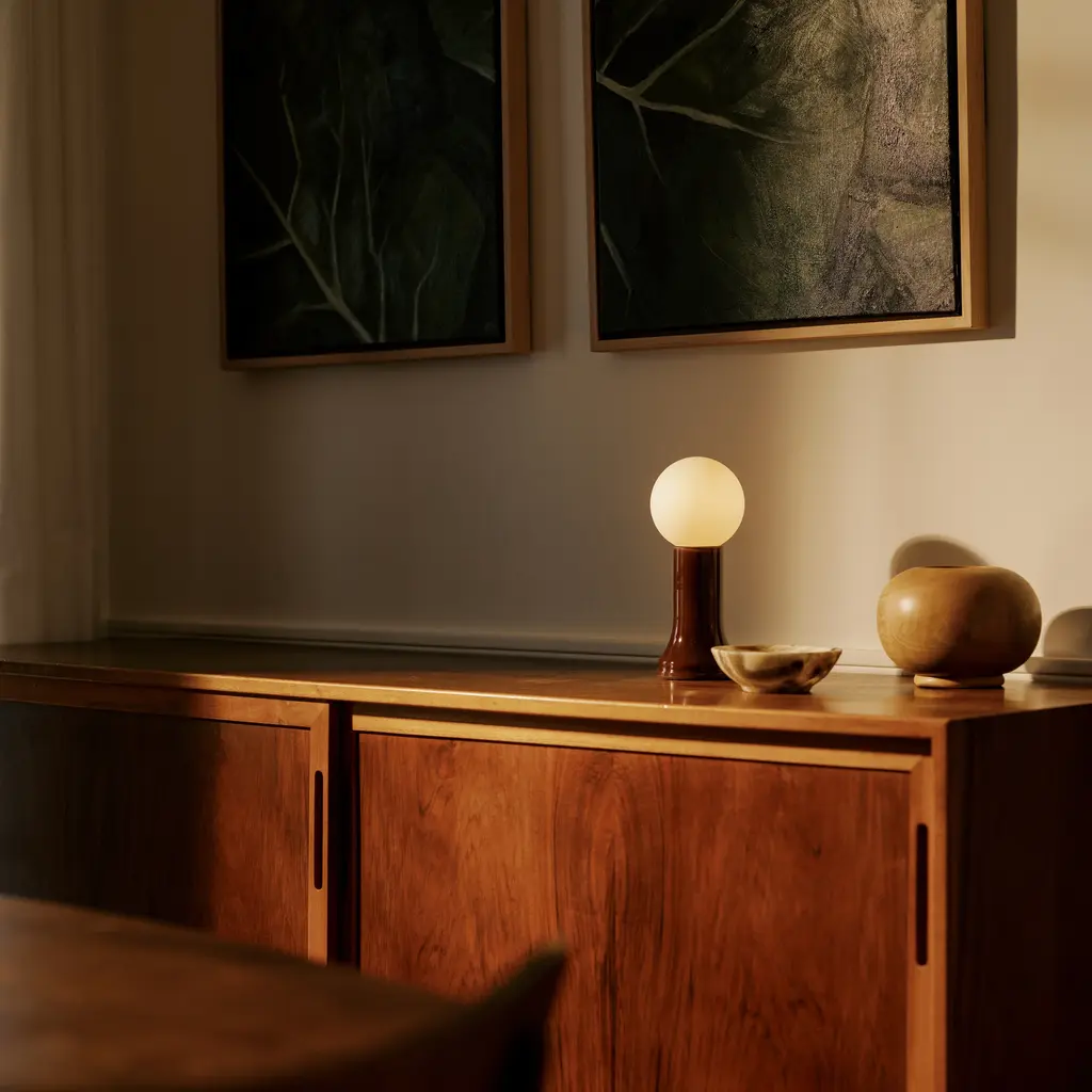 Mouth-blown from recycled glass, Shore’s fluted base is paired with a spherical matte-white bulb and in-line dimmer, enhancing Tala’s unrivaled Dim to Warm technology. Available in a choice of 3 color finishes with a high-gloss sheen, the lamp makes for a charming bright spot on a small table or sideboard.