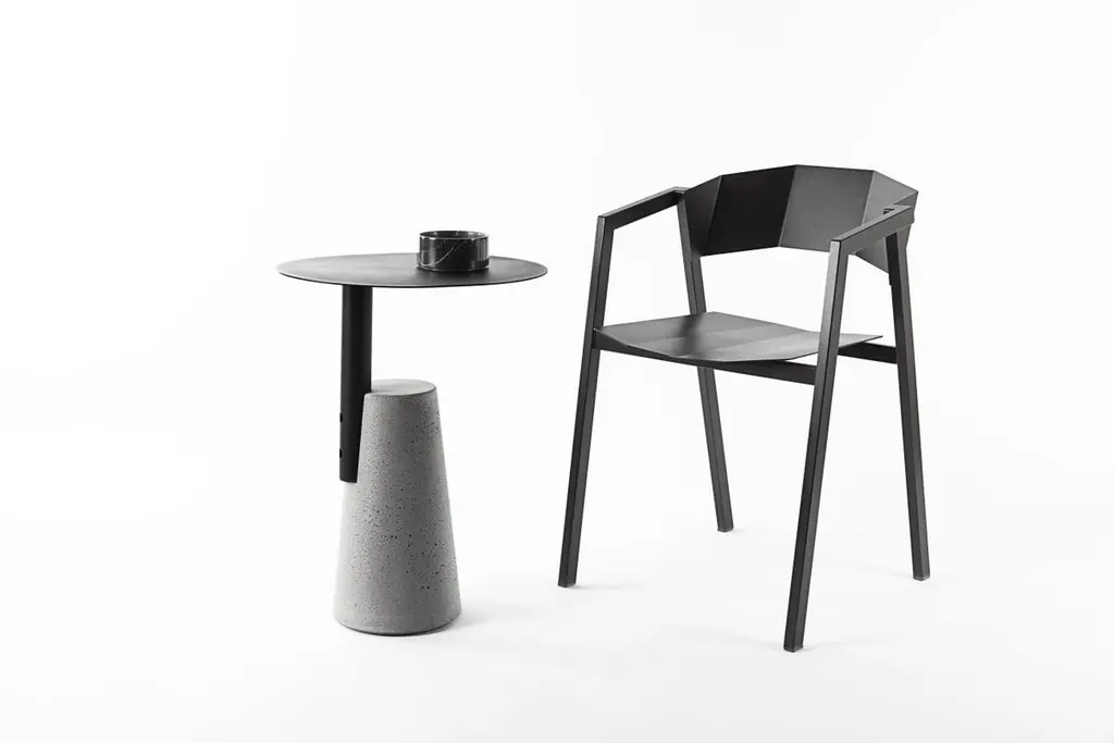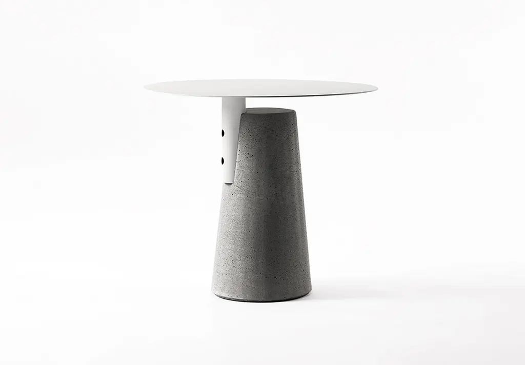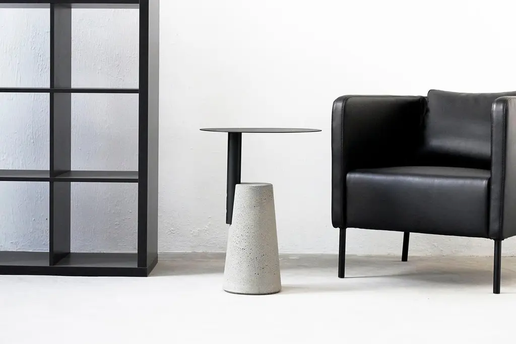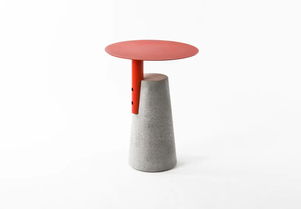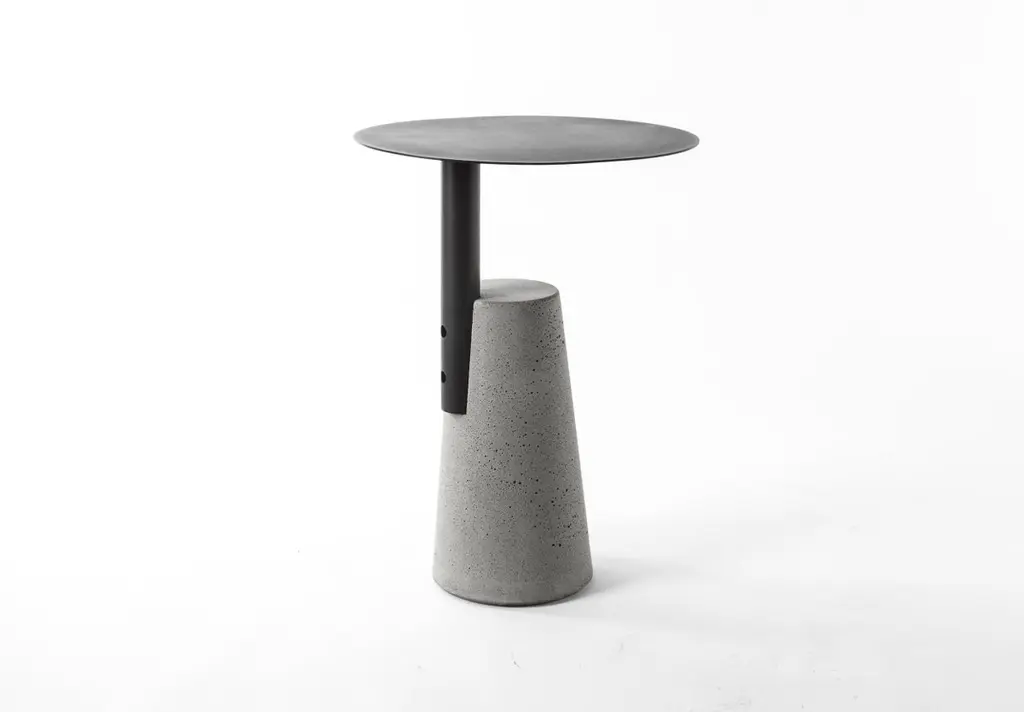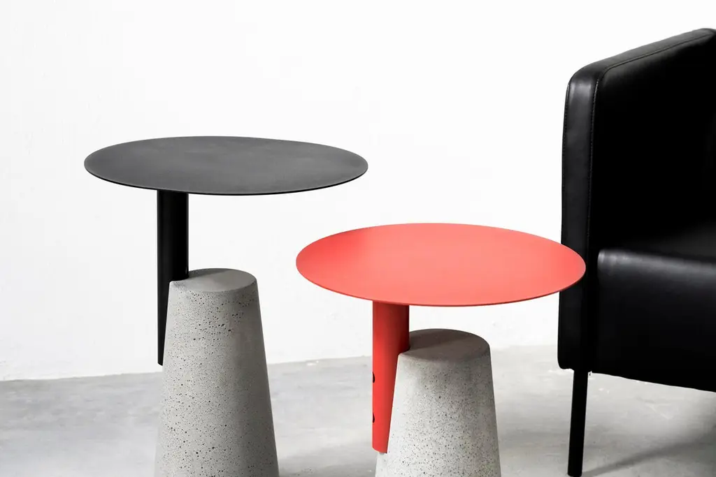 'BAI' is a collection of side tableby Bentu designTabletop: steelTable base: concrete3 sizes available: - Small H 45 cm, D 50 cm- Medium H 52 cm, D 40 cm- Large H 60 cm, D 45 cm3 colors available: BlackWhiteRedBentu Design's furniture derives its uniqueness from the simplicity of its forms and its materials. Designed and manufactured by the designers of Studio Bentu themselves, these lamps, coffee tables, cup-boards and seats all have in common the use of concrete. This material that is usually reserved for construction use, finds here a certain nobility. The patterns that are created by the grains of this material once it flowed and unmolded is what gives the creations of Studio Bentu their originality. Accompanied at times finishing’s that are more valuable like marble or polished brass, making concrete a more suitable material for furniture.