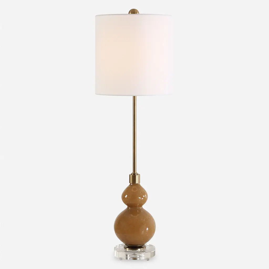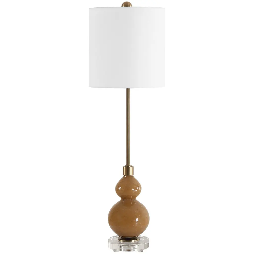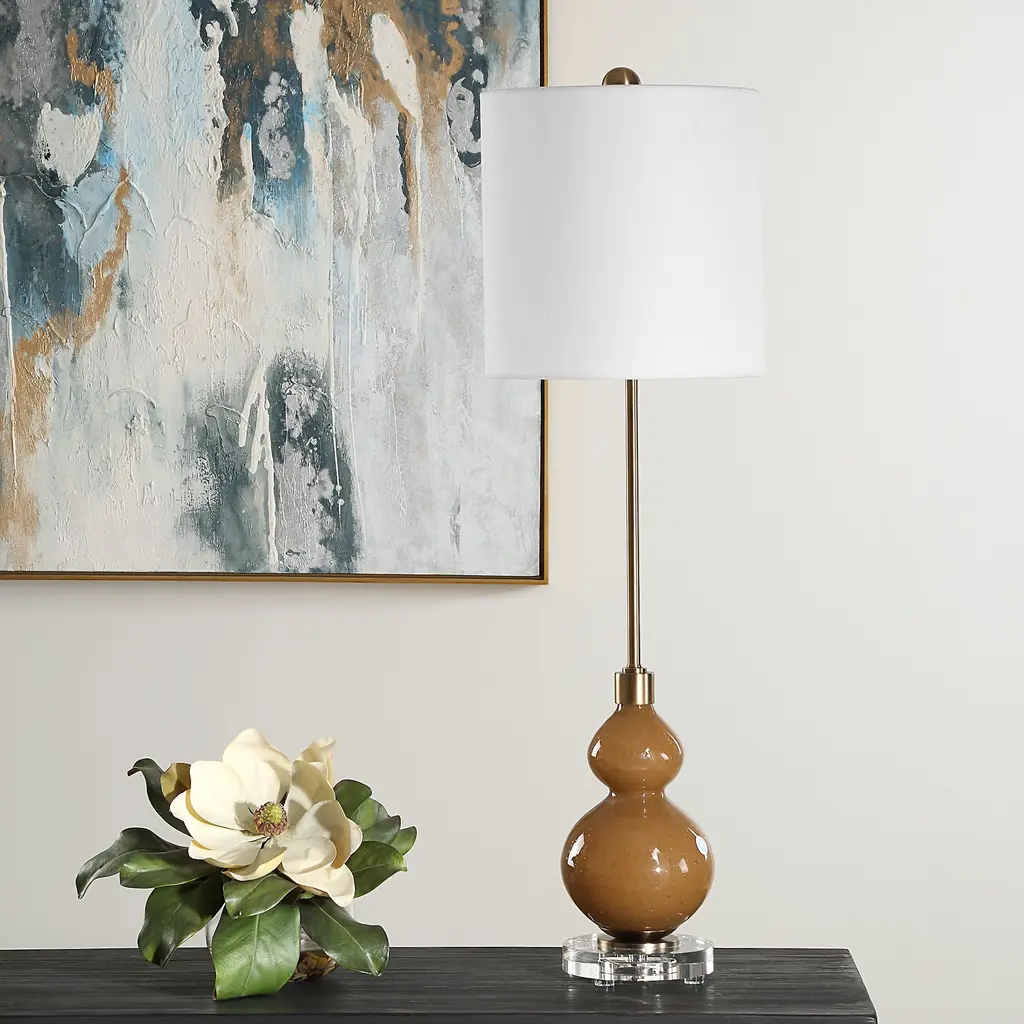 Where Elegance Meets Modern Sophistication, The Sienna Buffet Lamp Features A Caramel Brown, Seeded Glass Base. The Design Is Elevated With A Thick Crystal Foot And Accents Of Plated Brushed Antique Brass Hardware, Adding A Touch Of Refined Luxury To Any Setting. The Round Drum Hardback Shade Is Covered In A White Linen Fabric.