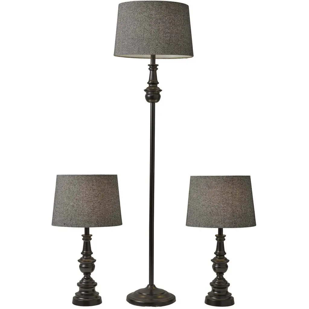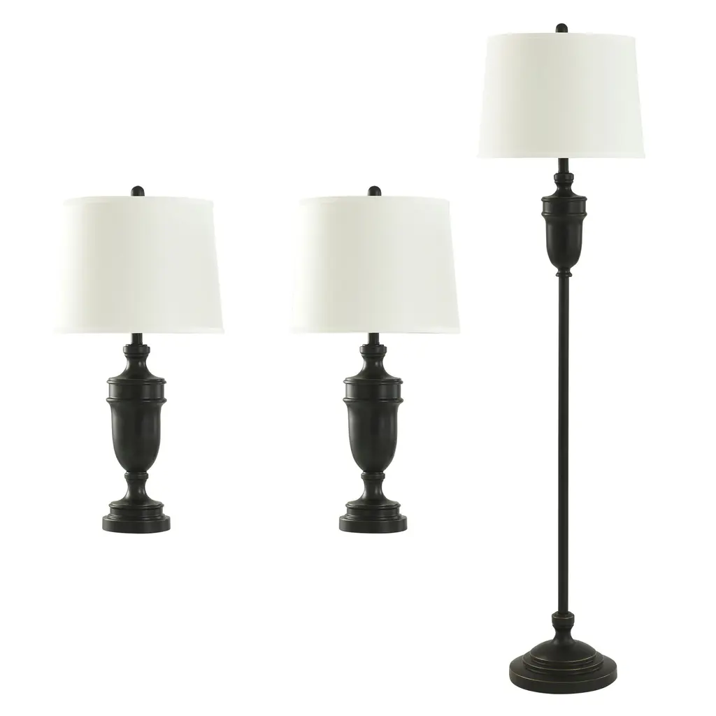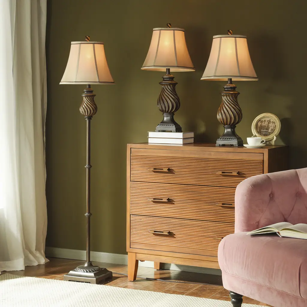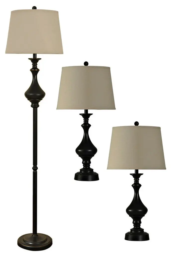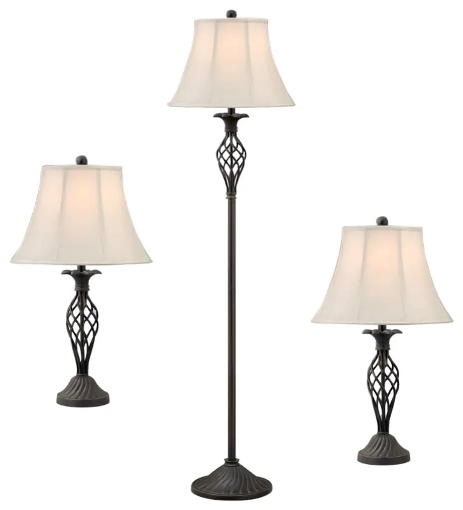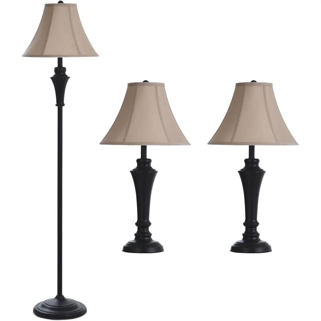 Table Lamp - Toffee Finish - Natural Linen Fabric Shade - Set Of 3; 2 Table, 1 Floor