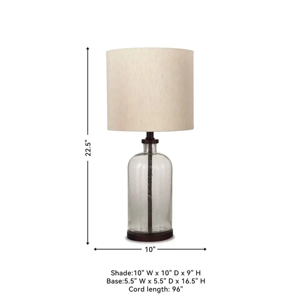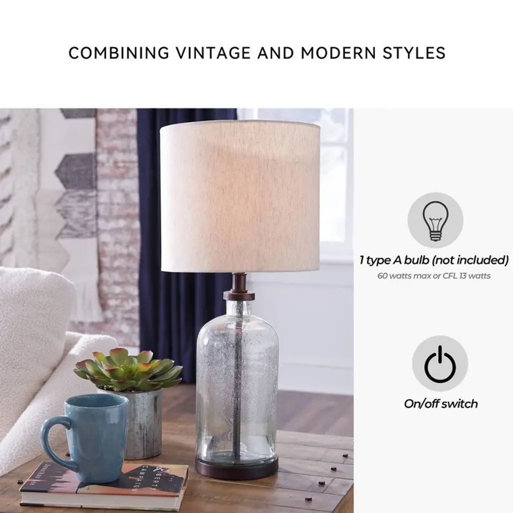 At home in urban industrial or modern farmhouse settings, this seeded glass lamp illuminates a cool vibe in any space. The bronze-tone finish gives this piece a vintage slant while the drum shade provides the clean, modern lines you want. Clear seeded glass and bronze finished metal table lamp. Drum hardback shade. On/off switch. (1) E26 socket, type A bulb recommended - 60 watts max or 13 watts max CFL. Signature Design by Ashley is a registered trademark of Ashley Furniture Industries, Inc.