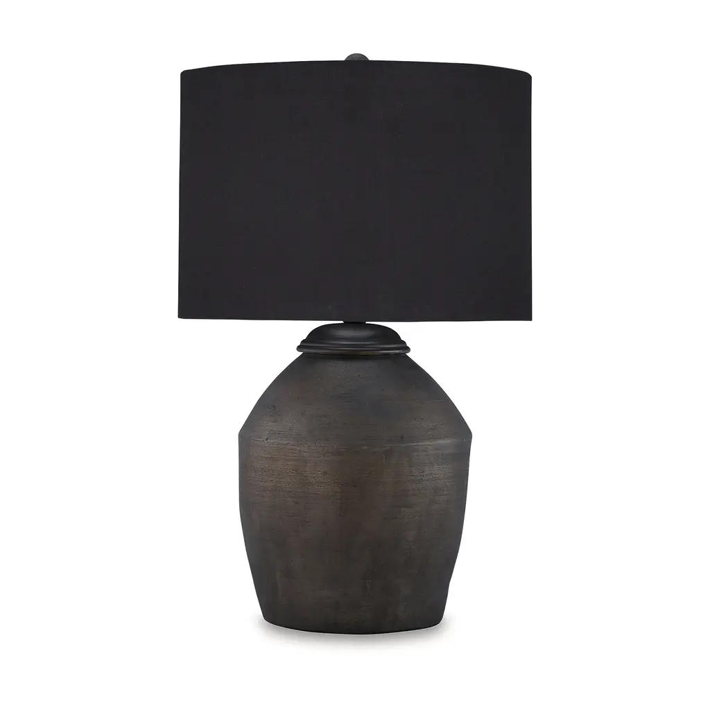 Add a touch of casual elegance to your home with this table lamp. Its stunning metallic black finish over terra cotta offers a striking effect. This lamp exudes an informal yet stylish aesthetic, creating the ideal lighting accent for casual spaces. Just brilliant.Features:Made of terra cotta with drum hardback fabric shadeMetallic black finishDue to the finishing process of this product, some variations may occur3-way switch1 E26 socket, type A bulb recommended (not included); 150 watts max or CFL 25 watts max; UL ListedAssembly required