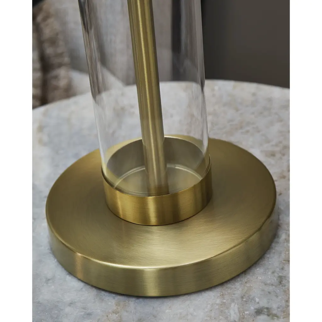 The body of this elegant table lamp has a contemporary flair, with a transparent glass cylinder that reveals a brass-tone rod inside. It's a minimal design made for maximal illumination. Features: