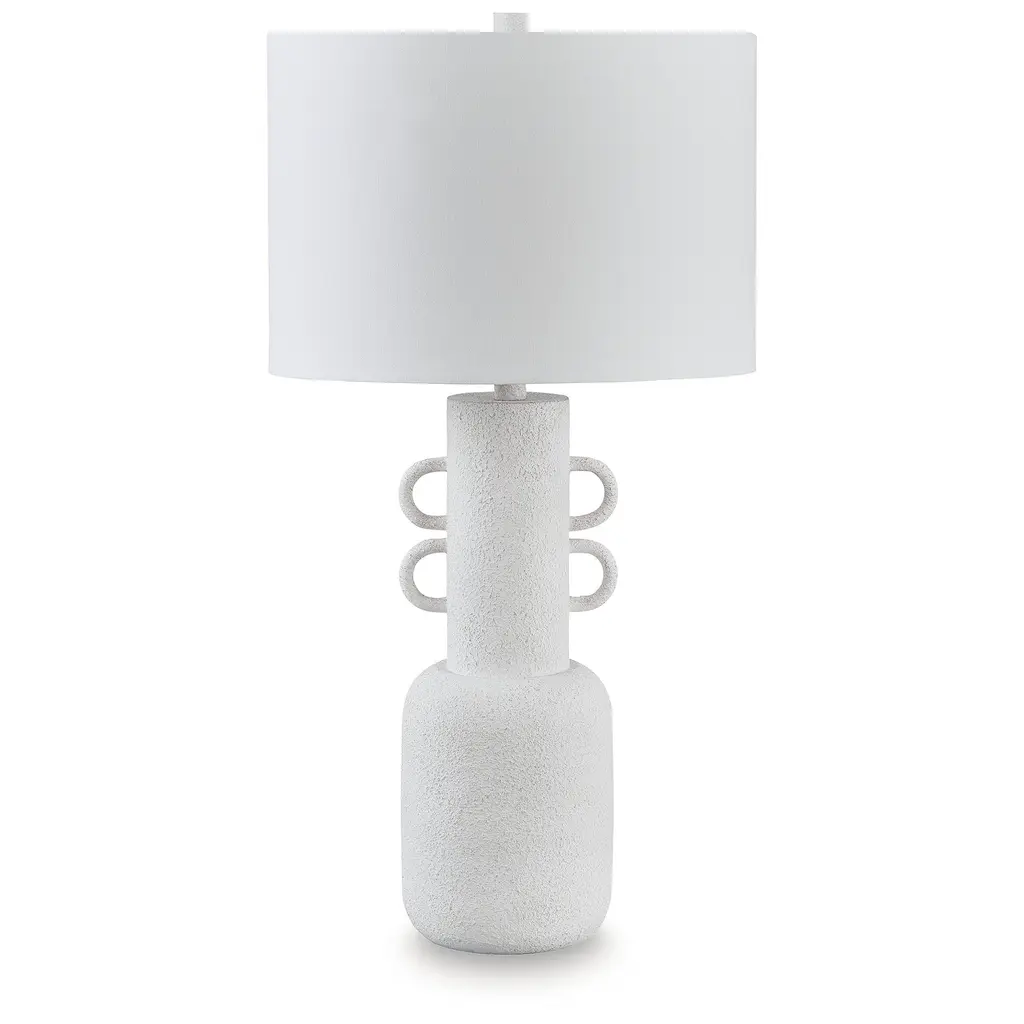 Brighten up your space with the handcrafted artisanal feel of this table lamp. A distressed white finish gives it an any-room neutrality, while the sculptural design elevates the look. Its casually chic approach to style is well-suited to vibes from modern farmhouse to coastal.Features:Made of metal with drum hardback fabric shadeDistressed white finish3-way switch1 E26 socket, type A bulb recommended (not included); 150 watts max or CFL 25 watts max; UL ListedDue to the finishing process of this product, some variations may occurAssembly required