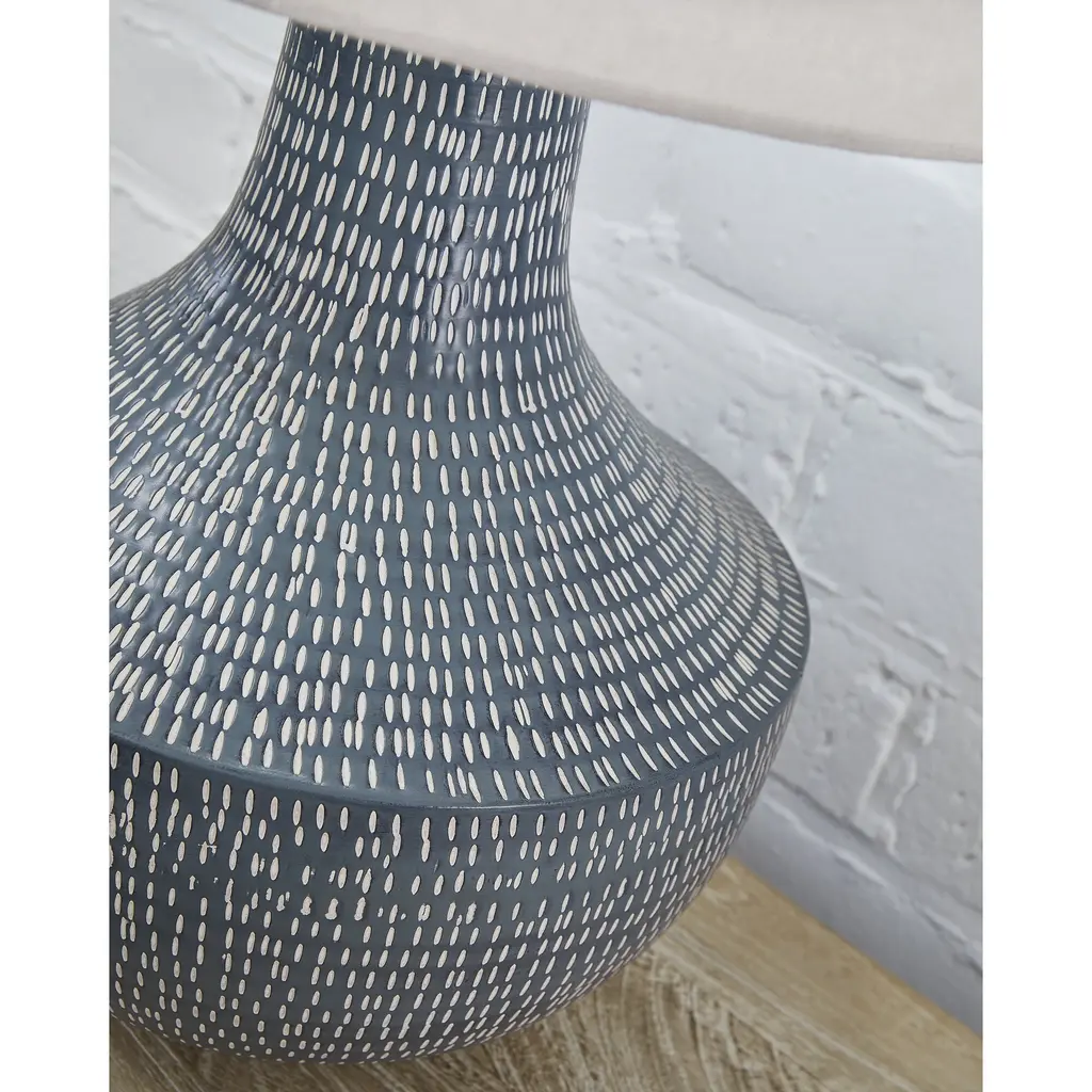 Enhance your decor with a touch of captivating texture. This table lamp features a beautifully crafted body made of hammered metal with an antiqued finish. Topped with a crisp off-white fabric shade, it illuminates a casual vibe with soft, diffused light. Create an inviting atmosphere and make every moment shine. Features: