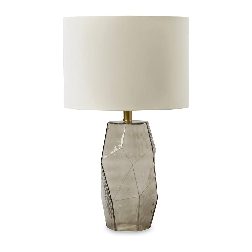 An elegant profile makes a simple yet stunning statement when viewed from any angle. This translucent glass table lamp, with its hexagon-shaped base, adds fluidity with a cool textured effect, providing an intriguing look for modern or transitional spaces.Features:Made of glass with drum hardback fabric shadeTransparent gray finish3-way switch1 E26 socket, type A bulb recommended (not included); 100 watts max or CFL 23 watts max; UL ListedAssembly required