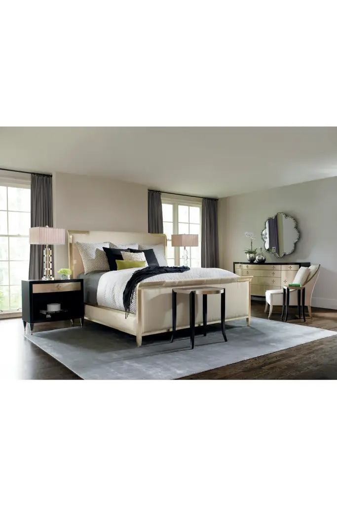 Designers love a nest of tables and with these, the possibilities are endless. The three tables are each a different size and shape. The largest table is a rectangular shape with a half circle on one side, which we thought would make it appropriate for a small lamp table. The middle table is round and the smallest table is a square. A slightly splayed Satin Ebony leg miters up into the Taupe Silver Leaf top for sharp architectural detail.