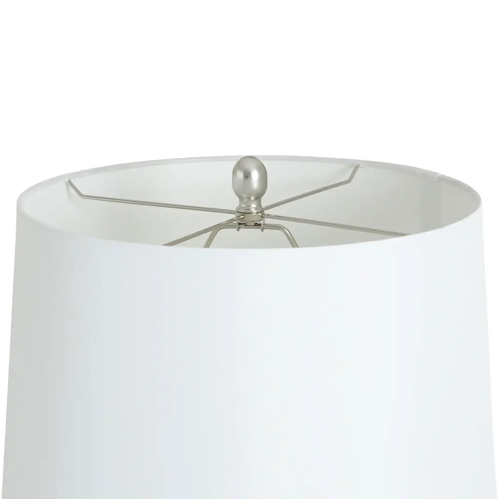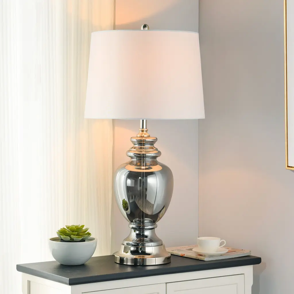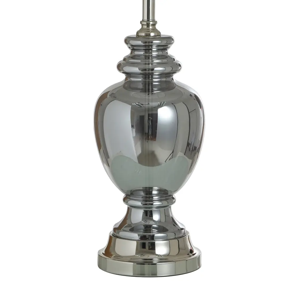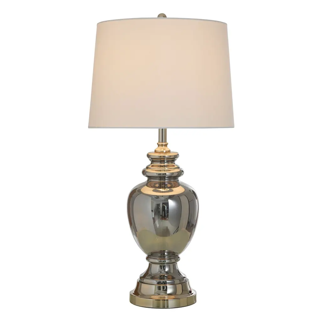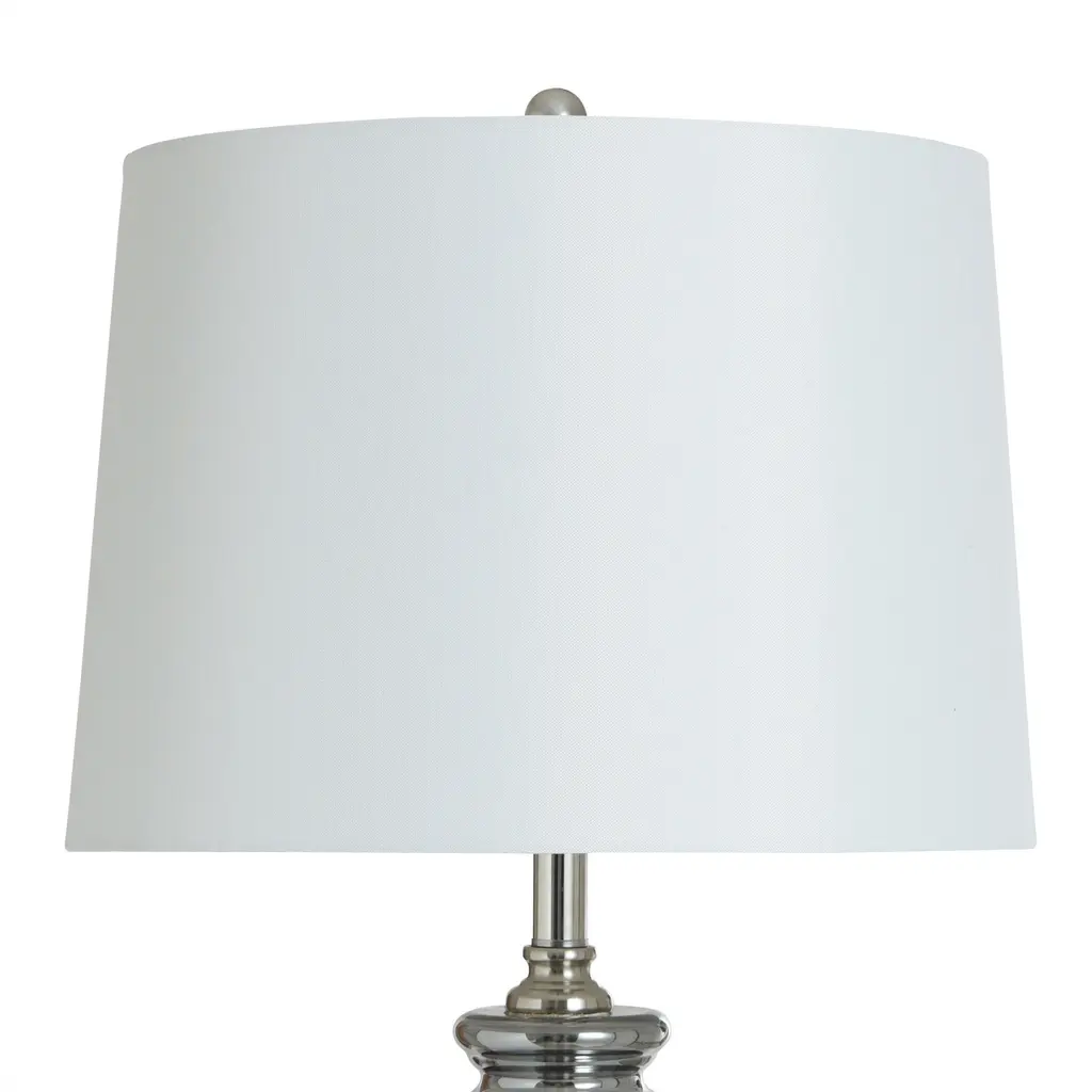 The Silver Mercury Table Lamp by StyleCraft balances a traditional profile with modern flair. Its translucent body is crafted in antiqued silver smoked glass with pewter accents, making this table lamp an attractive option for the living room, bedroom, or entryway.The body of this piece has an elegant shape created with a smokey gray glass that is somewhat transparent to expose the internal wiring bar.You're able to see the metal bar that the wiring flows through to the base but in a stylish way with its polished silver finish - also seen on all other metal aspects of this piece.Since this light has a 3 way switch capability, you're able to adjust the lighting to your personal needs.Due to the production process, each lamp will have a different finish and unique overall design - especially any glazed, painted, and oil rubbed designs.Material: Glass, Steel, LinenSwitch Type: 3 WaySwitch Location: NeckSystem Type: Plug-InDue to lighting and monitor differences, actual colors and finishes may vary slightly from what appears online.