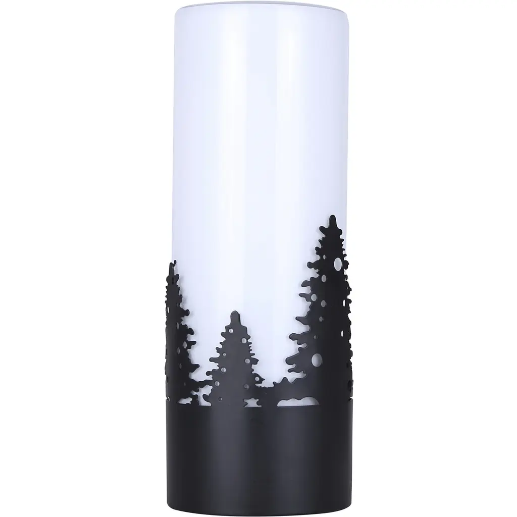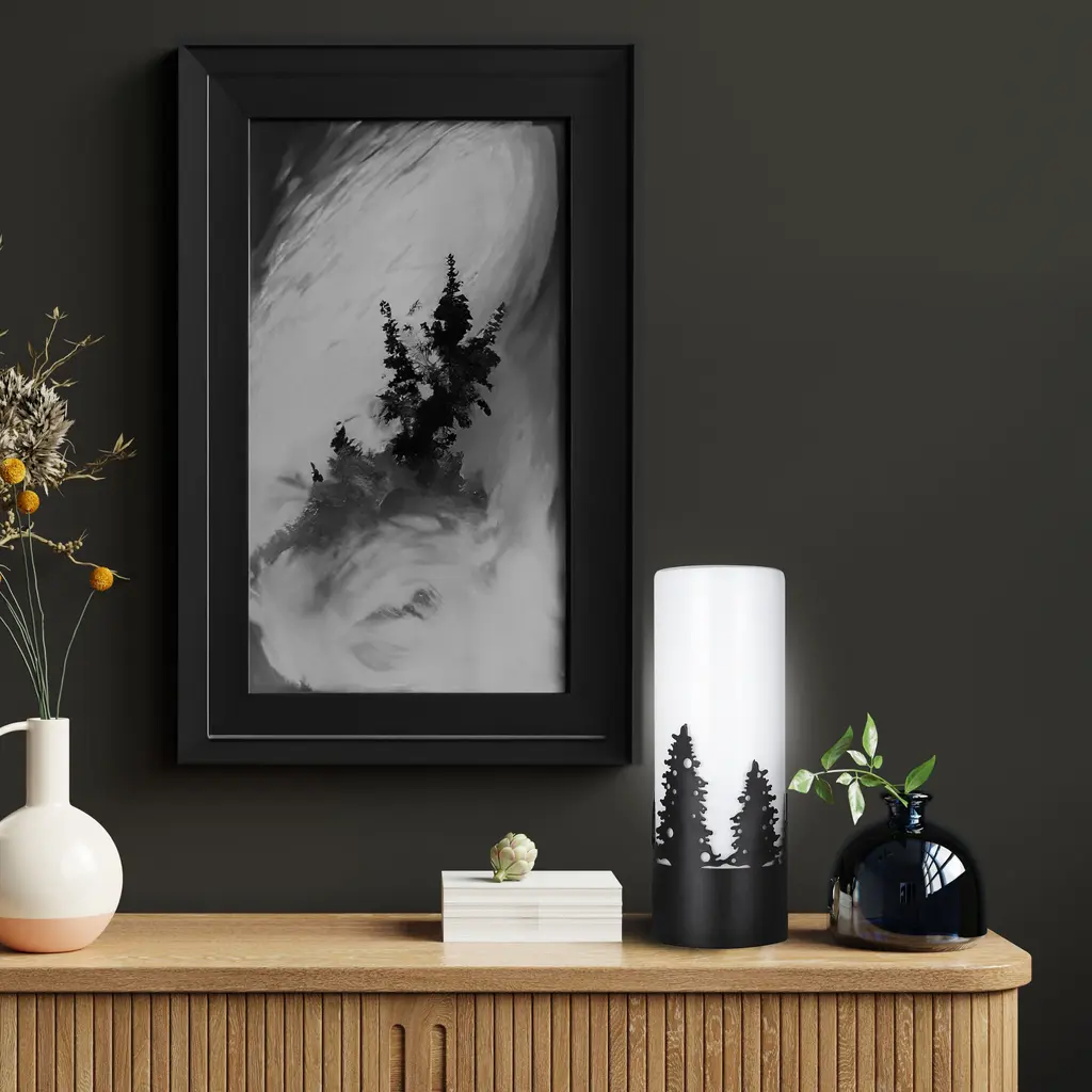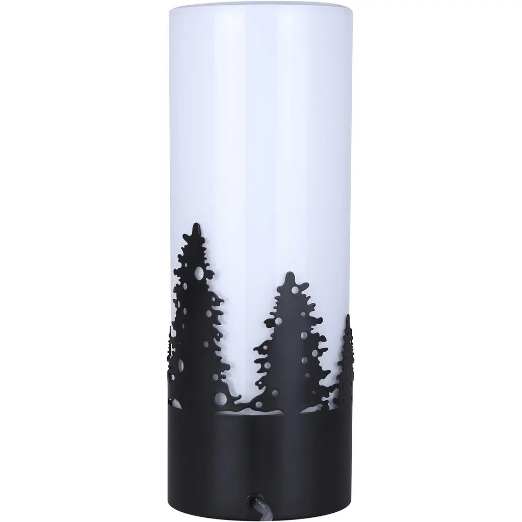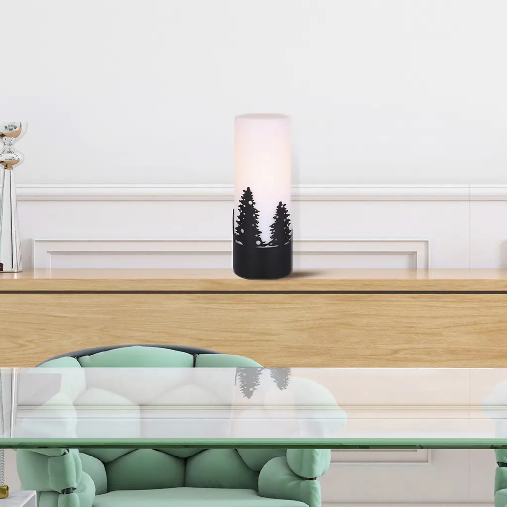 This exquisite lamp features intricate matte black tree designs that evoke a serene, nature-inspired aesthetic. The opal glass shade softly diffuses light, creating a warm and inviting ambiance perfect for any room. Measuring a compact 4 3/4 x 12 3/4 inches, it fits effortlessly on small tables, nightstands, or shelves. Designed for convenience, it uses a single 40W type A bulb and features a clear cord with an easy-to-use switch. Add a touch of elegance and tranquility to your home with this beautifully crafted lamp.