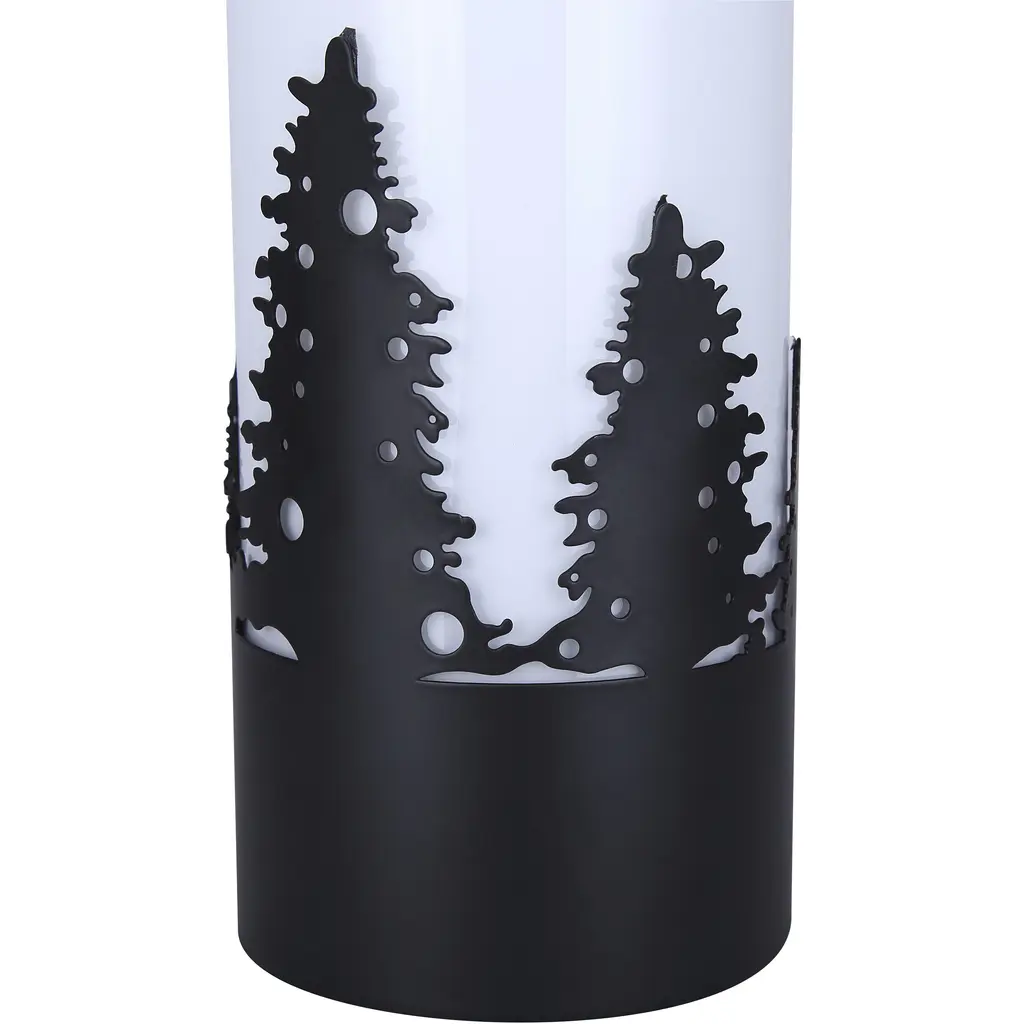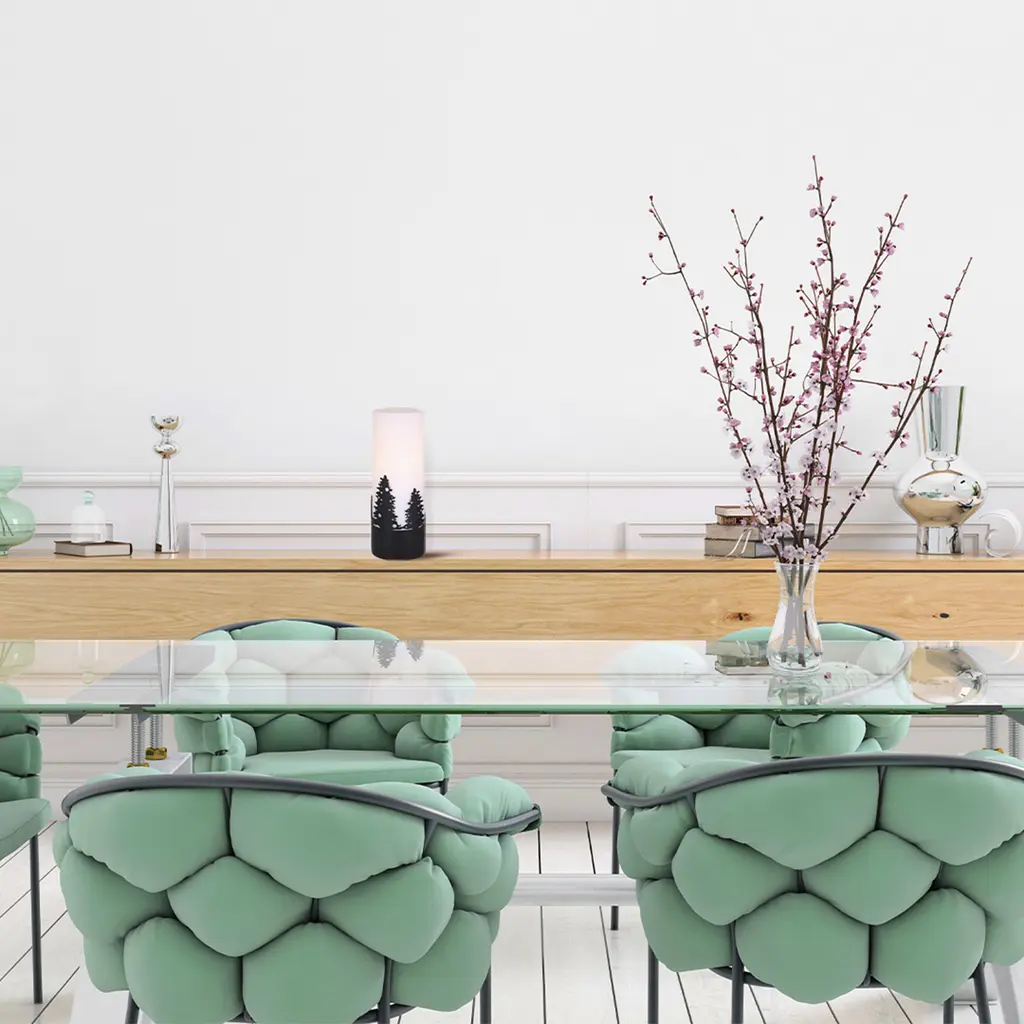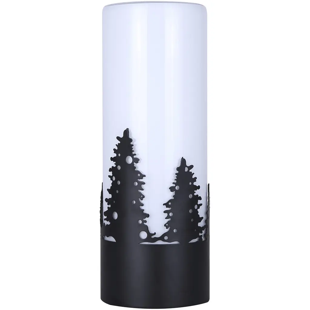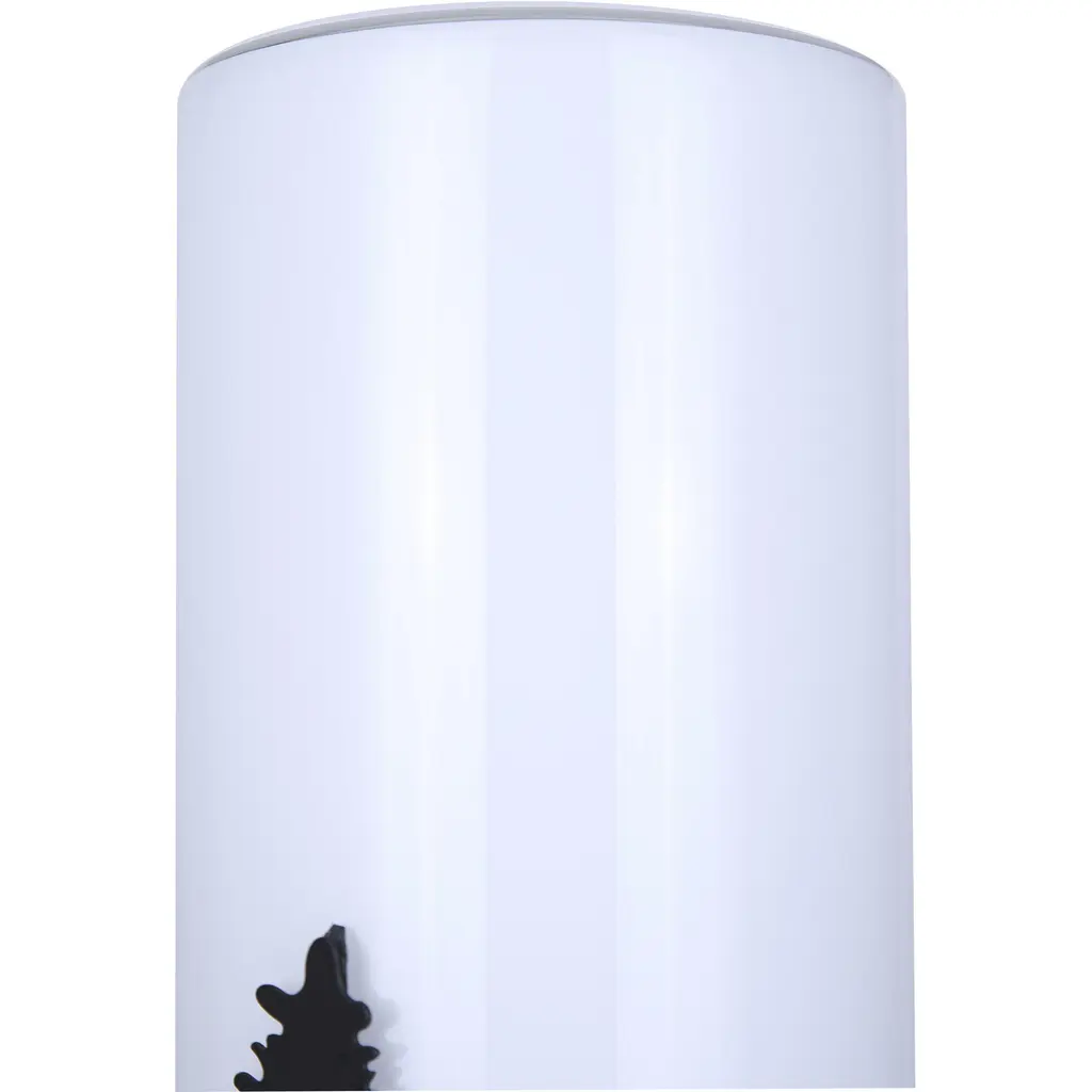 This exquisite lamp features intricate matte black tree designs that evoke a serene, nature-inspired aesthetic. The opal glass shade softly diffuses light, creating a warm and inviting ambiance perfect for any room. Measuring a compact 4 3/4 x 12 3/4 inches, it fits effortlessly on small tables, nightstands, or shelves. Designed for convenience, it uses a single 40W type A bulb and features a clear cord with an easy-to-use switch. Add a touch of elegance and tranquility to your home with this beautifully crafted lamp.
