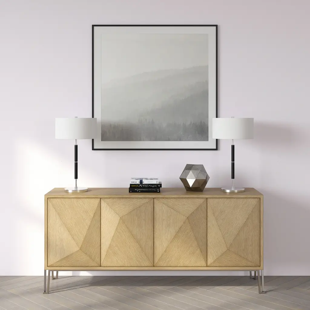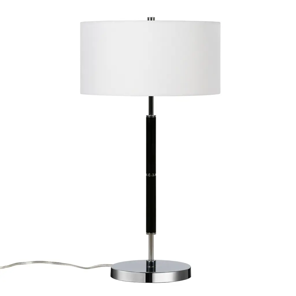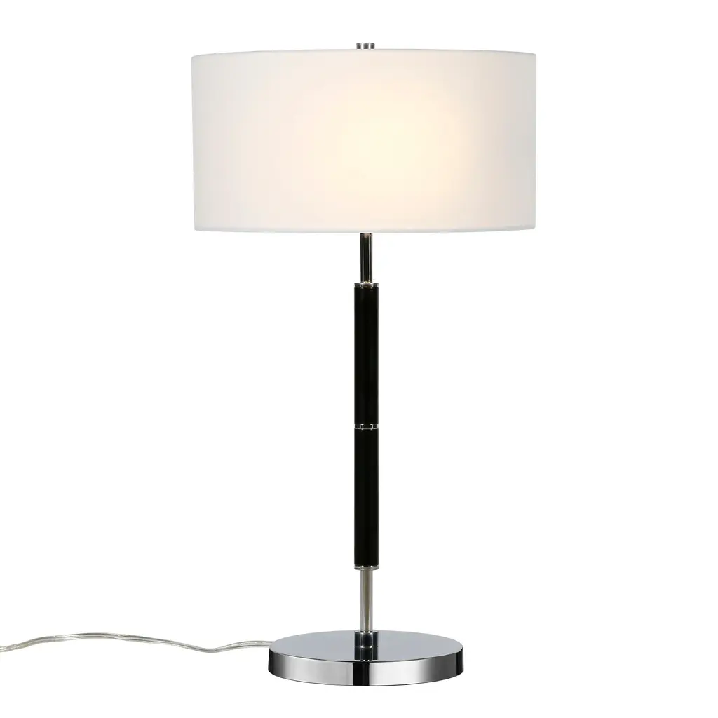 Brighten your space with the contemporary charm of this industrial-inspired table lamp. The lamp is crafted from steel in your choice of finishes, and features a second, complementary tone along the center column. The fabric drum shade with chiffon white color and polystyrene lining adds modern appeal to this beautiful lamp.Features:
