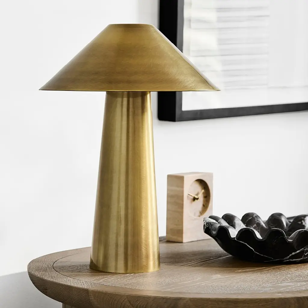Crafted in clean-lined steel with a warm Antique Brass finish, our Simone table lamp balances elemental beauty with a sculptural aesthetic. Its cordless, rechargeable design with remote control offers portability, while its shade includes a diffuser to soften and spread light, reducing glare and creating ambience.