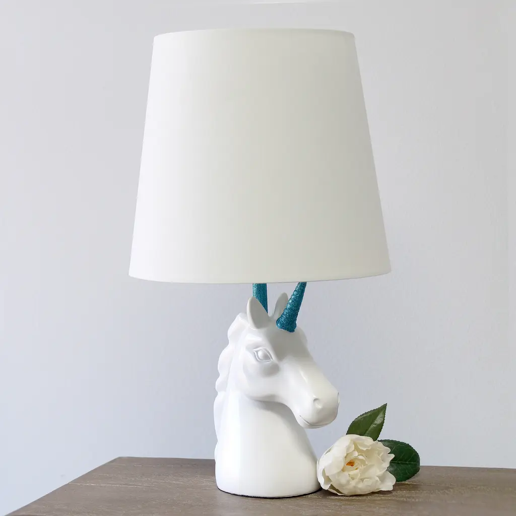Add a touch of personality to your décor with this fun unicorn lamp! With a white resin base and touches of shimmering blue glitter this lamp is sure to illuminate any room in style. Perfect for bedrooms, kids and teens, college dorms or nurseries!