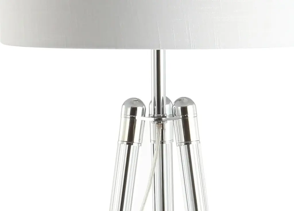 Simple Designs Brushed Nickel Tripod Table Lamp with Pleated Silk Sheer Shade.This fashionable table lamp, with its brushed nickel tripod base and pleated silk band sheer fabric shade, will add style and pizazz to any room. We believe that lighting is like jewelry for your home. Our products will help to enhance your room with elegance and sophistication.Pleated sheer silk band fabric shadeTrendy brushed nickel tripod basePerfect for living room, bedroom, office, kids room, or college dormHeight: 19.69" Shade Diameter: 11.81"UL PartsBulb Type: IncandescentSwitch Type: RotarySwitch Location: CordShade Height/Slant: 7"Shade Security: Socket NutNumber of Lights: 1Maximum Wattage: 60Shade Material: FabricCord Color: WhiteFinish/Color: Brushed Nickel/WhitePrimary Material (Leather, Metal, Wood): MetalBase Type: E26 Medium BaseBulb Included: NoWe don''t sale in California